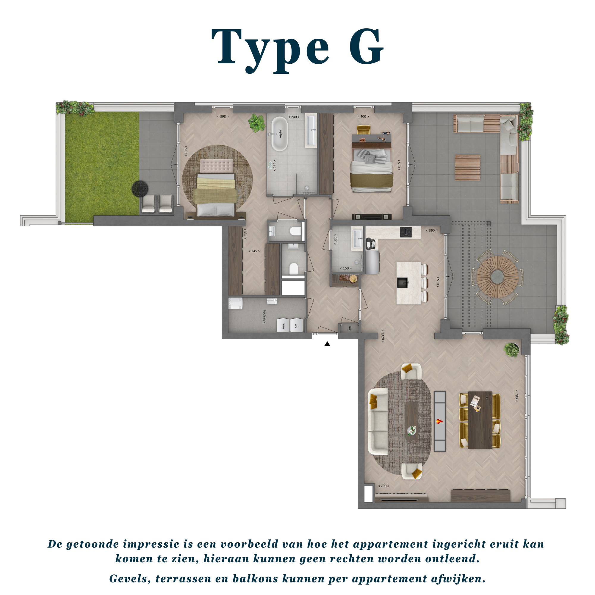 Penthouse Type G is met zijn circa 165m2 het grootste appartement van Elenore en kenmerkt zich door de royale leefruimte. Deze woning op de 5e etage beschikt over twee slaapkamers, twee badkamers en maar liefst twee ruime terrassen met op de boomtoppen van het landgoed. Dankzij de hoge plafonds is er veel lichtinval, terwijl de vele raampartijen een vrij uitzicht over de boomtoppen garandeert.