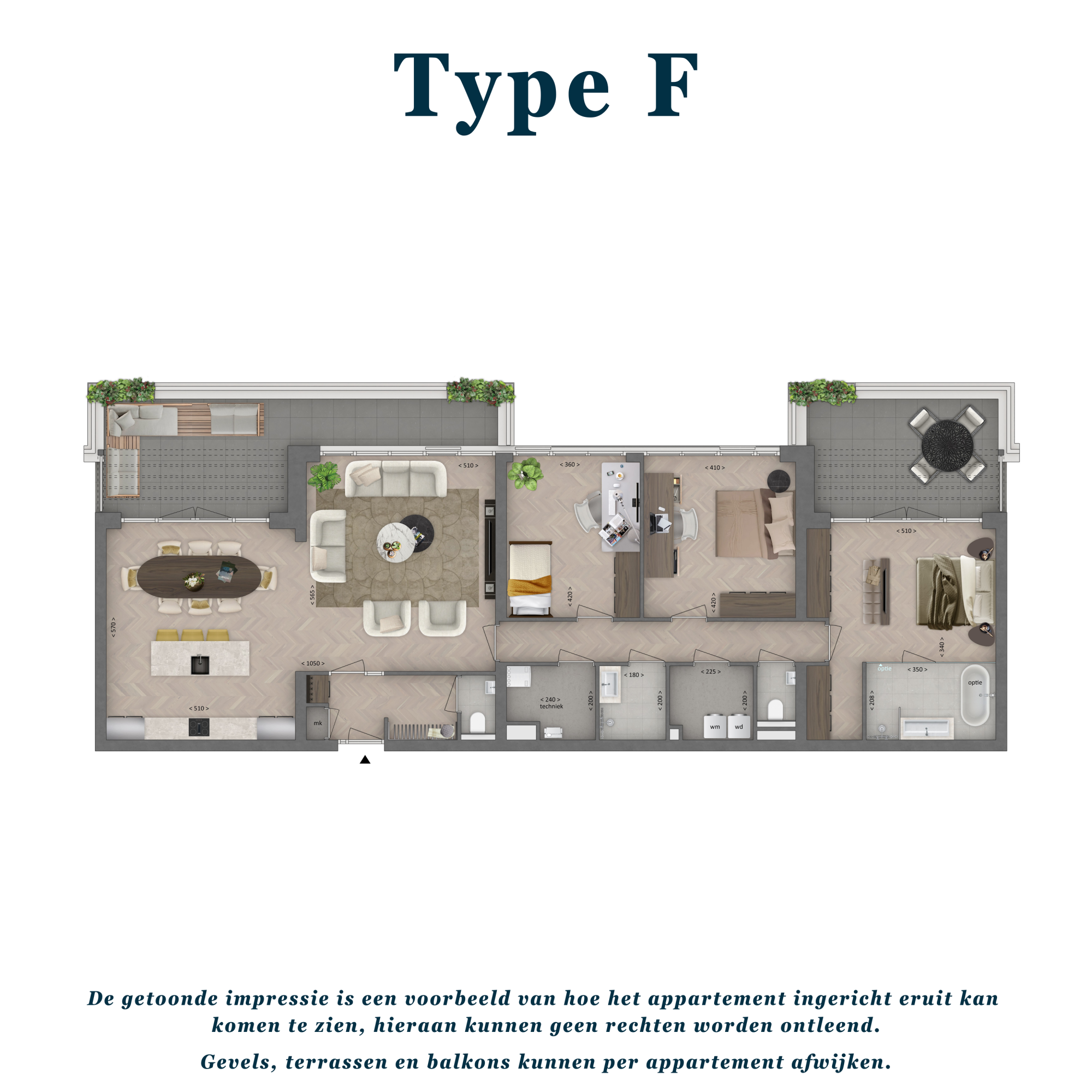 Penthouse Type F is een luxe appartement op de 5e etage en beschikt over drie slaapkamers, twee badkamers en twee ruime buitenruimtes met uitzicht over de binnentuin en de boomtoppen van het landgoed.