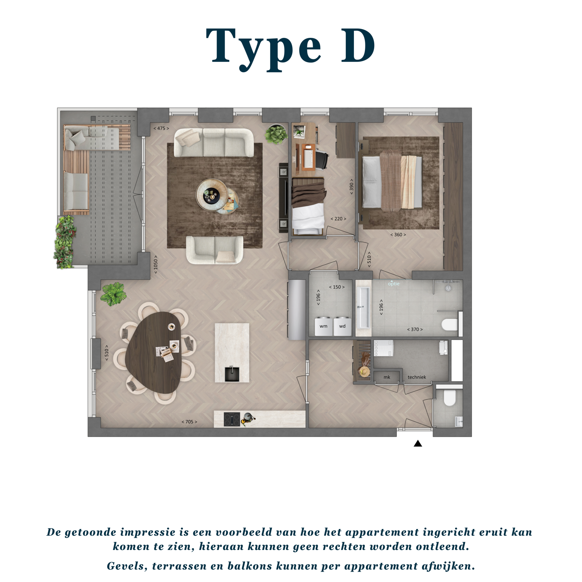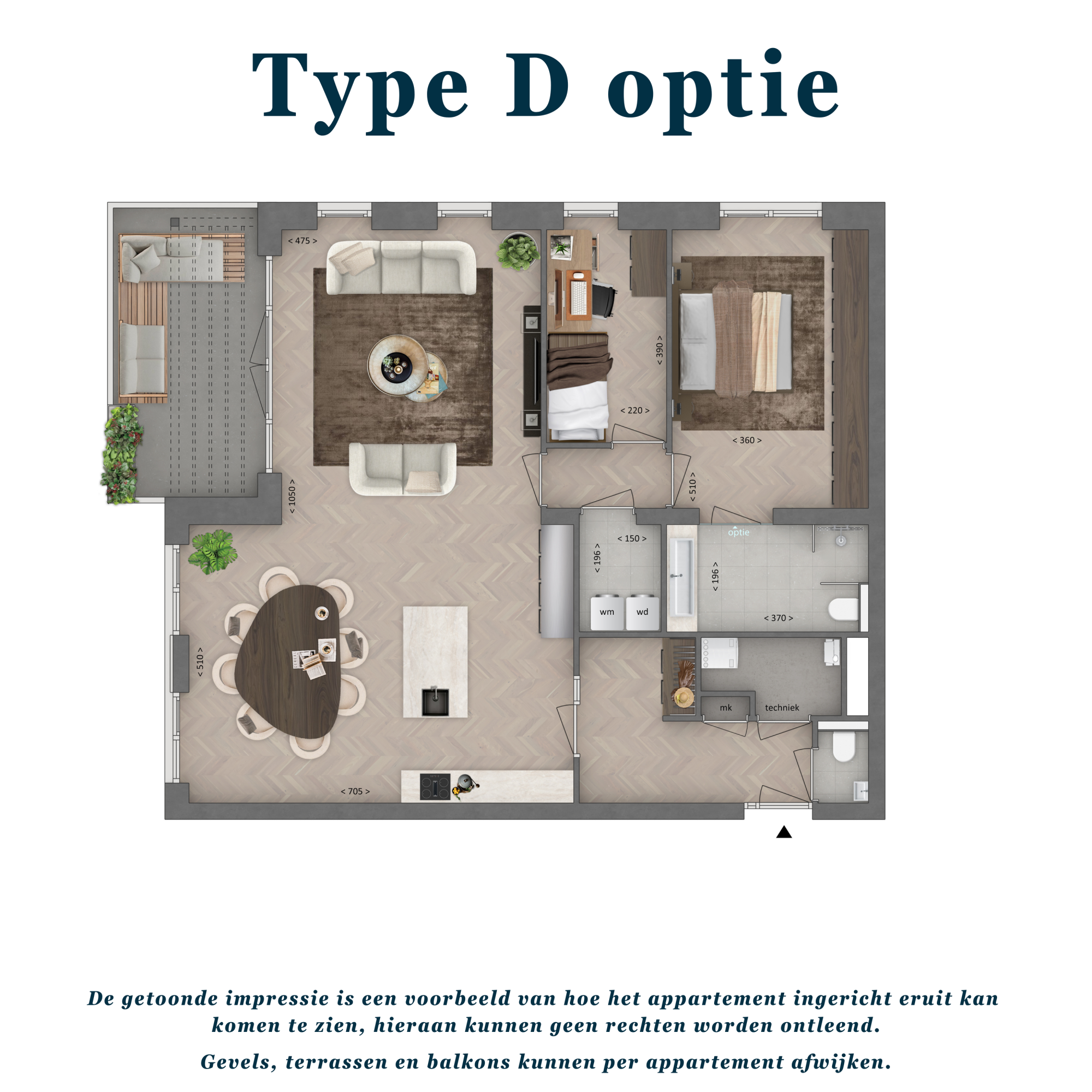 Wie zijn oog laat vallen op één van de prachtige hoekappartementen Type D, kan zelfs kiezen uit twee varianten. Waar ga jij voor? Laat je de royale ontvangsthal en de keuken de eyecatcher zijn, of kies je voor een indeling die juist zorgt voor verbinding tussen alle ruimtes?