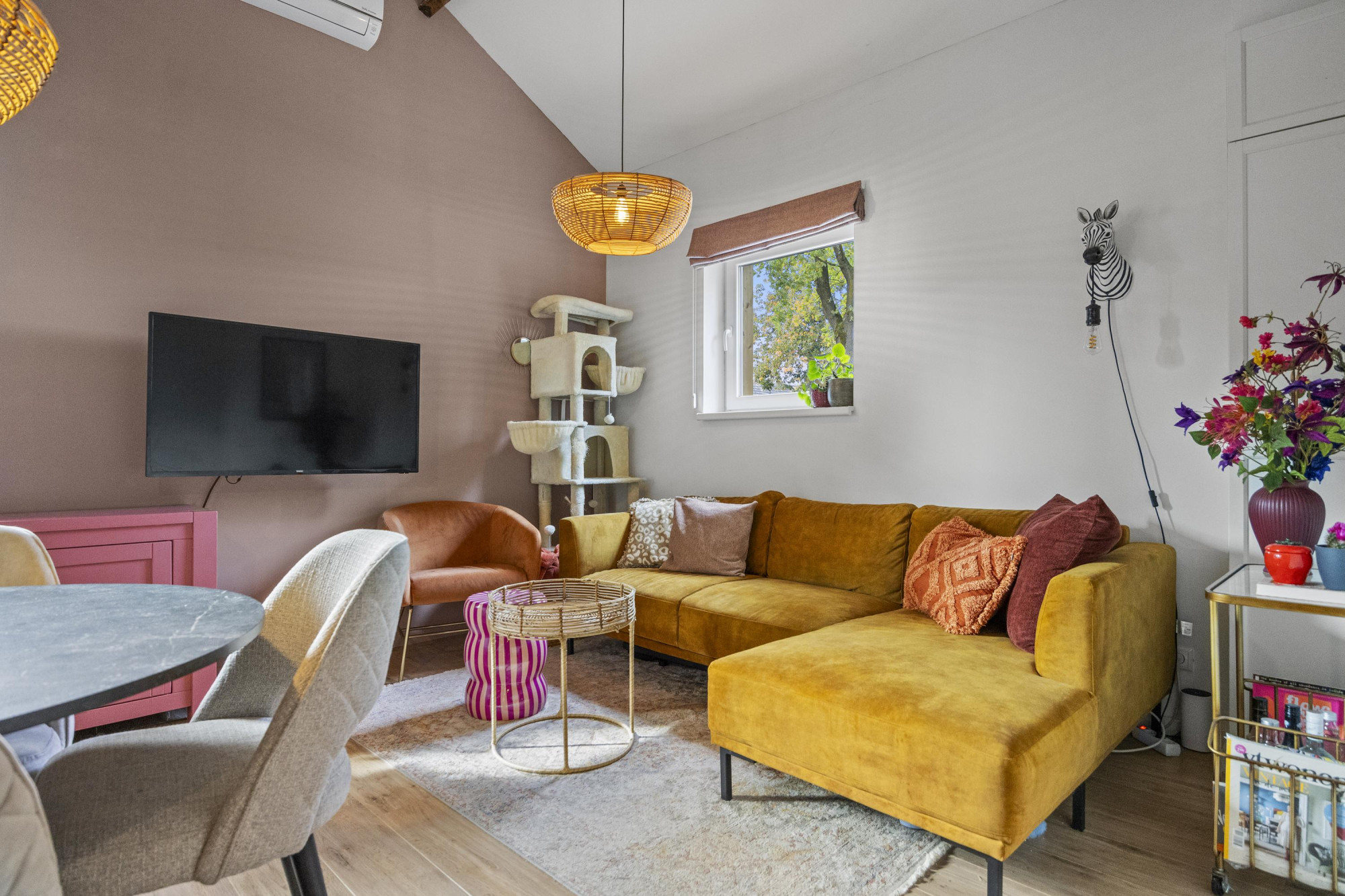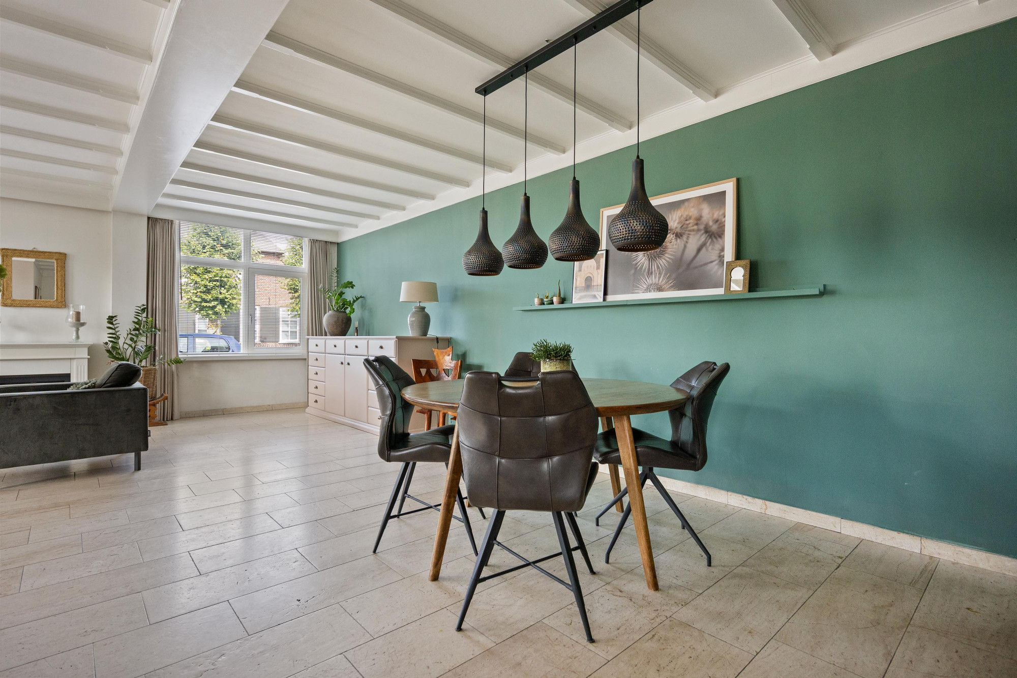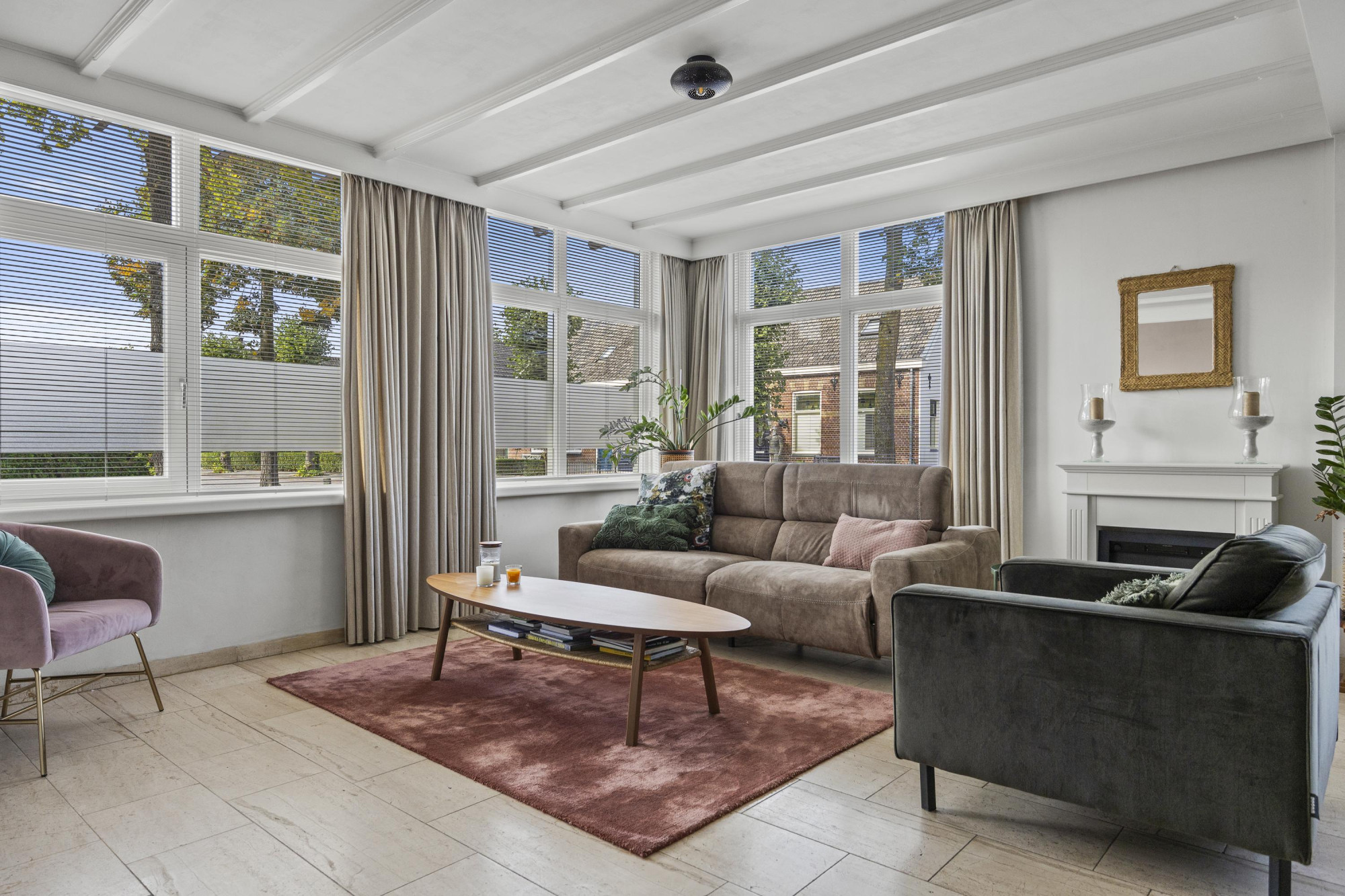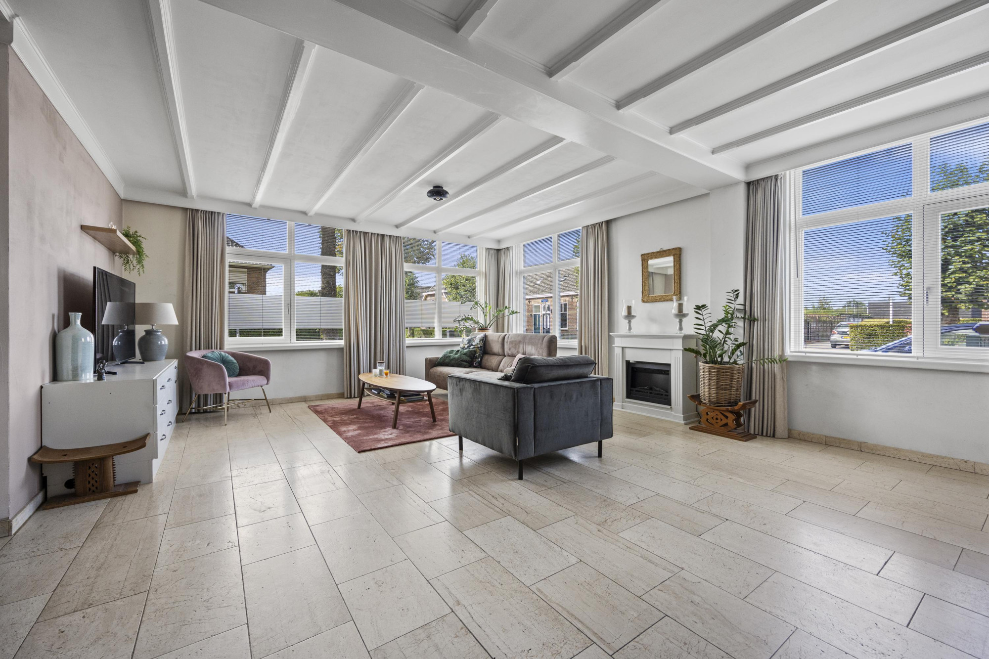 - Ruime woonkamer met open haard en sfeervol balkenplafond;