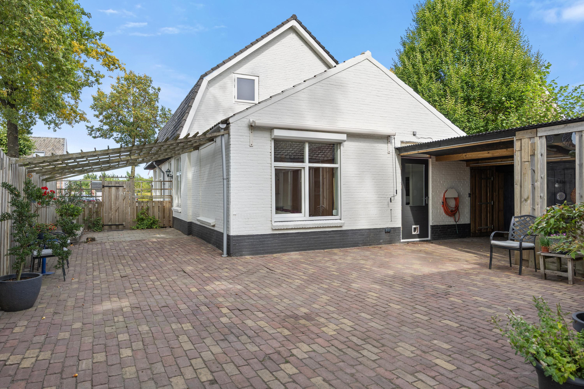 De tuin is gelegen op het zuiden en heeft een overkapping die het hele jaar door voor beschutting en gezelligheid zorgt. De achterom maakt de tuin ook functioneel en met zoveel ruimte is er altijd wel een plekje in de zon of schaduw te vinden. Daarnaast is er een sfeervolle en moderne vrijstaand bijgebouw, waar een eigen keuken, woonkamer, slaapkamer en badkamer met inloopdouche aanwezig zijn. Ideaal als gastenverblijf, voor een oudere thuiswonende of juist voor werken aan huis.