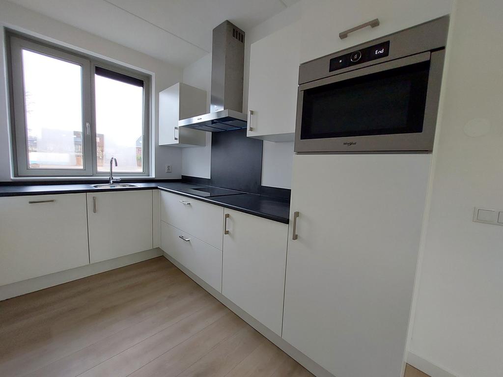 De ruime woonkamer ligt aan de achterzijde en is voorzien van een laminaatvloer. Vanuit hier kijk je mooi uit over de ruime achtertuin. De achtertuin is voorzien van omheining, een terras en houten berging. Aan de voorzijde ligt de keuken. De moderne keuken met een hoekopstelling en een neutrale kleurstelling is compleet uitgerust met inbouwapparatuur.
