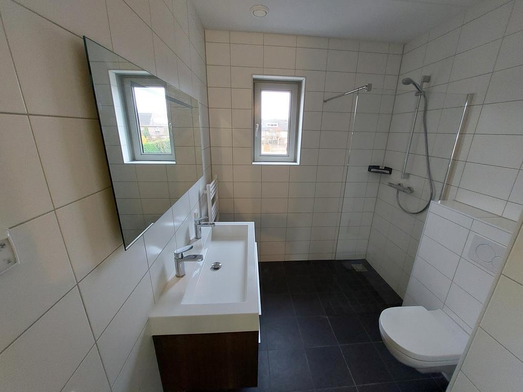 Op de 1e verdieping bevinden zich 2 slaapkamers en de badkamer. De badkamer is voorzien van een inloopdouche, een wastafel en toilet. De badkamer is voorzien van tegelwerk.