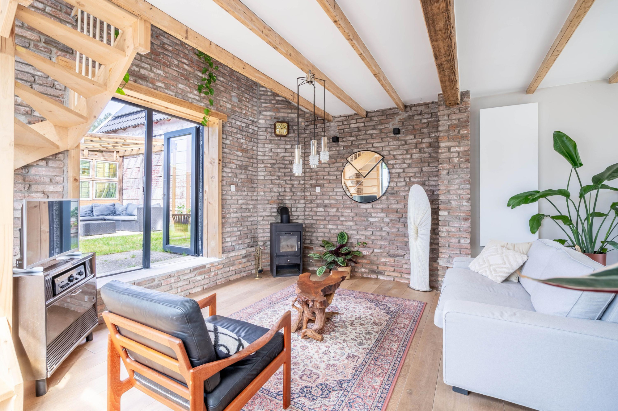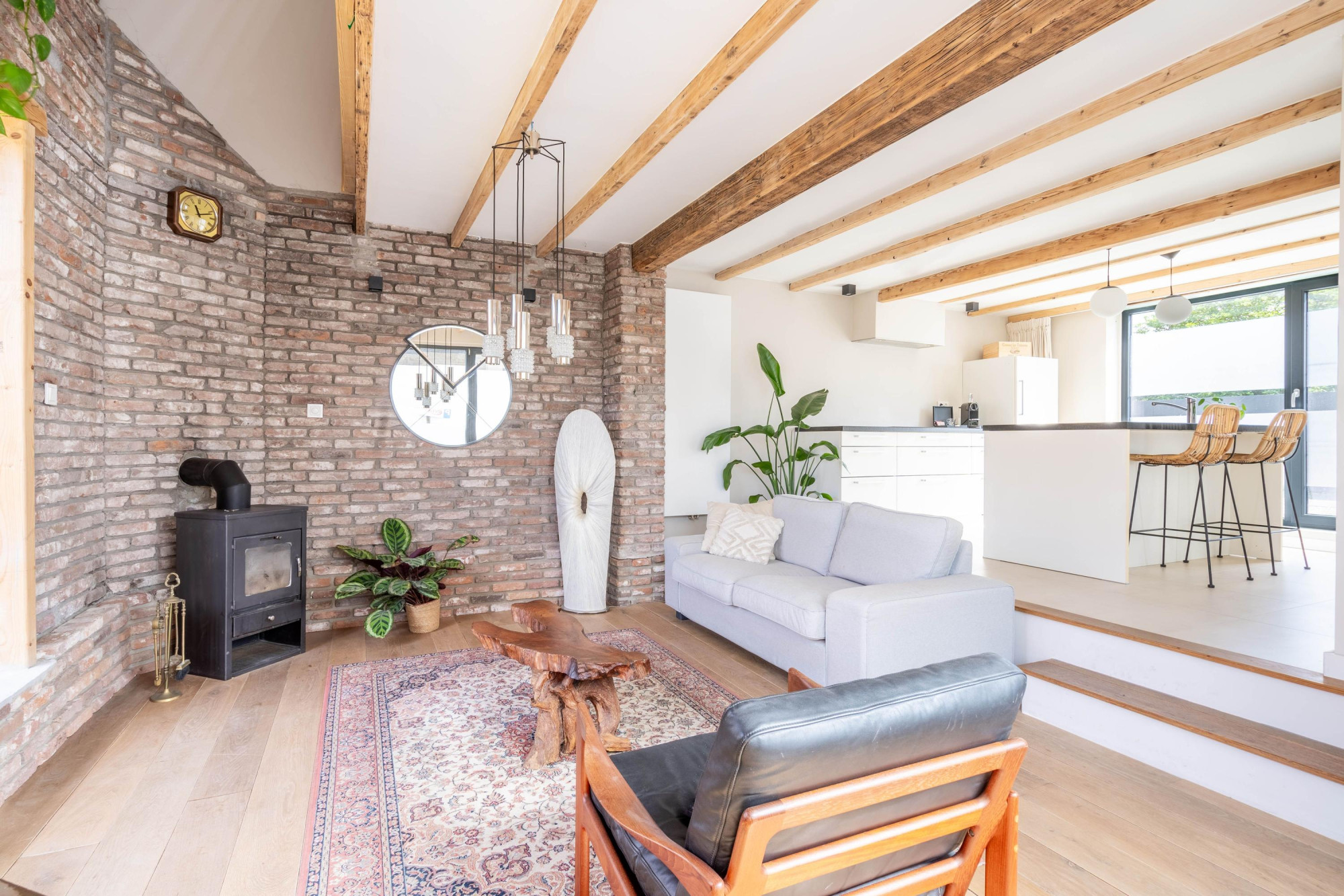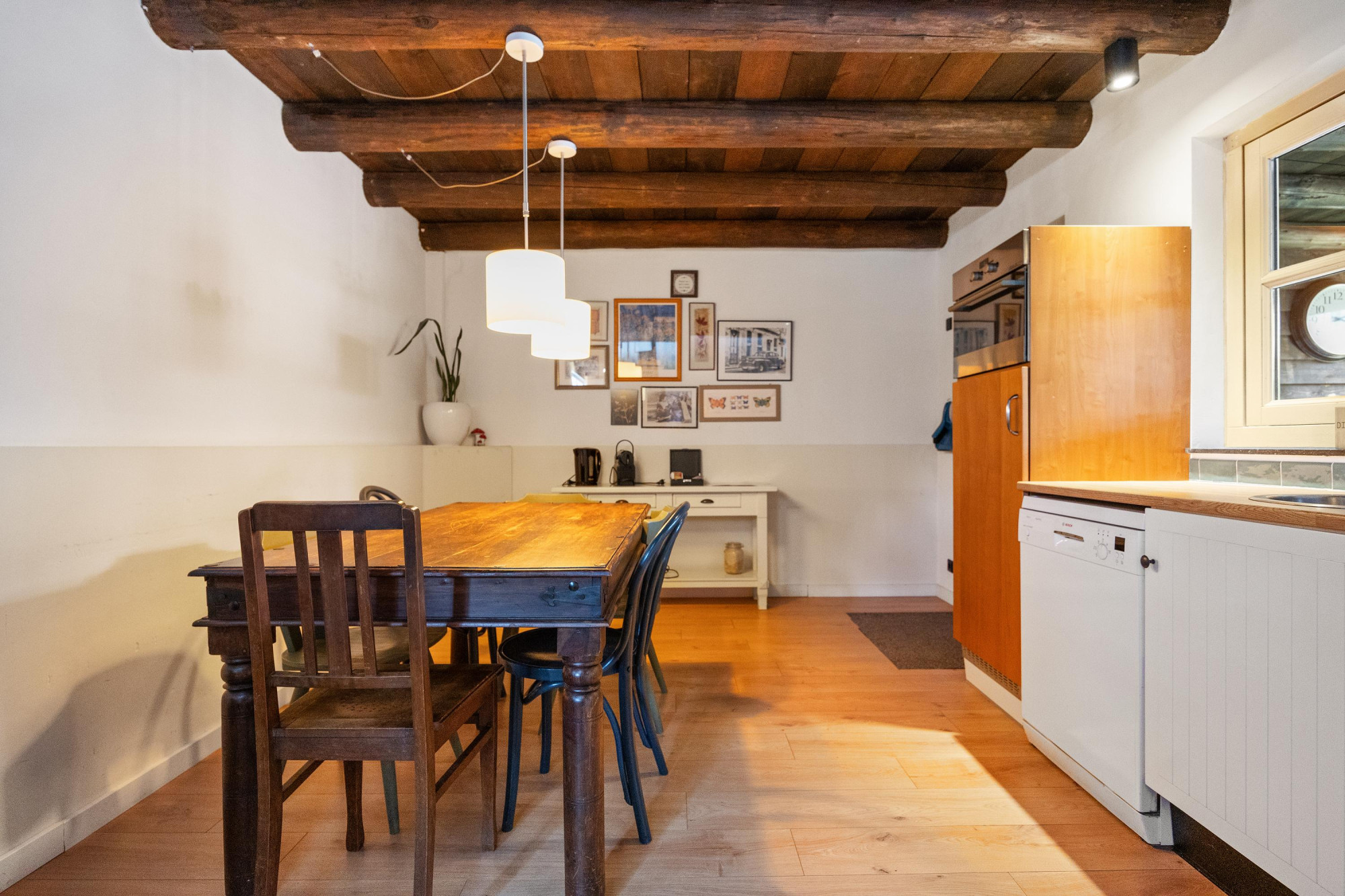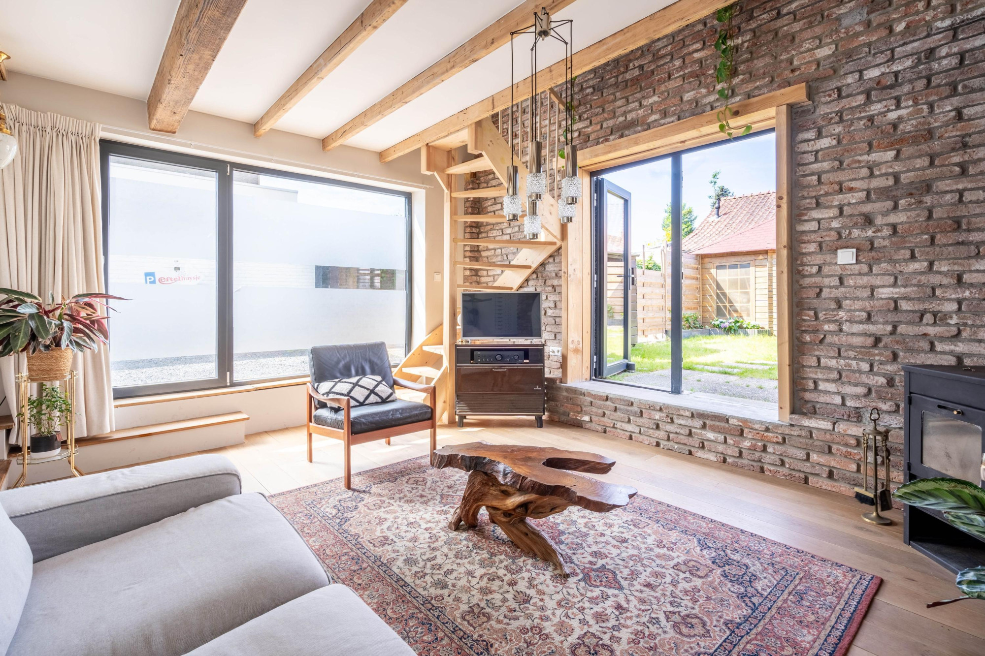 - Sfeervol houten balkenplafond en dubbele deuren naar de tuin;