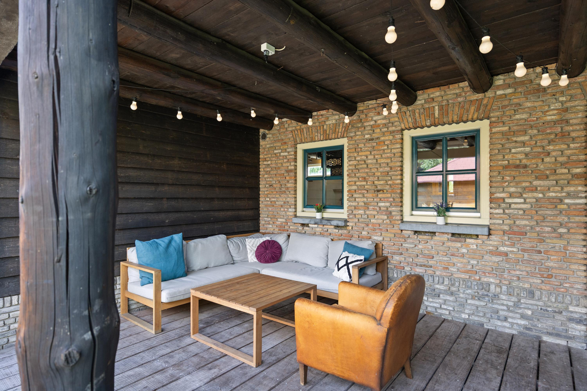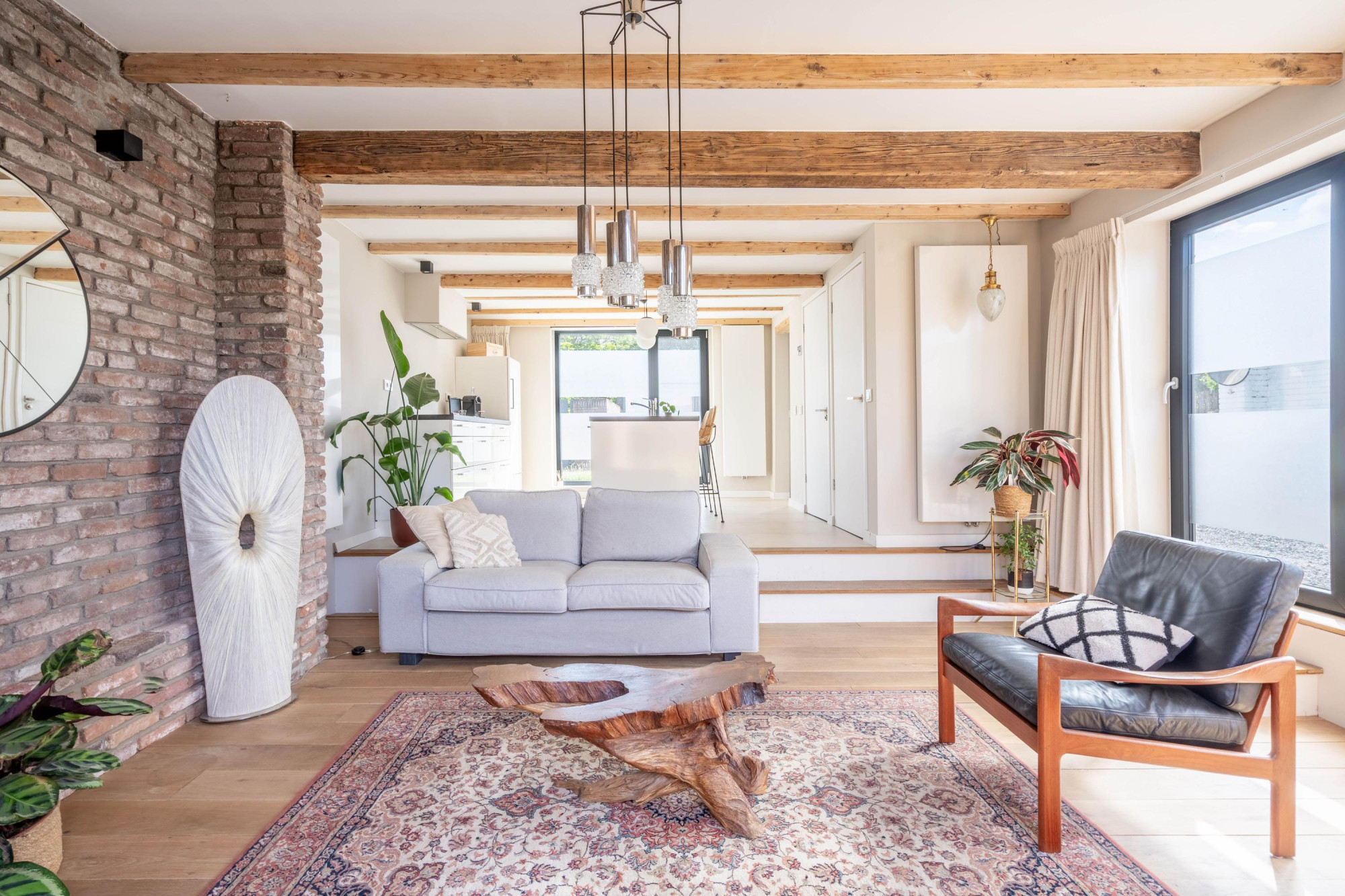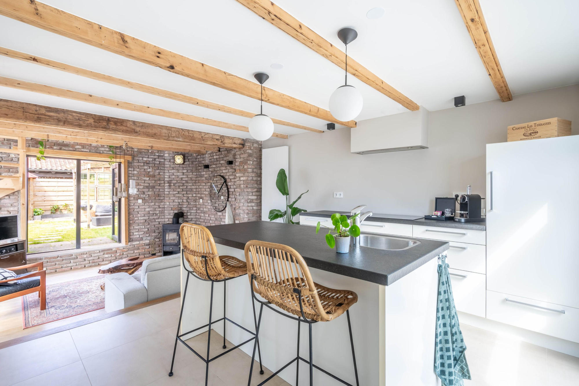 - Sfeervol houten balkenplafond en dubbele deuren naar de tuin;