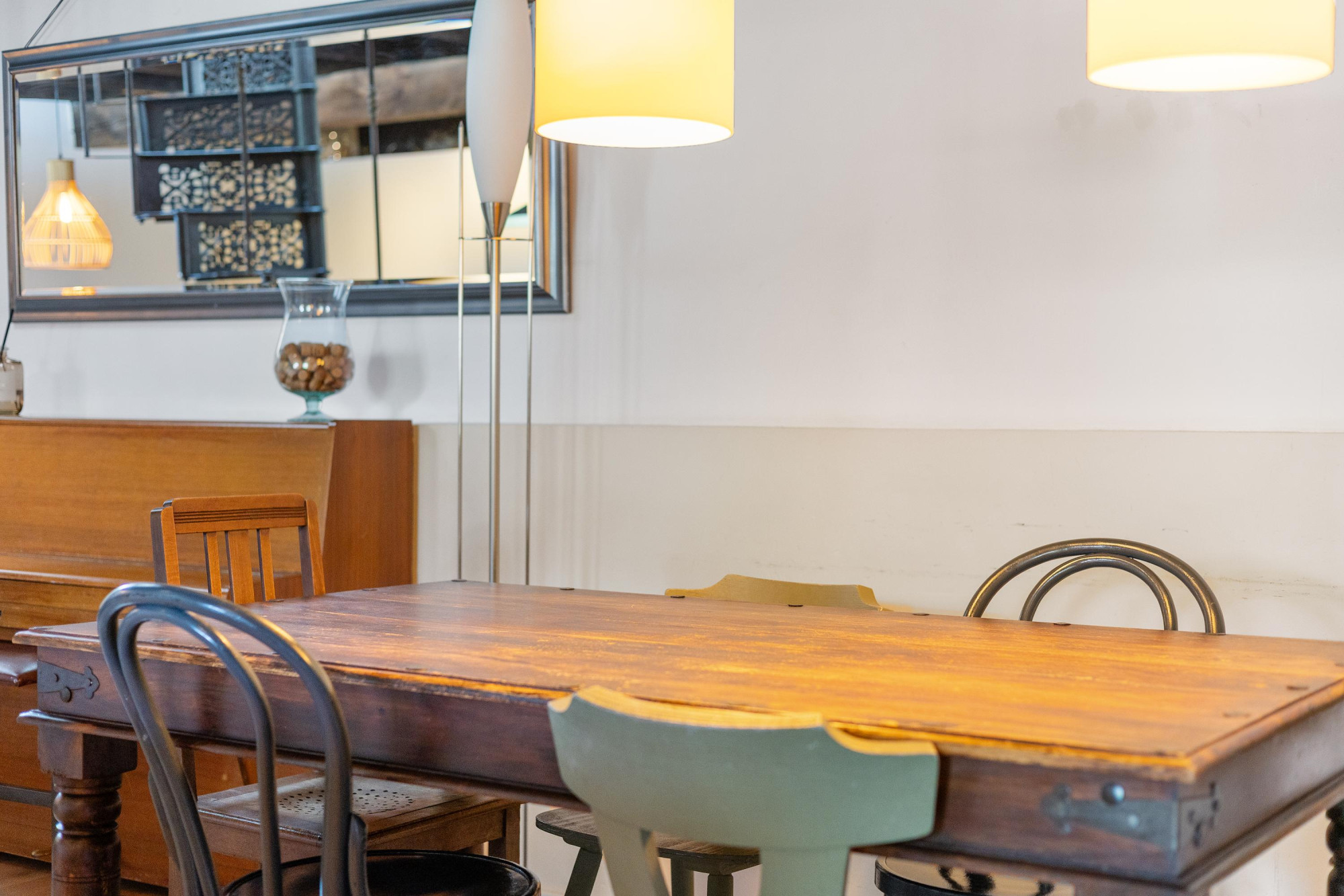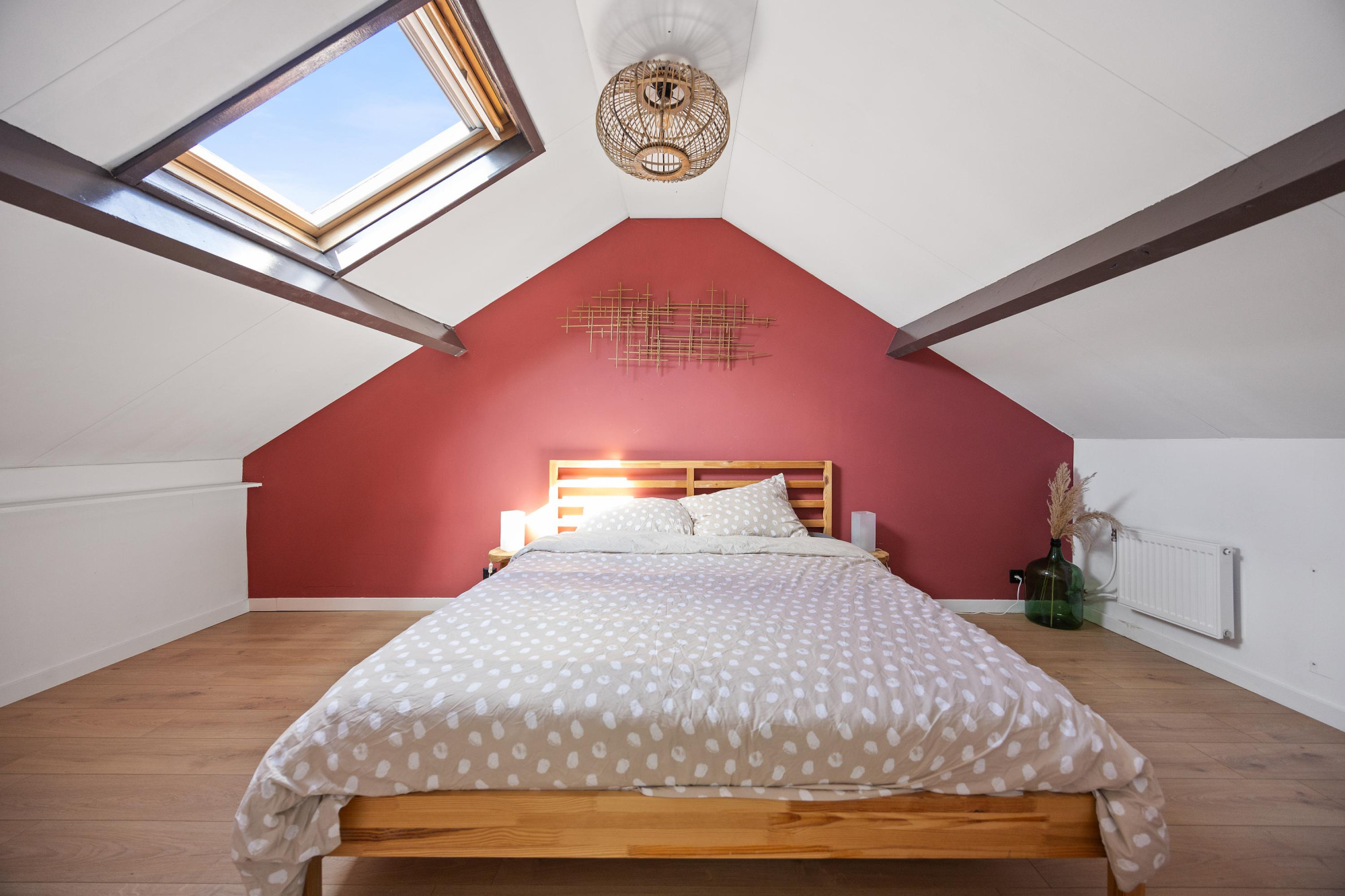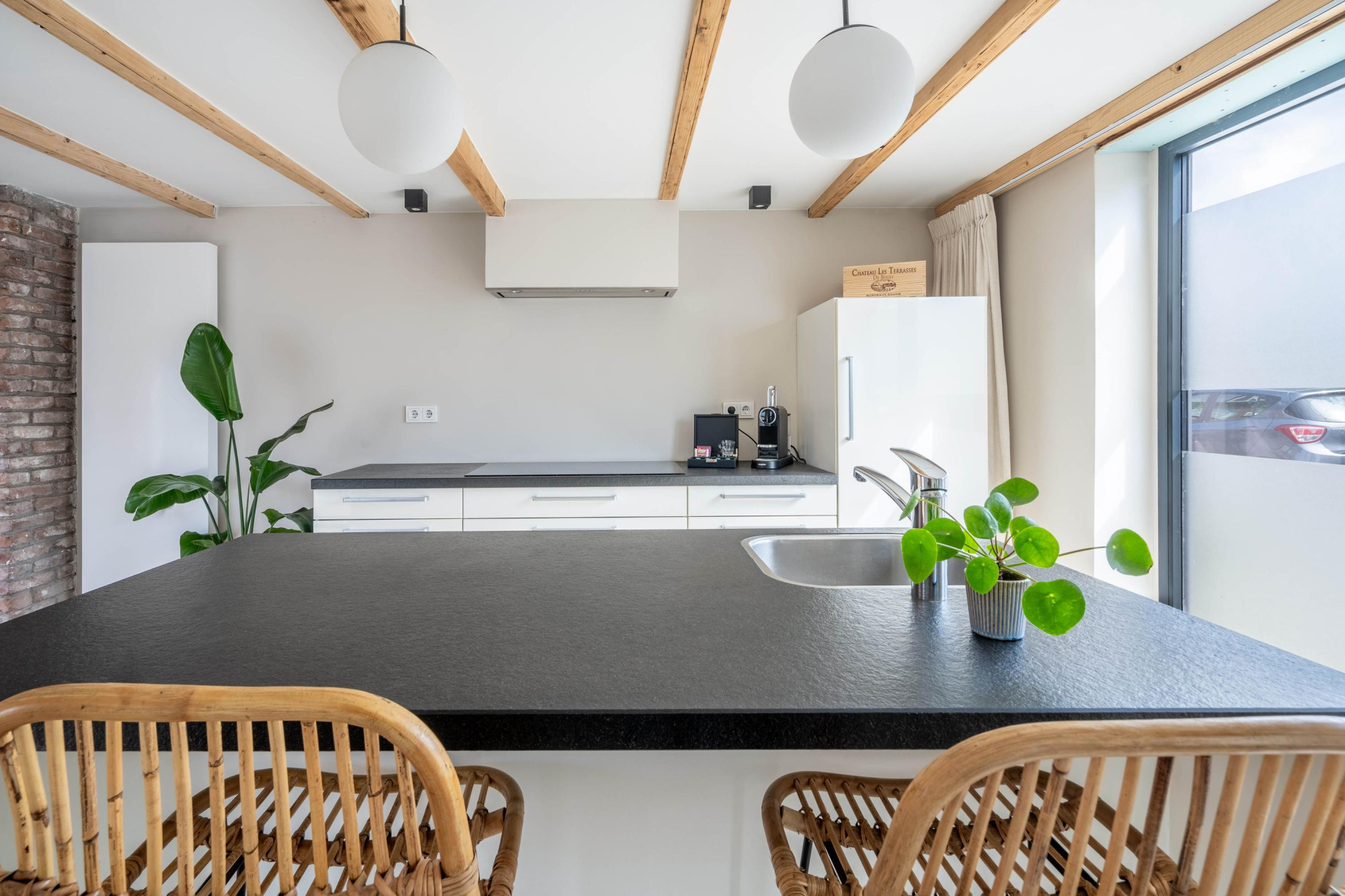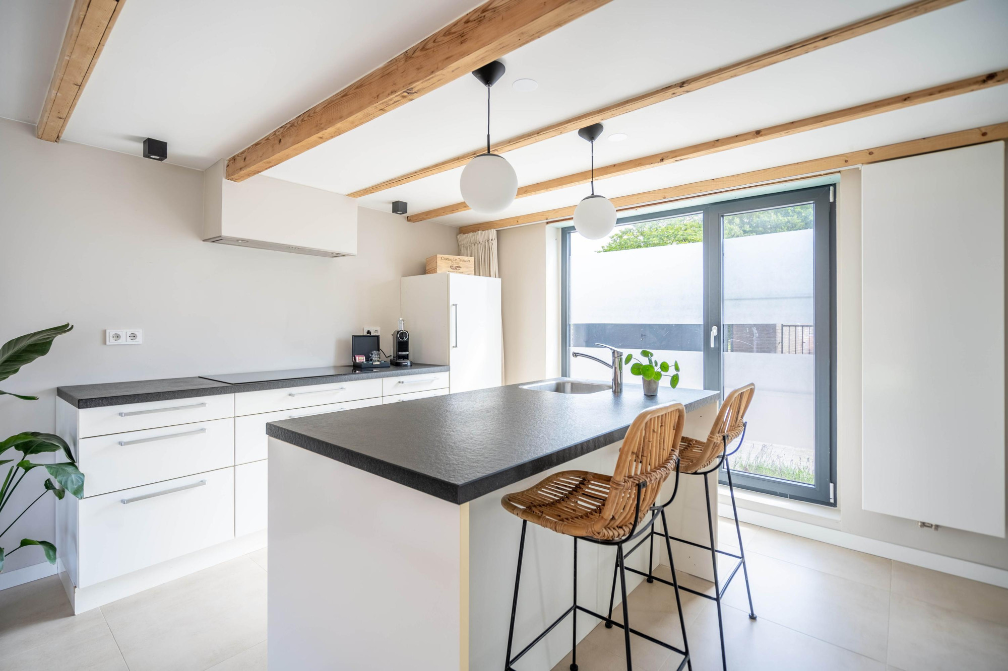 - Sfeervol houten balkenplafond en dubbele deuren naar de tuin;