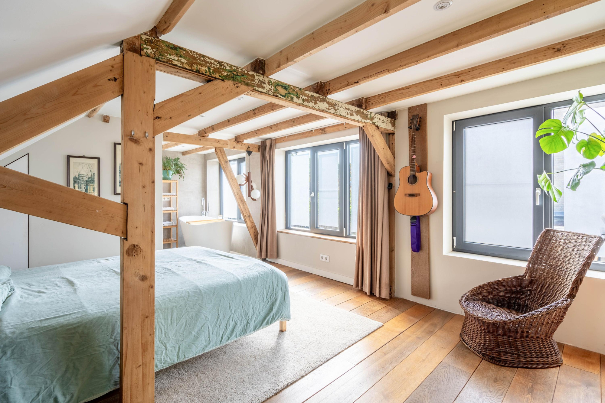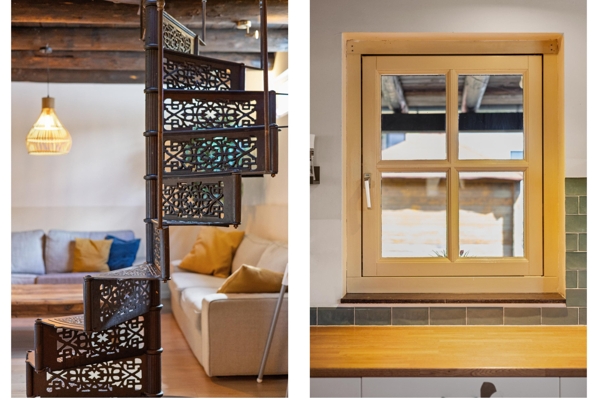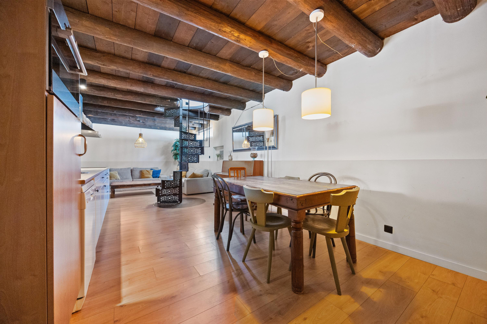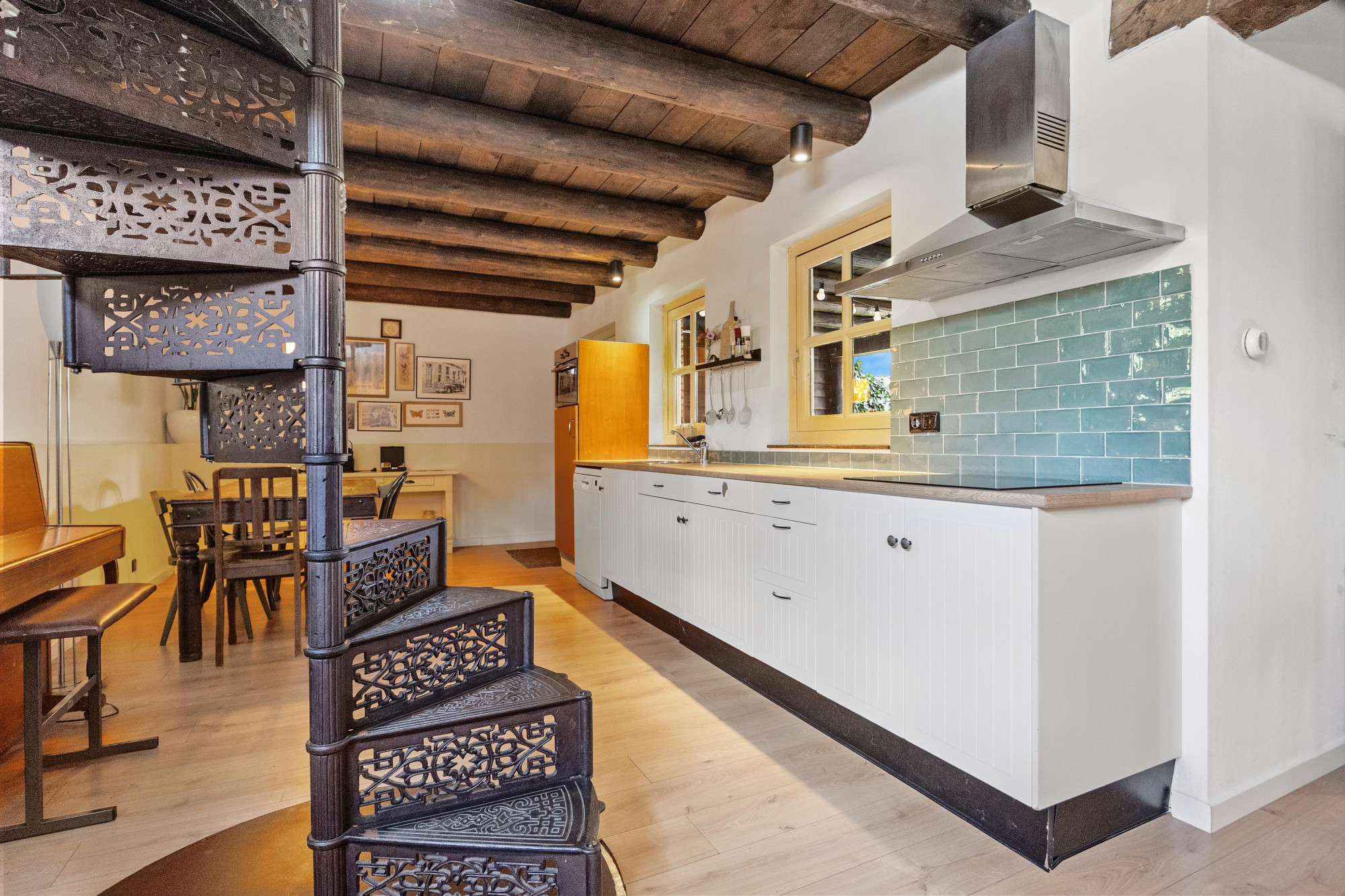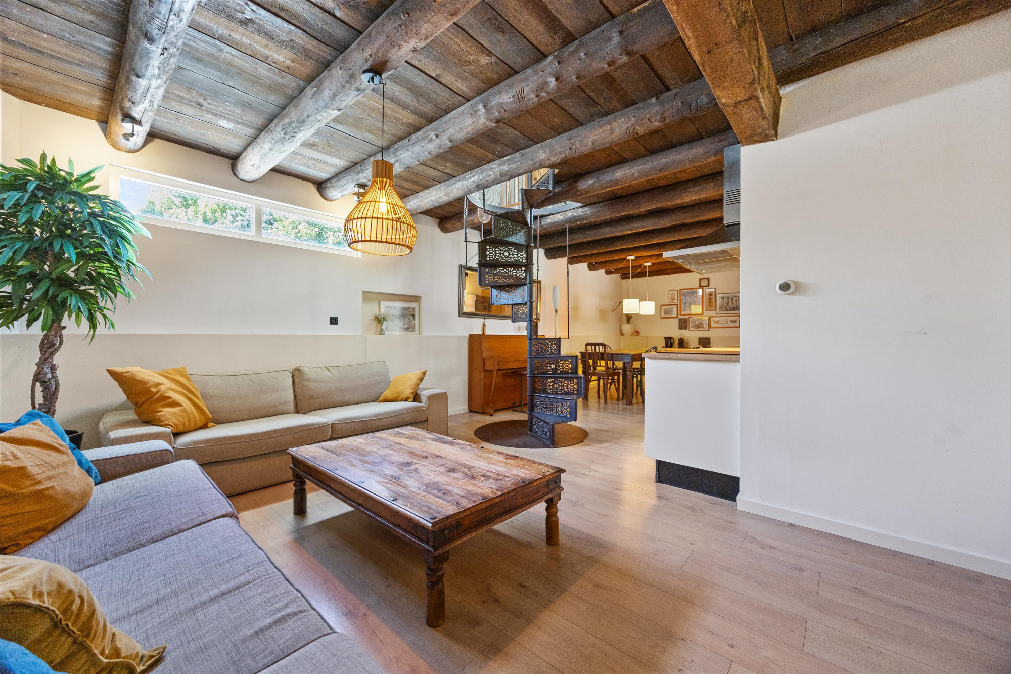 - Sfeervol houten balkenplafond en gietijzeren trap;