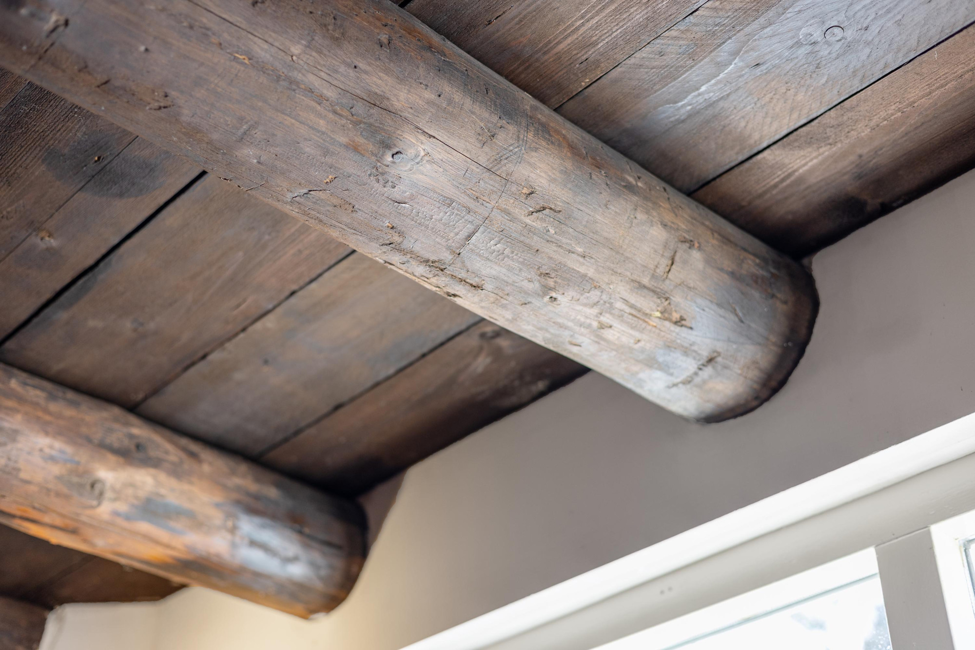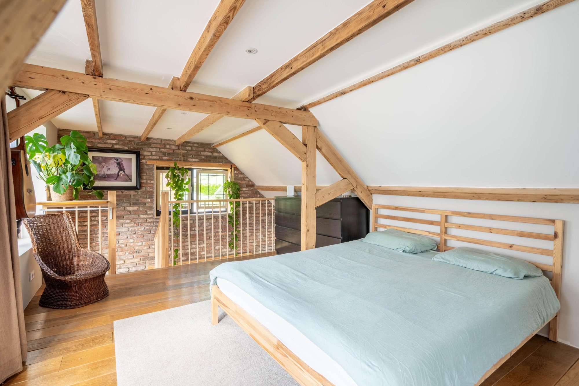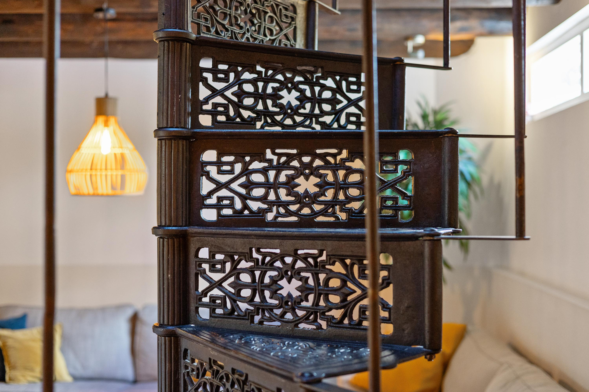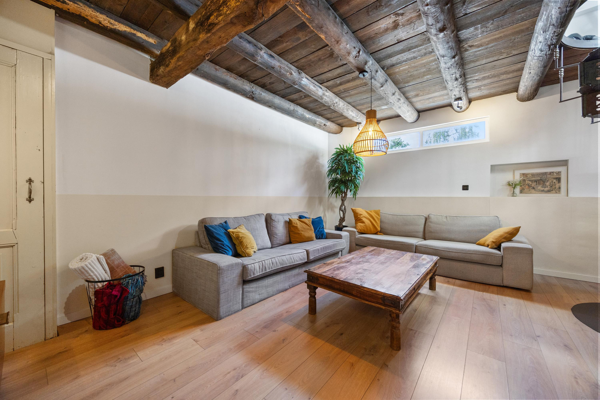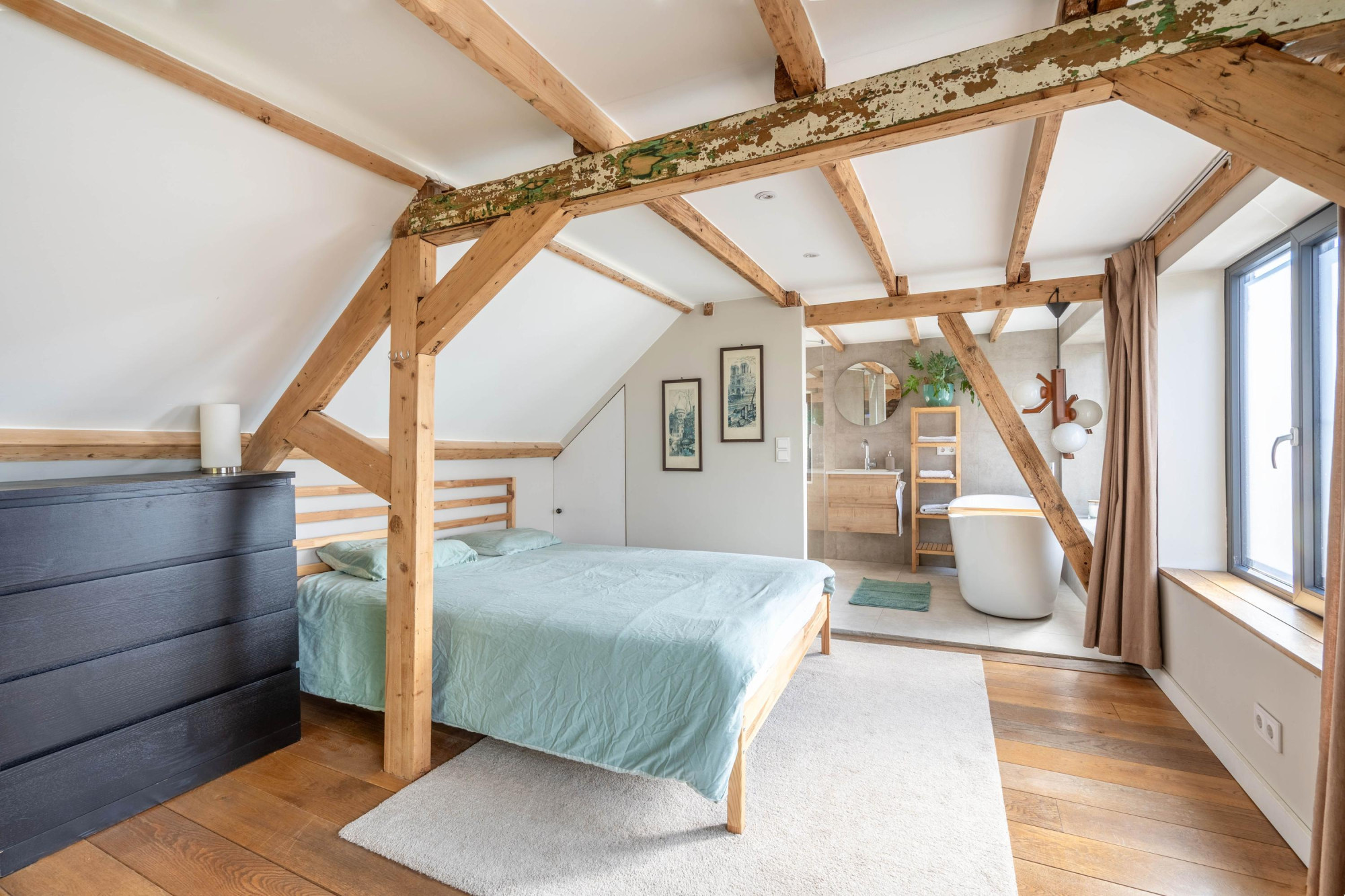 - Sfeervol houten balkenplafond en gietijzeren trap;