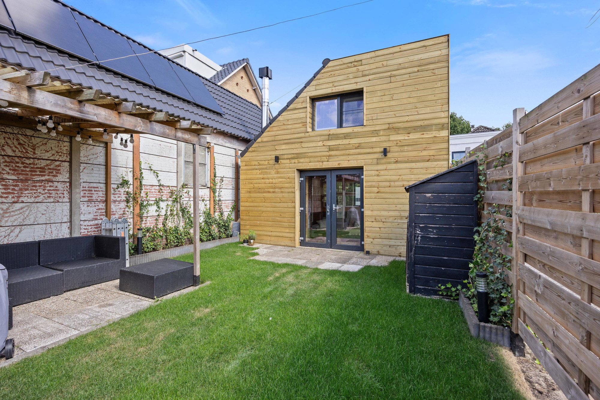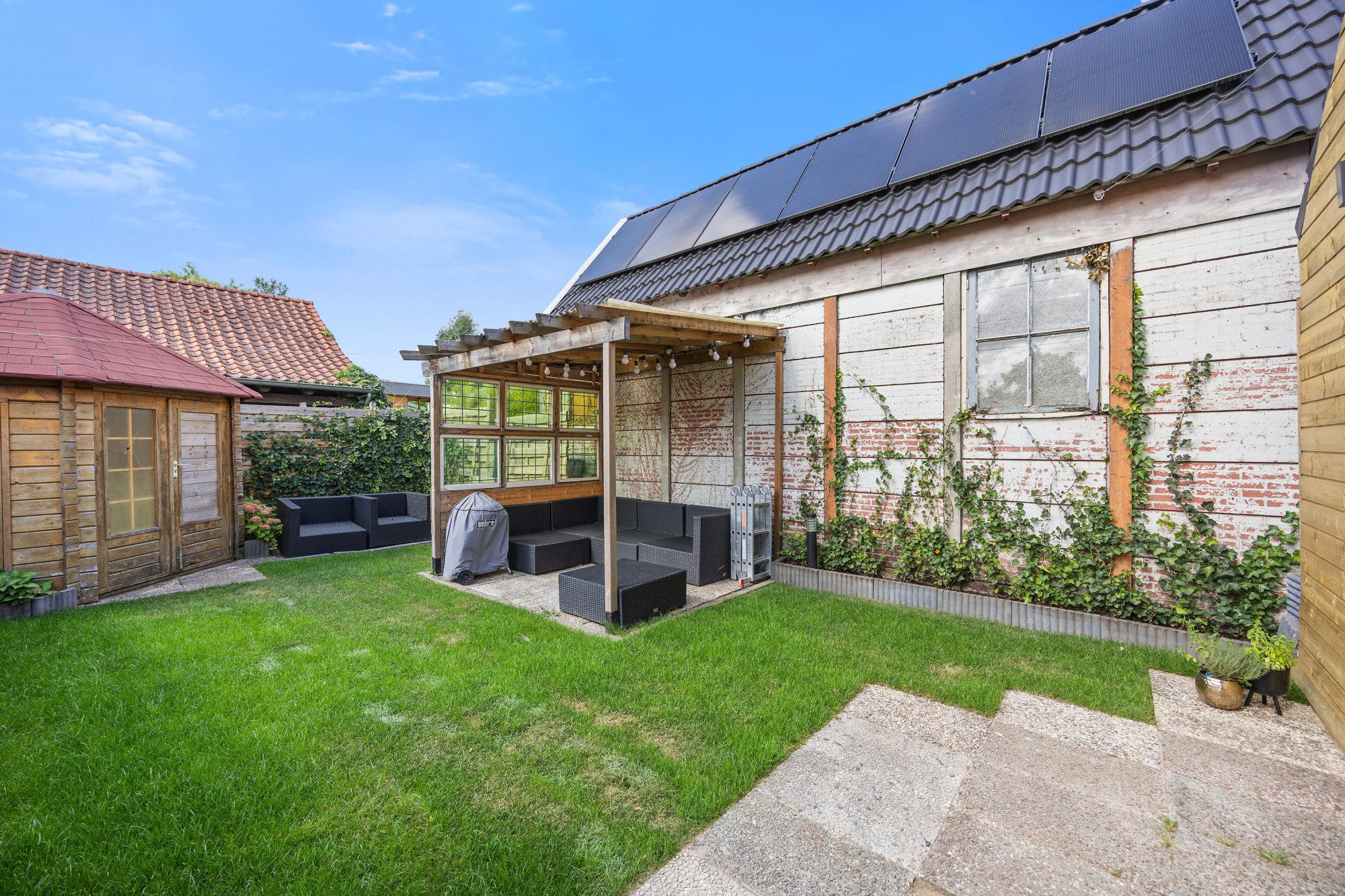 - Tuin op het westen met achterom en overkapping;
