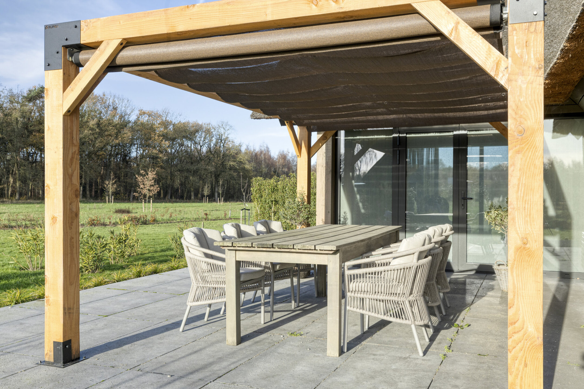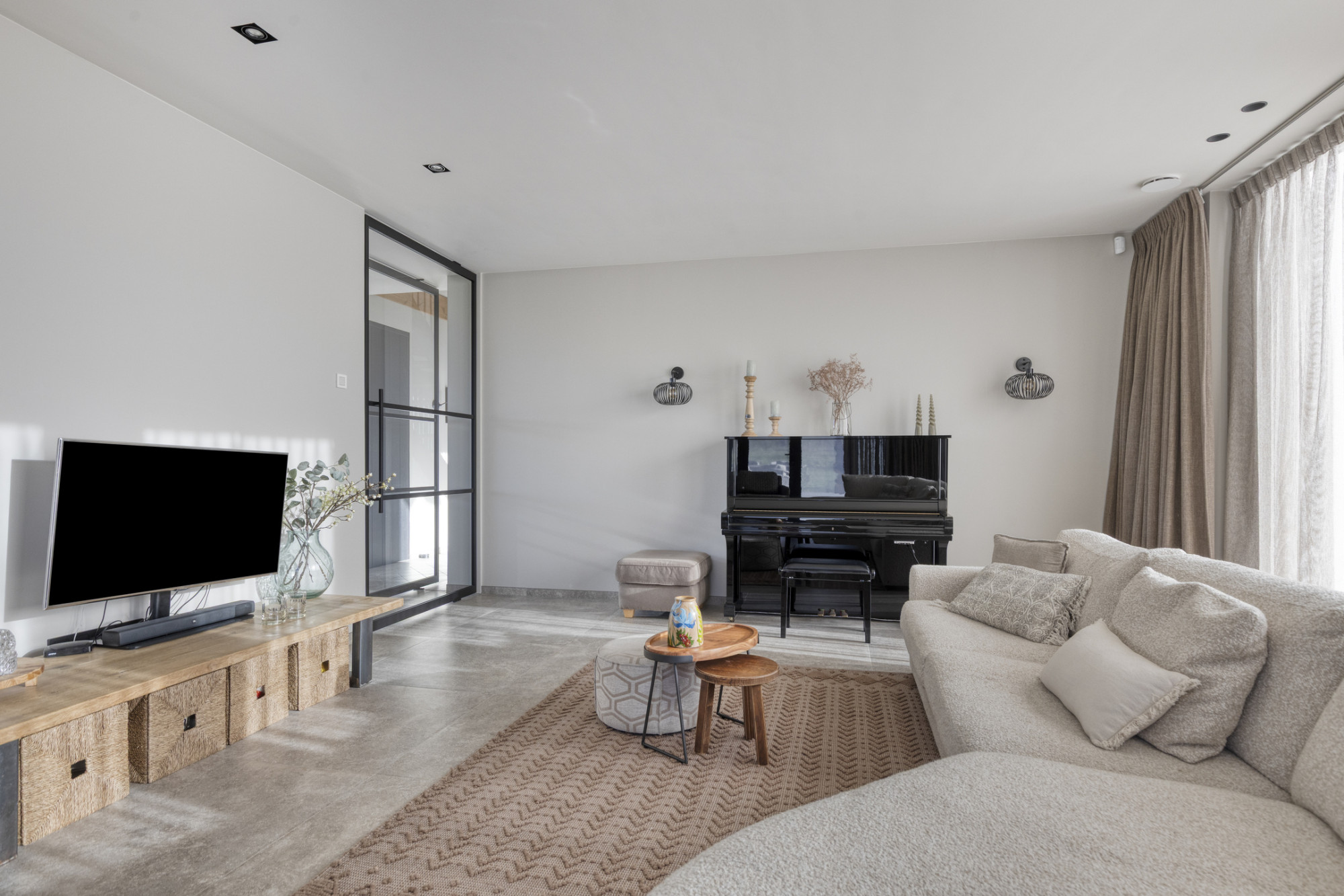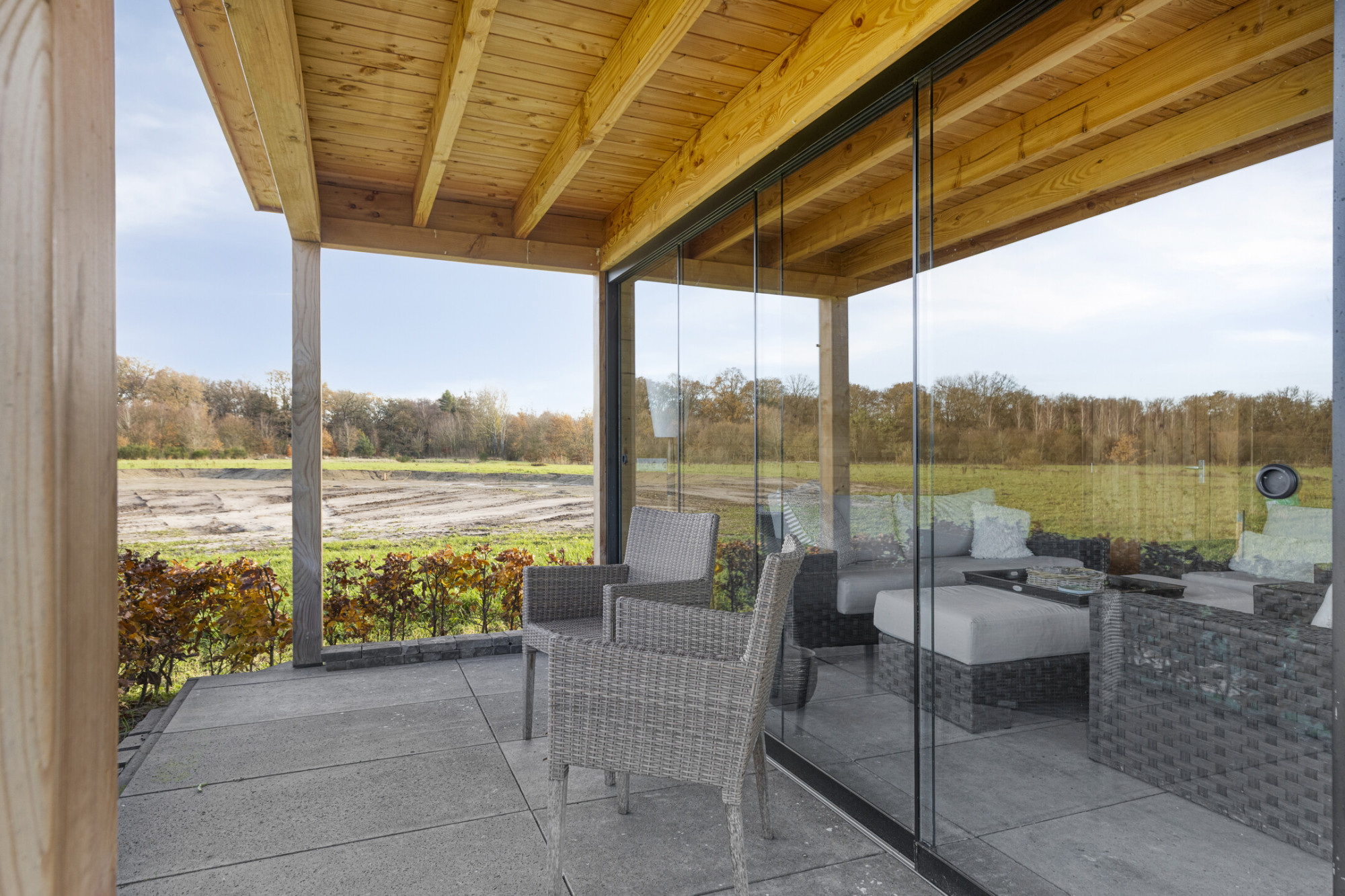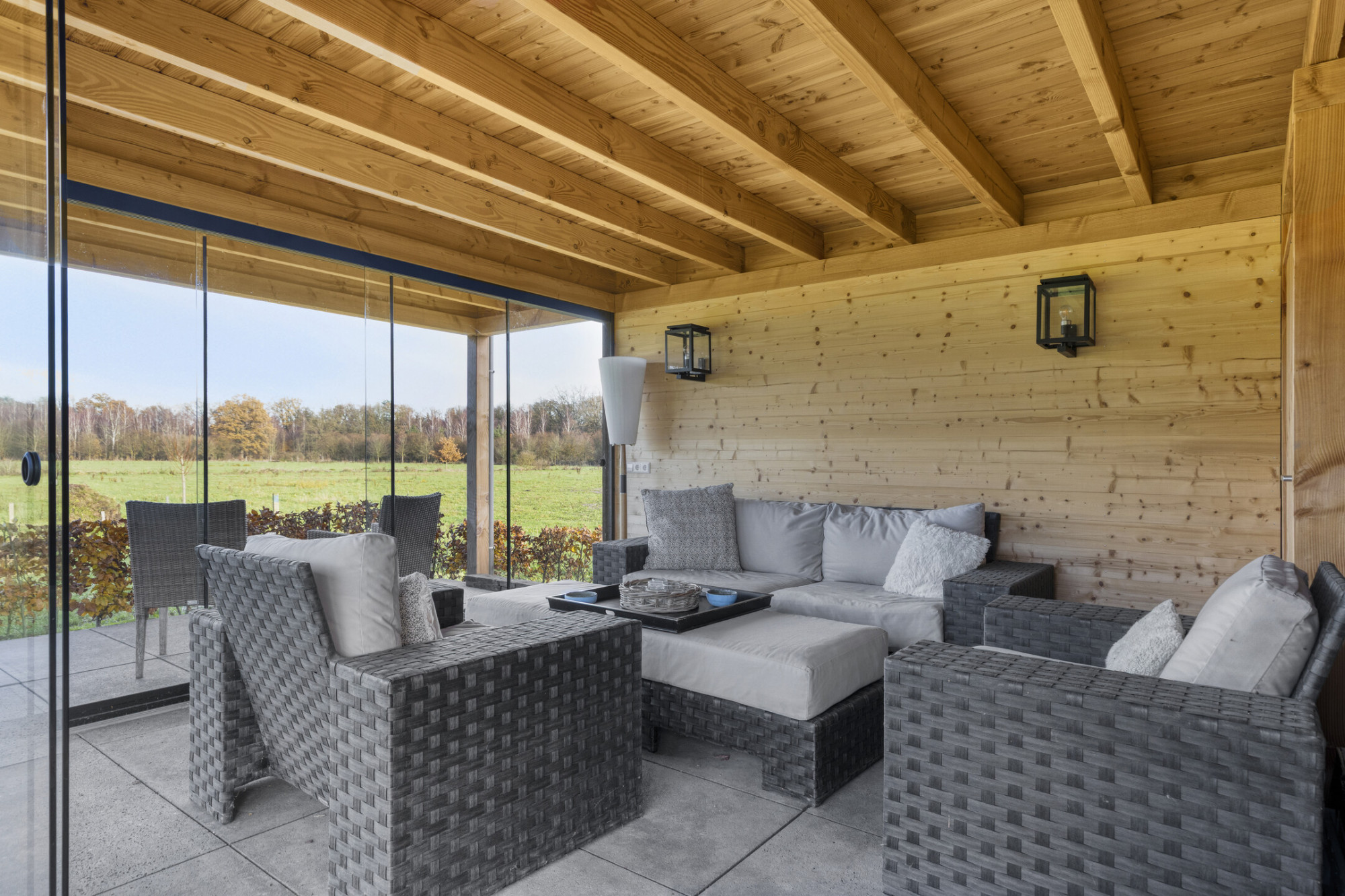 In de tuinkamer kun je heerlijk ontspannen met een goed boek of een heerlijk glas wijn. Geniet van het zonnetje wat naar binnen schijnt en neem alles in je op. Of kom samen in de woonkamer, waar je in een handomdraai een knusse sfeer creëert, dankzij de glazen draaideuren. Vanuit hier loop je zo de zijkant van de tuin in, waar je een fijne overkapping vindt. De warme en rustige tinten, de houten balken en de grote ramen zorgen ervoor de het huis en de groene omgeving één worden.