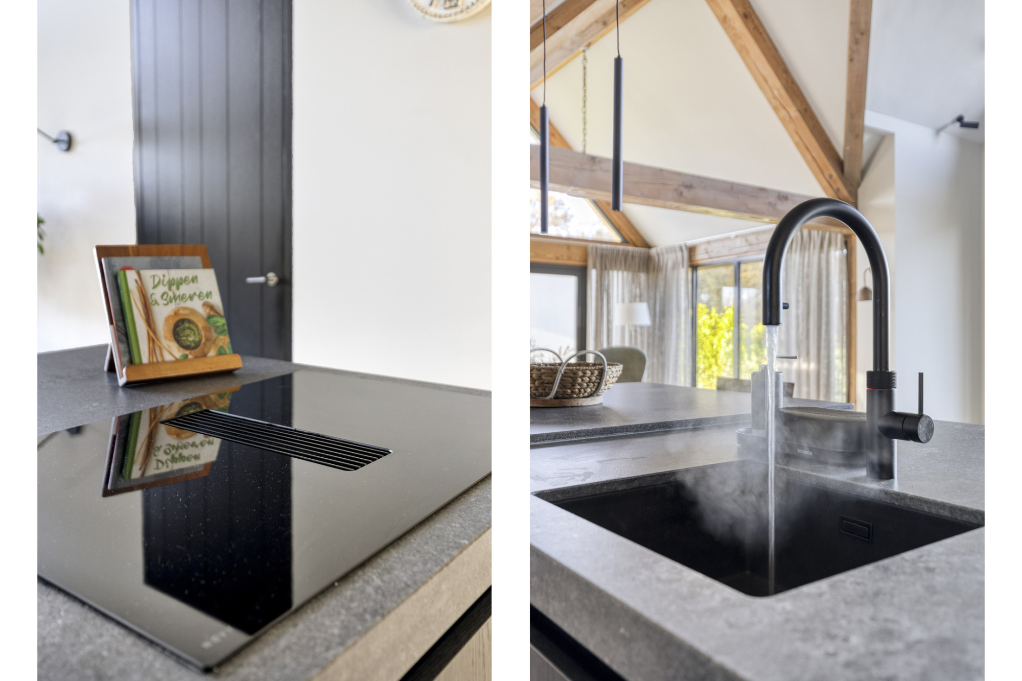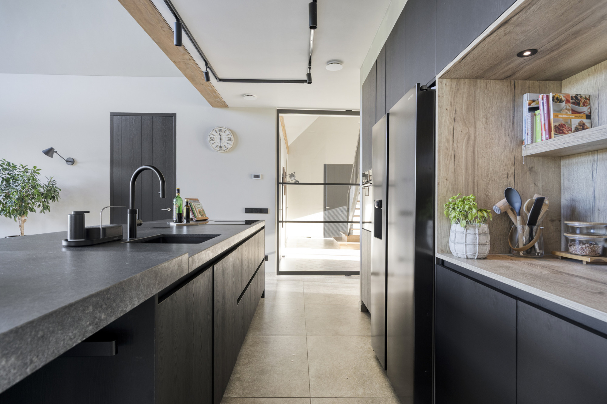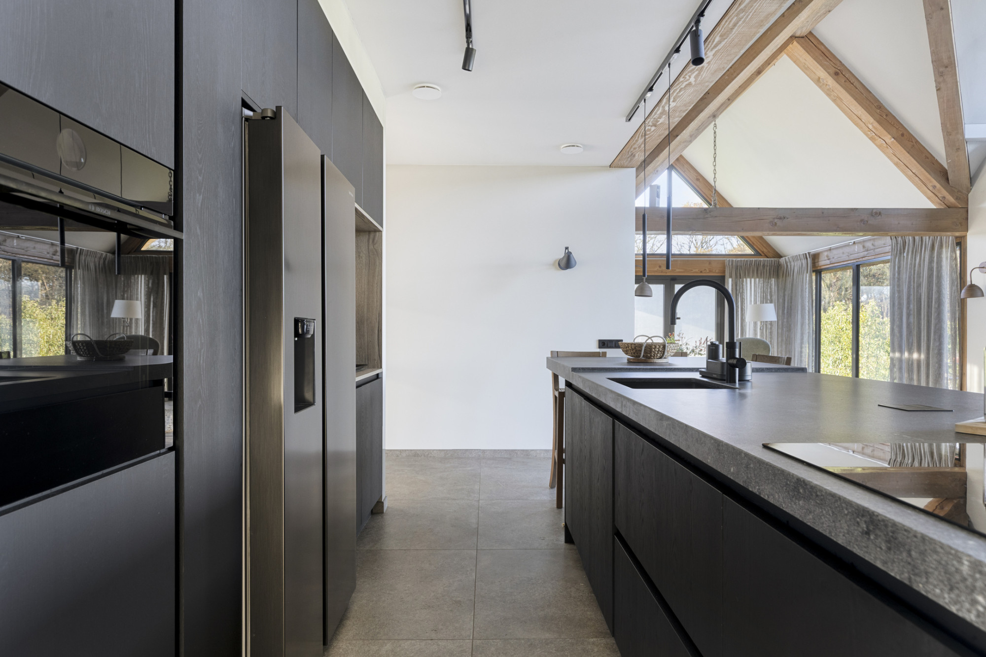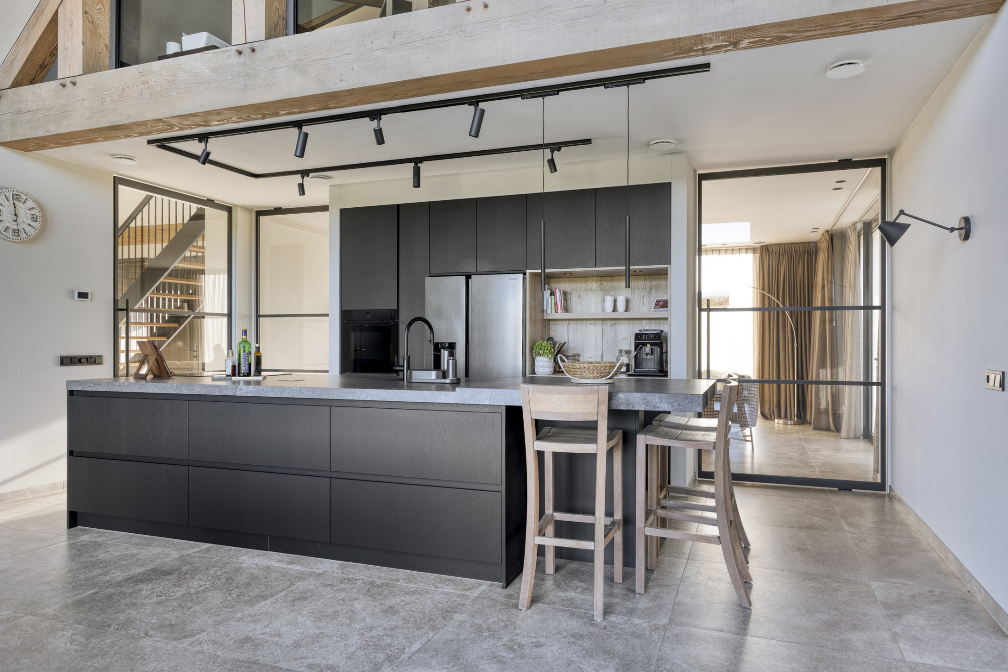 Binnen gaat het verder. Bij binnenkomst vallen het licht en de hoge plafonds direct op. Je loopt zo de luxe keuken tegemoet, waar je over alles beschikt wat je maar kunt wensen. Veel kastruimte, een kookeiland en een barretje; het ontbreekt je aan niets. Terwijl jij de lekkerste maaltijden aan het bereiden bent, blijf je in contact met je gasten. Dankzij de praktische indeling en de ruimte kun je hier eenvoudig een grote eettafel plaatsen. Zet de schuifdeur open en laat buiten en binnen in elkaar overlopen.