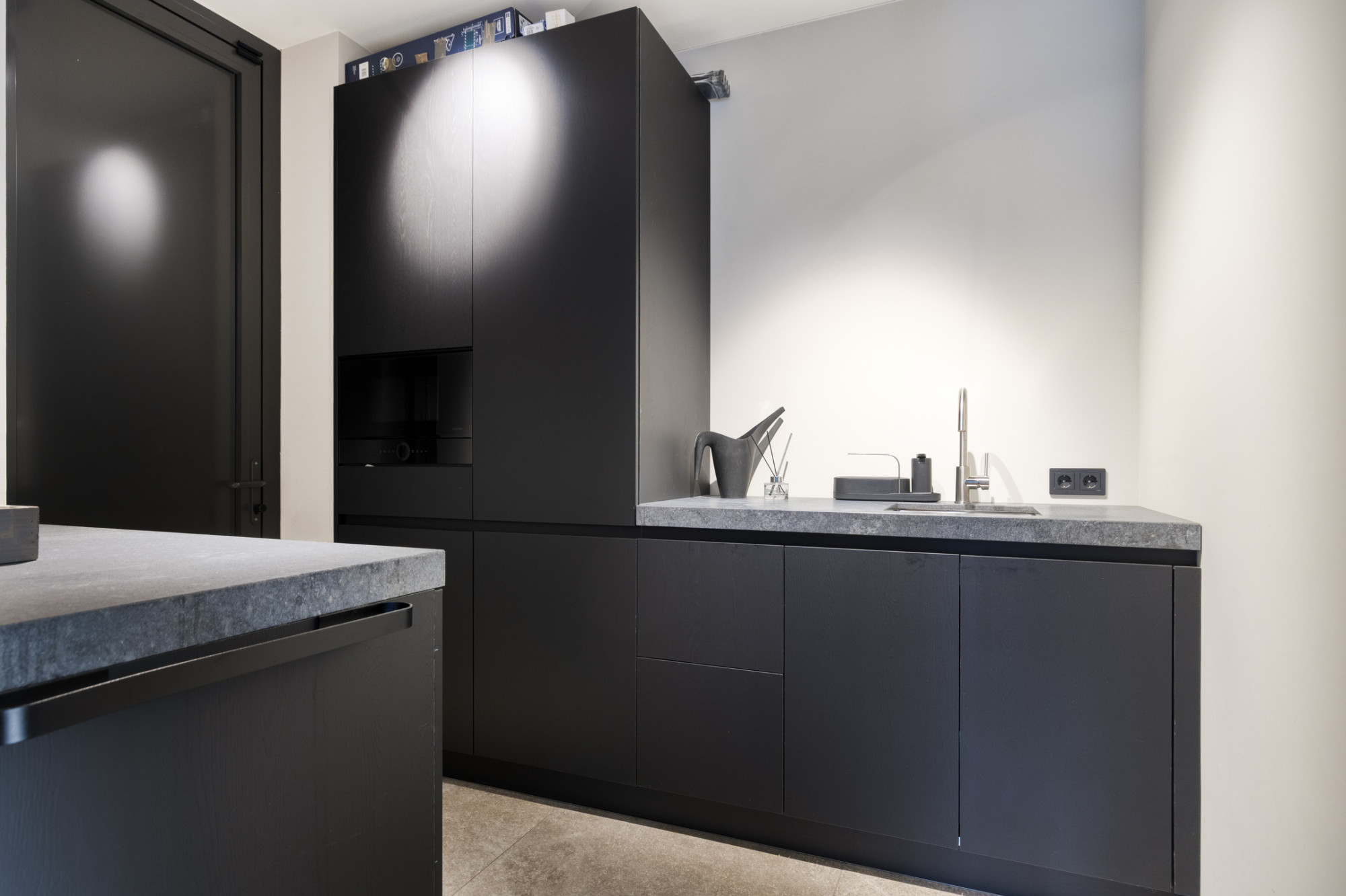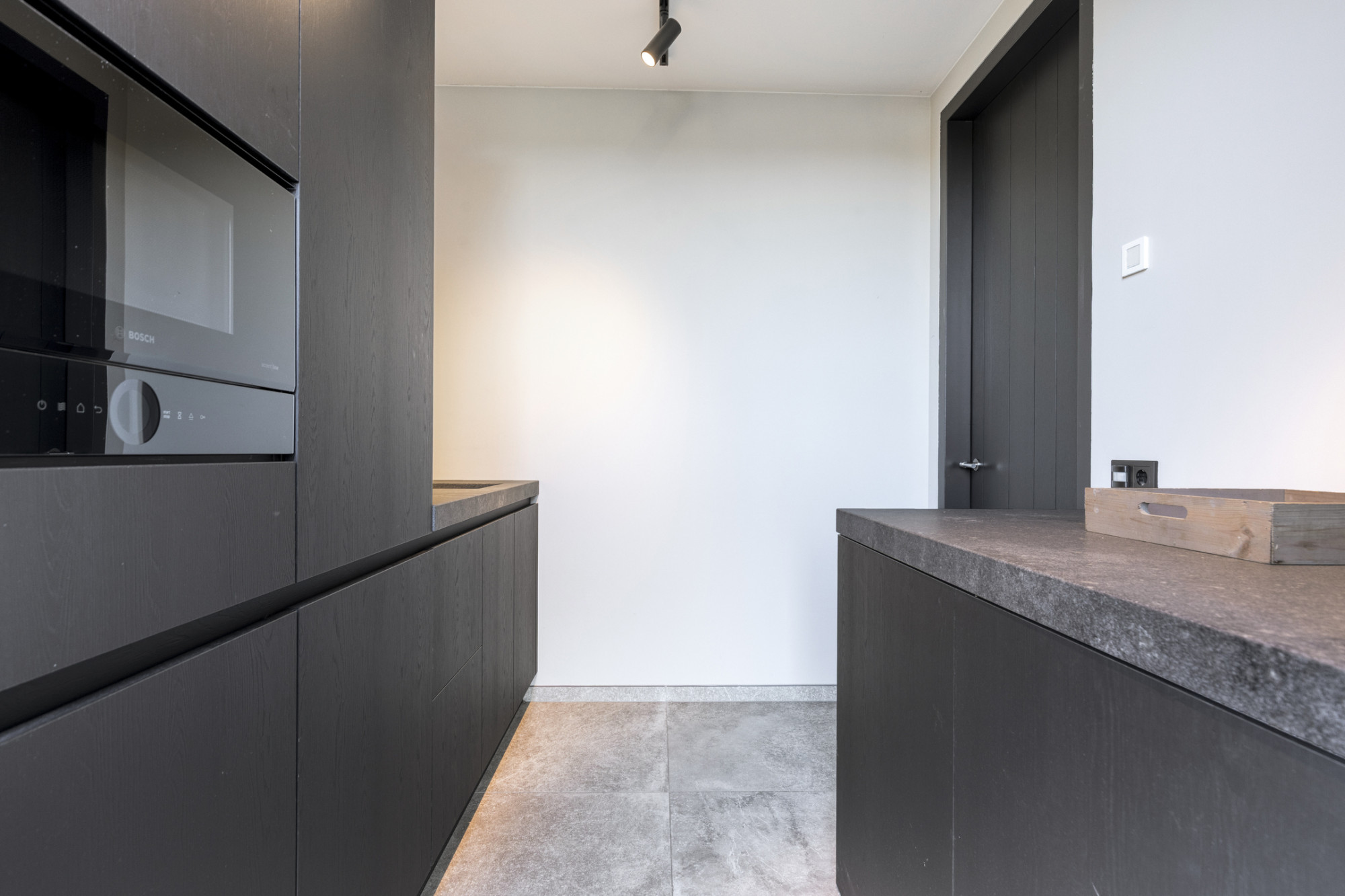 De stijl van de keuken loopt door in de bijkeuken. Een praktische ruimte waar je extra kasten, een oven en een wastafel vindt. Zo is alles een fraai geheel.