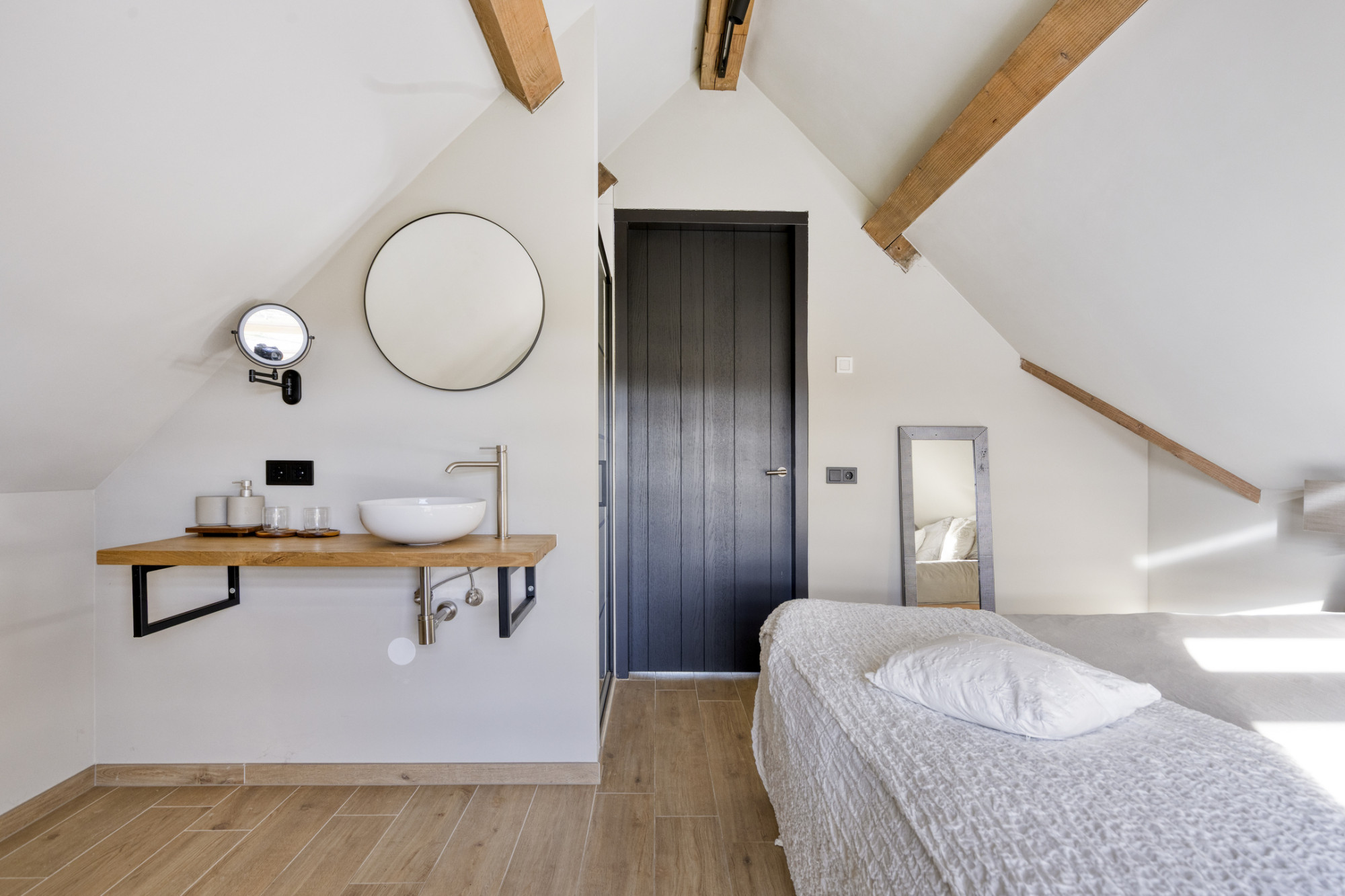 Boven vind je de tweede slaapkamer, volledig met eigen wastafel en badkamer. De overloop voorziet je van een multifunctionele ruimte waar jij bijvoorbeeld een thuiswerkplek kunt realiseren.