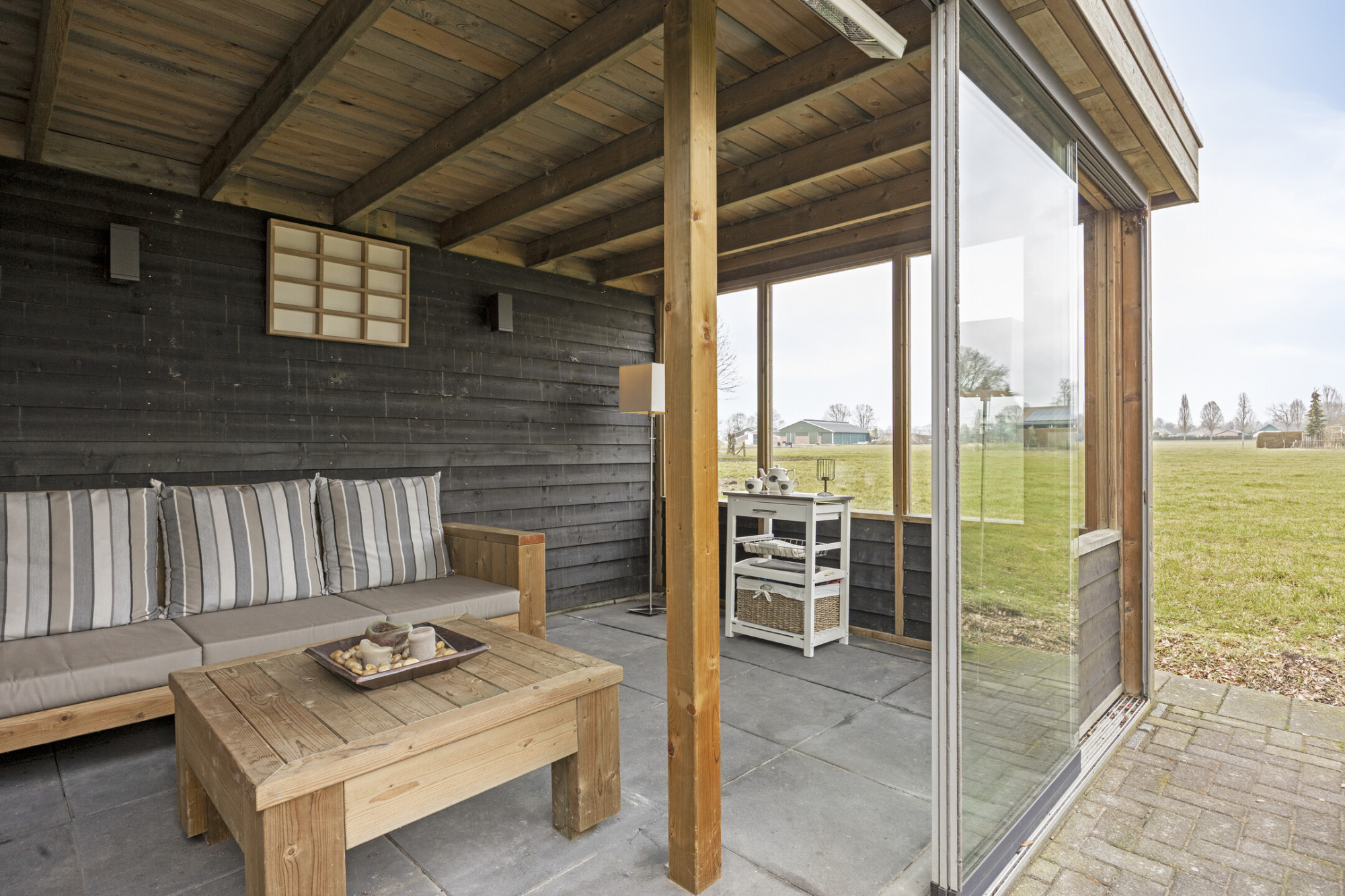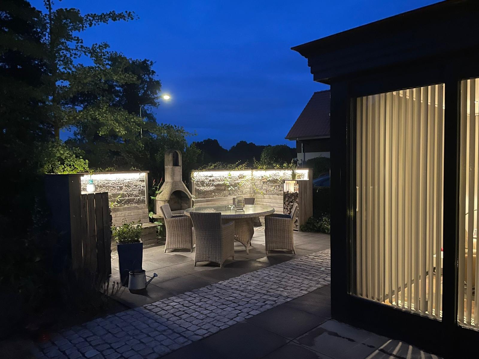 - Overkapping die volledig af te sluiten is en voorzien van terrasverwarming, goede stroomvoorziening en verlichtingsspots;