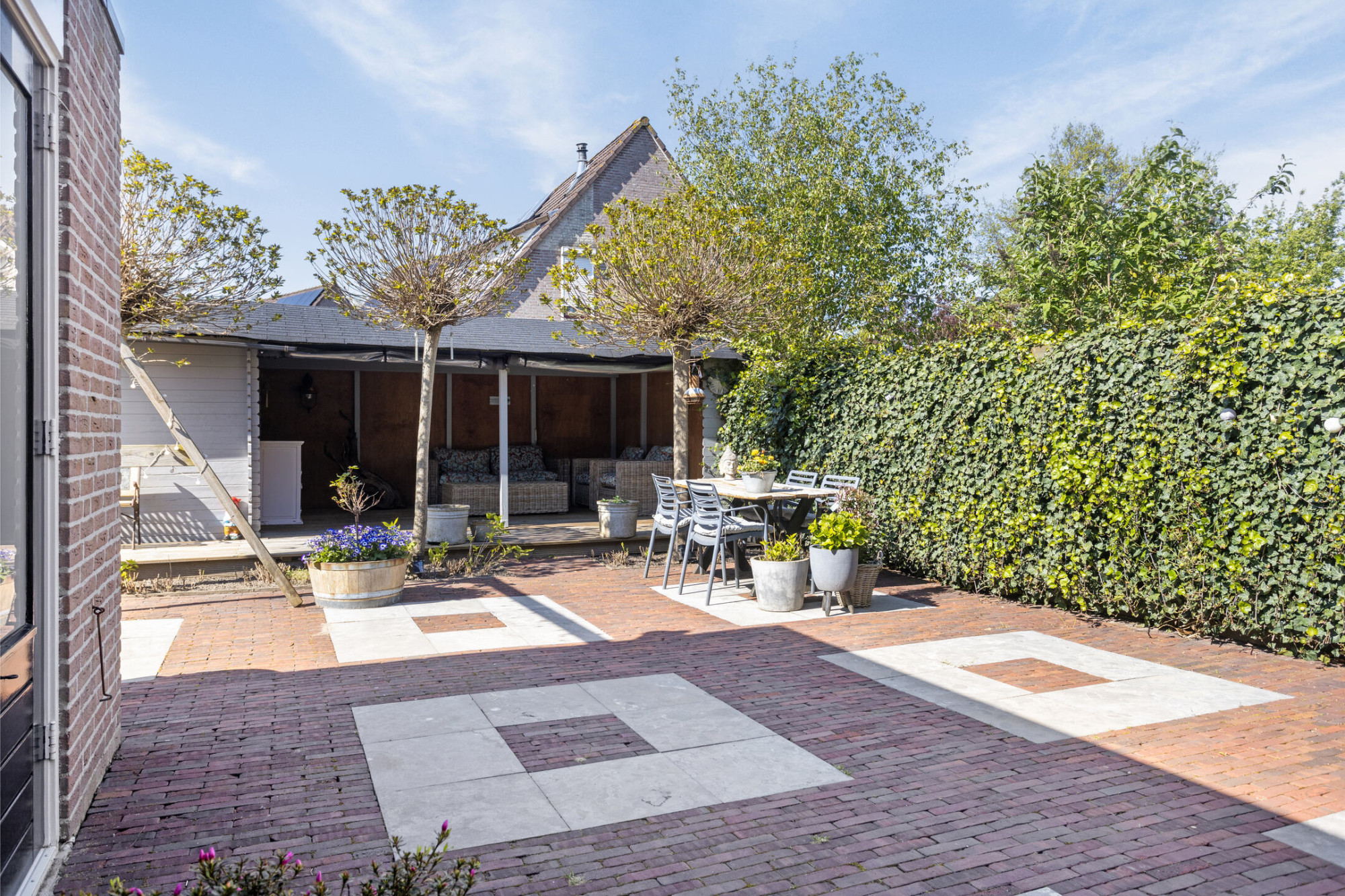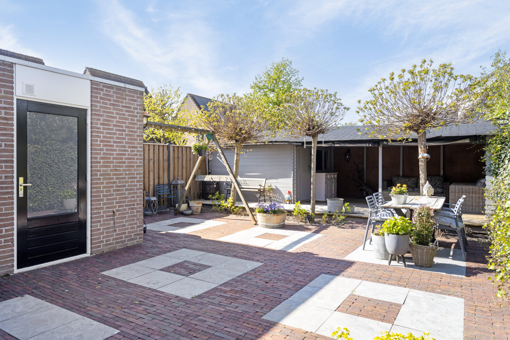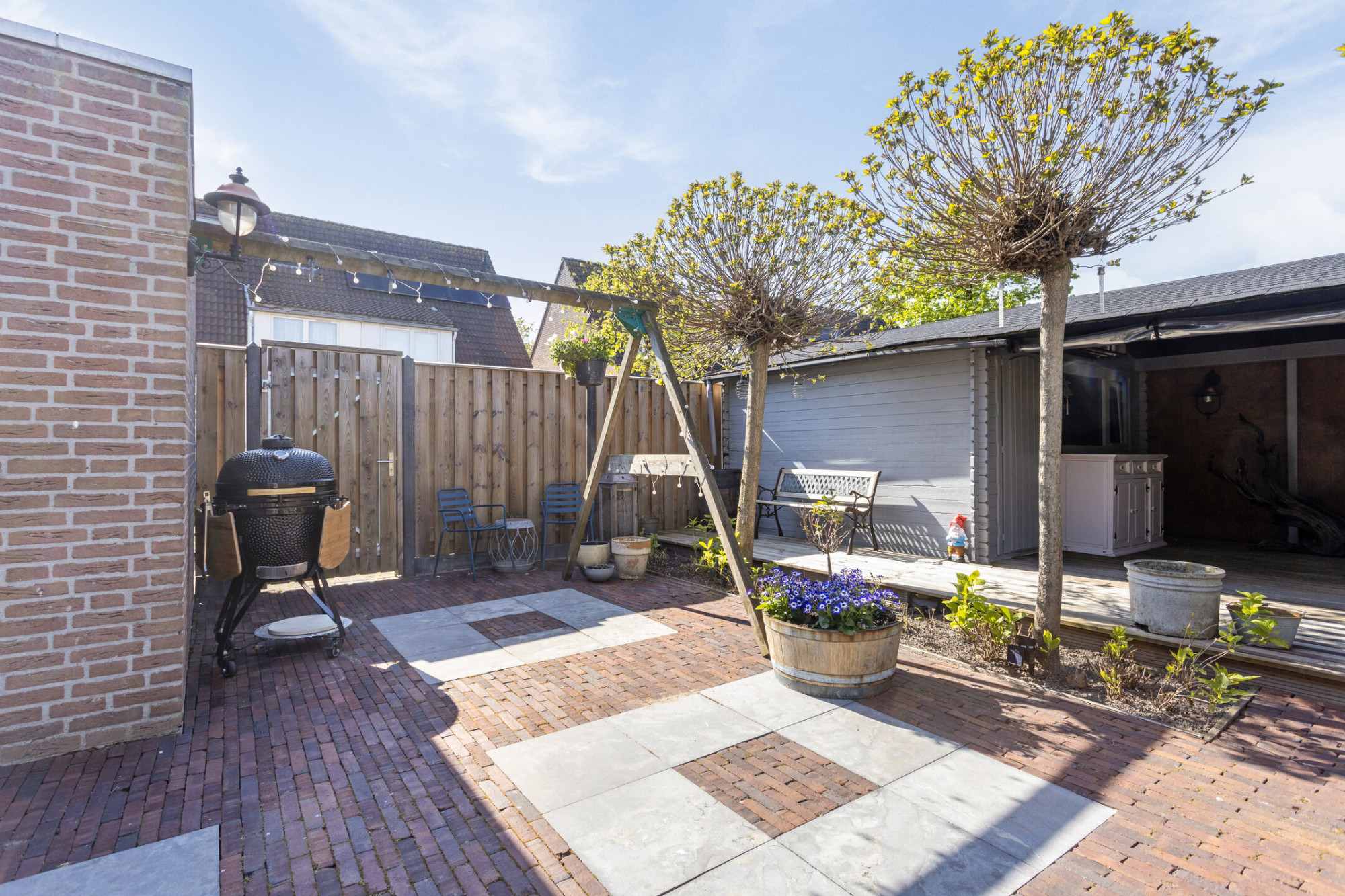 - Grote overkapping en een tuinhuis voor extra opbergruimte;