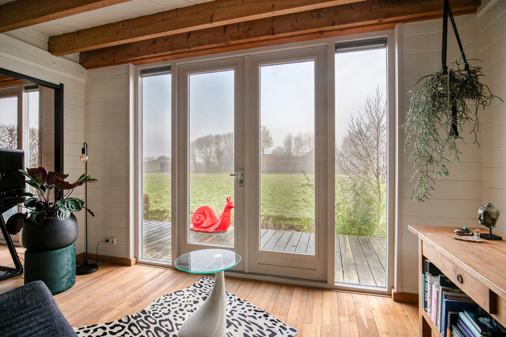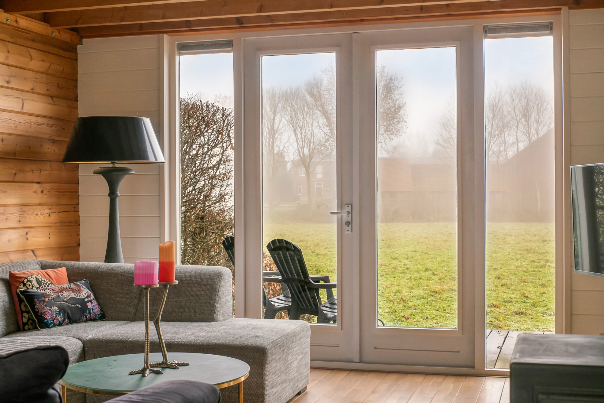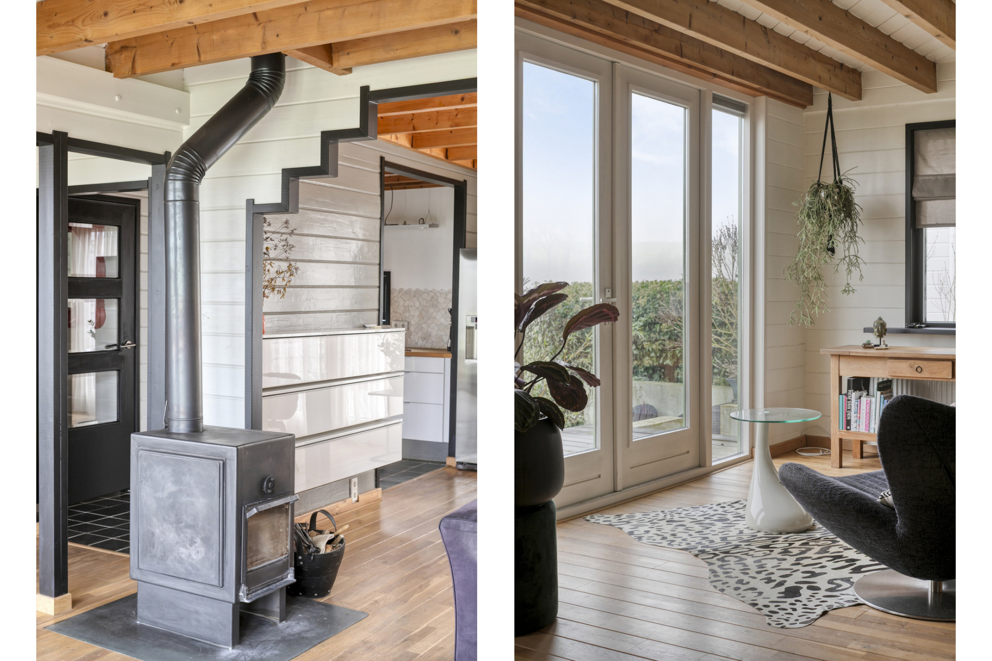 - Lichte woonkamer met houtkachel en tuindeuren;