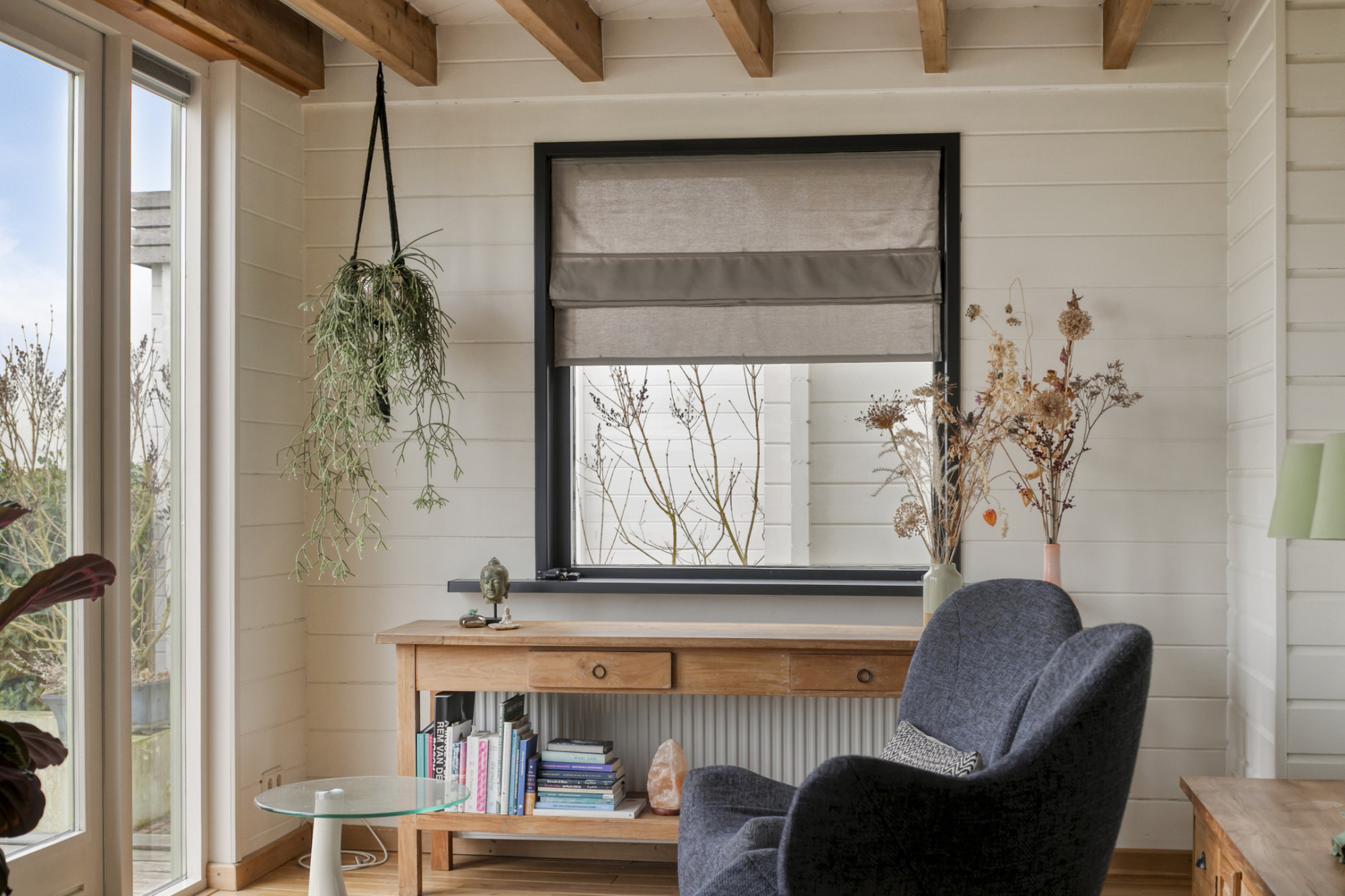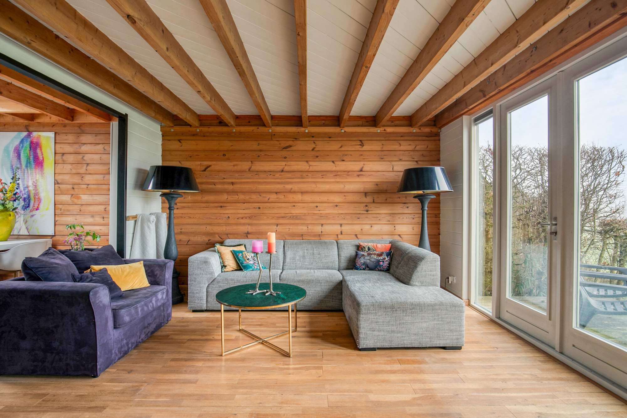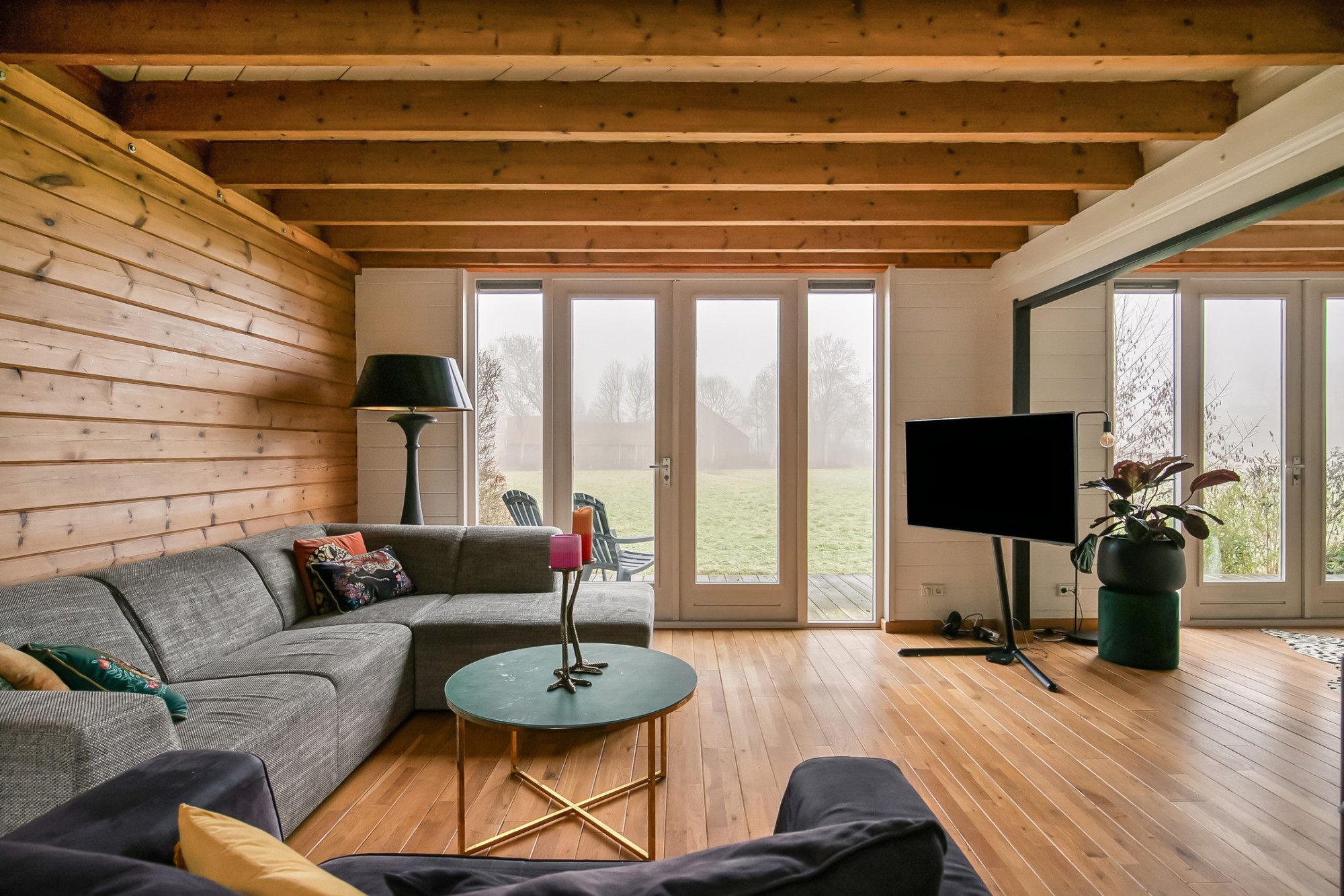 - Lichte woonkamer met houtkachel en tuindeuren;
