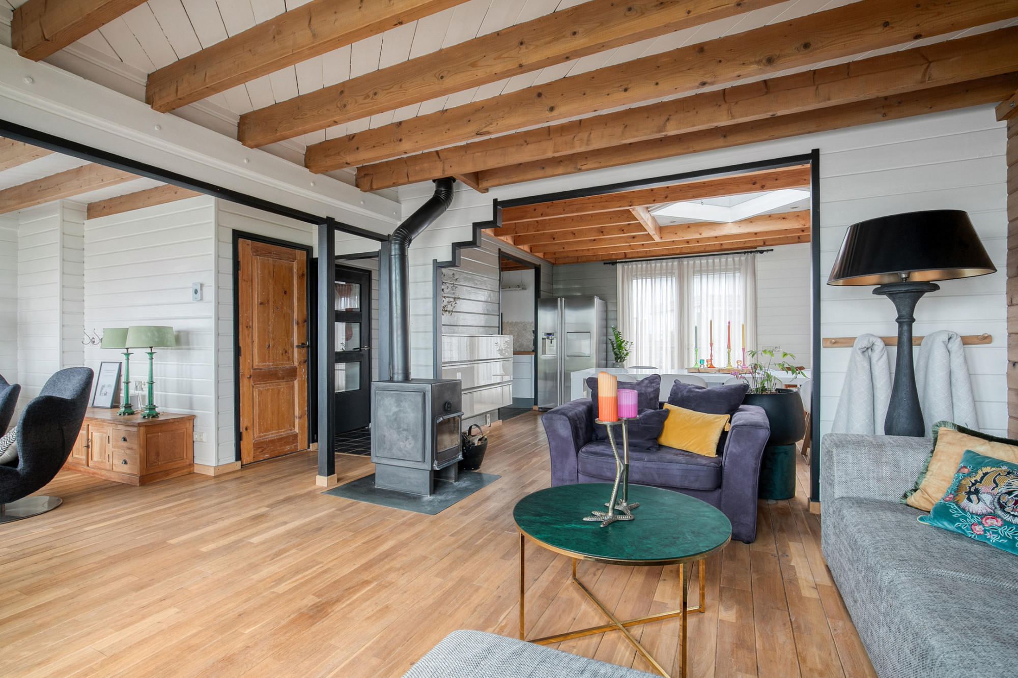 Op de begane grond komen sfeer en functionaliteit samen. De woonkamer is licht, ruim en voorzien van een eikenhouten vloer en houtkachel. Bovendien loopt dankzij drie dubbele tuindeuren binnen naadloos over in buiten én geniet je hier van een prachtig uitzicht. De keuken is uitgerust met een prachtige vloer en aanrechtblad van basalt natuursteen, een heerlijke plek om te koken.