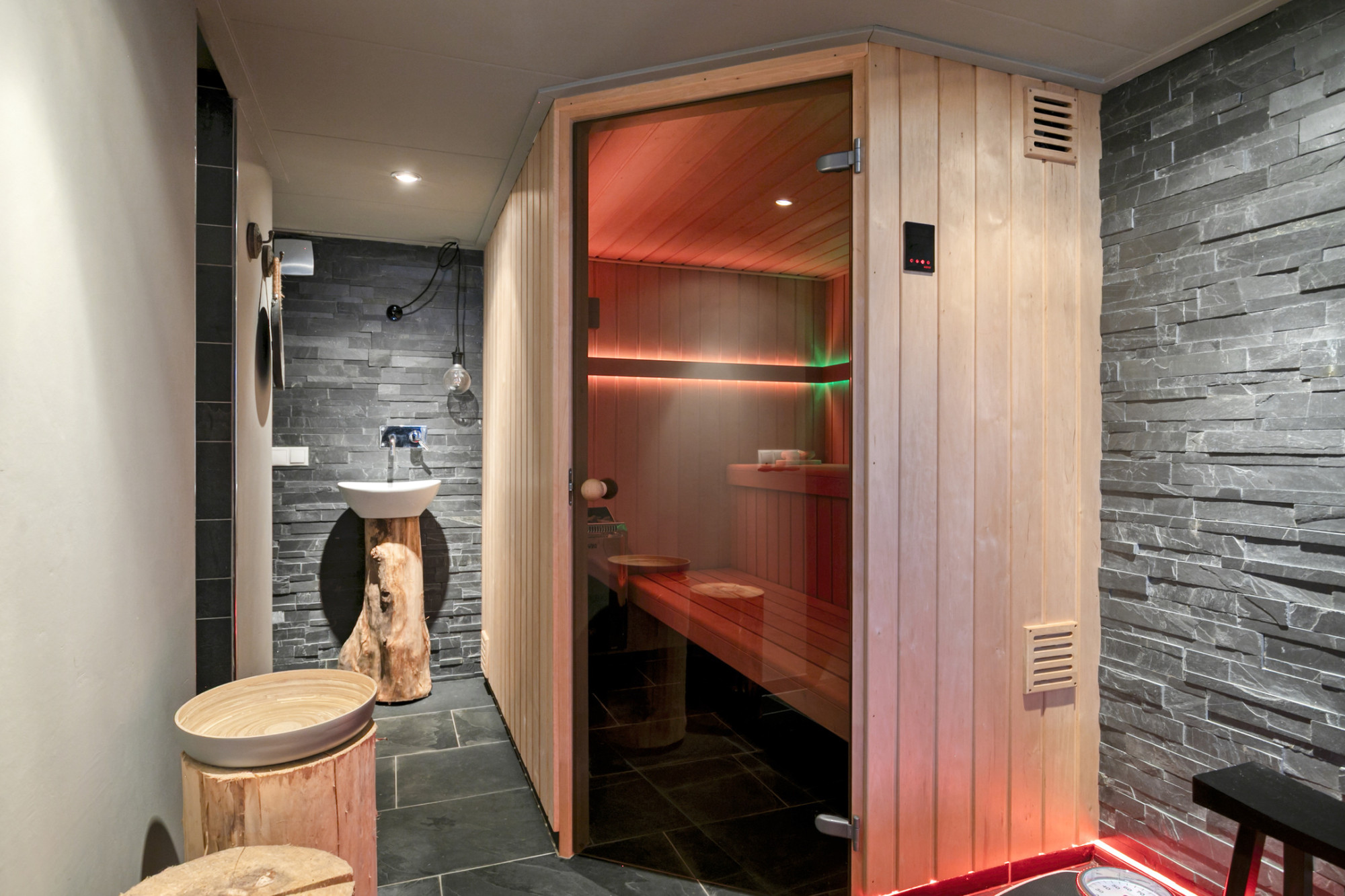 - Wellnessruimte in het souterrain met sauna, ligbad en inloopdouche;