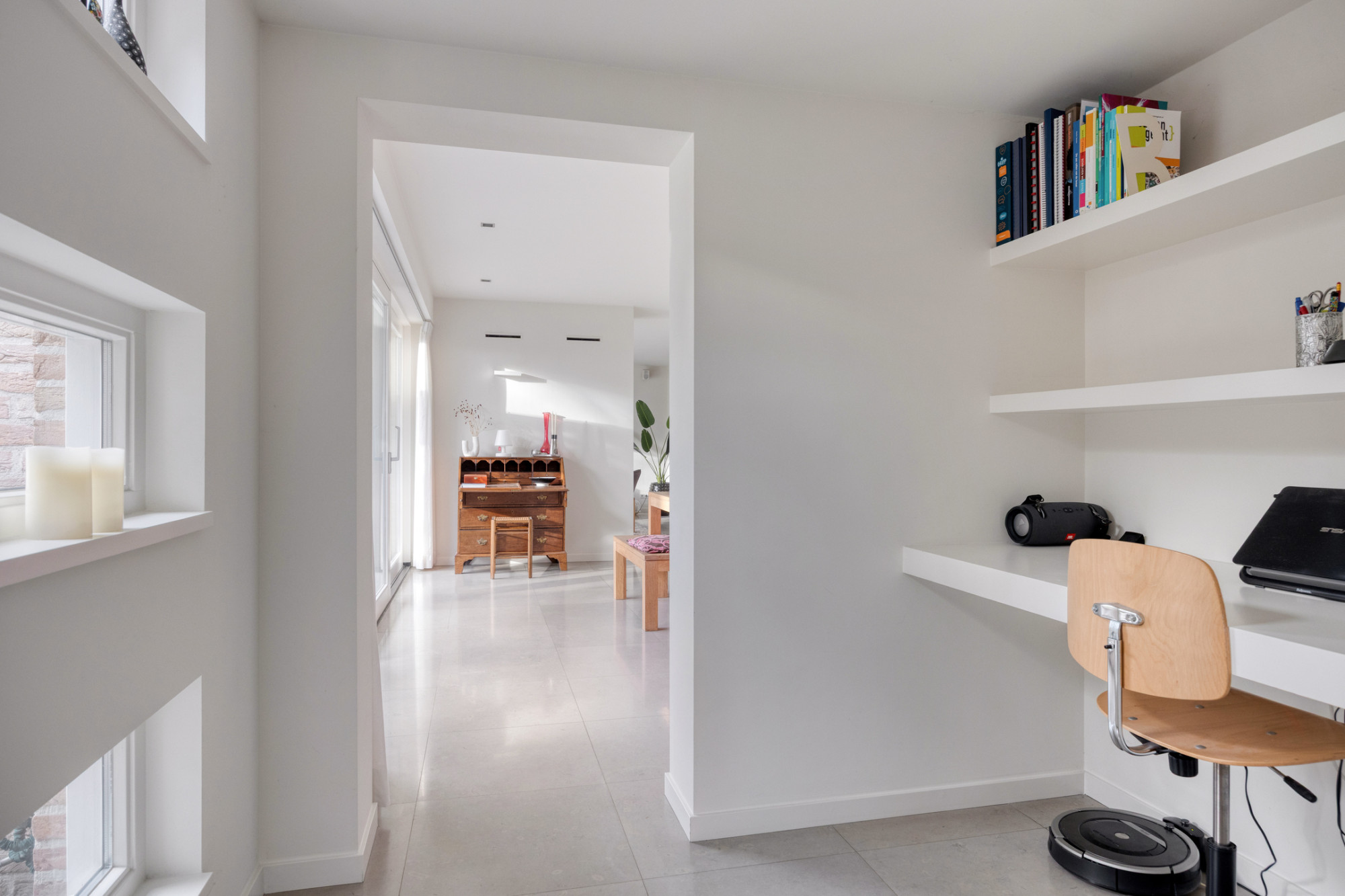 De begane grond vormt het hart van de woning en is heerlijk licht en ruim opgezet. De luxe woonkeuken is van alle gemakken voorzien en beschikt over airconditioning, ideaal tijdens warme dagen. Aangrenzend loop je via de study naar de ruime woonkamer met grote raampartijen en een schuifpuien die zorgen voor een fijne verbinding met de tuin. Dankzij de vloerverwarming (met uitzondering van de slaapkamer) en goede isolatie is het hier het hele jaar door comfortabel wonen.