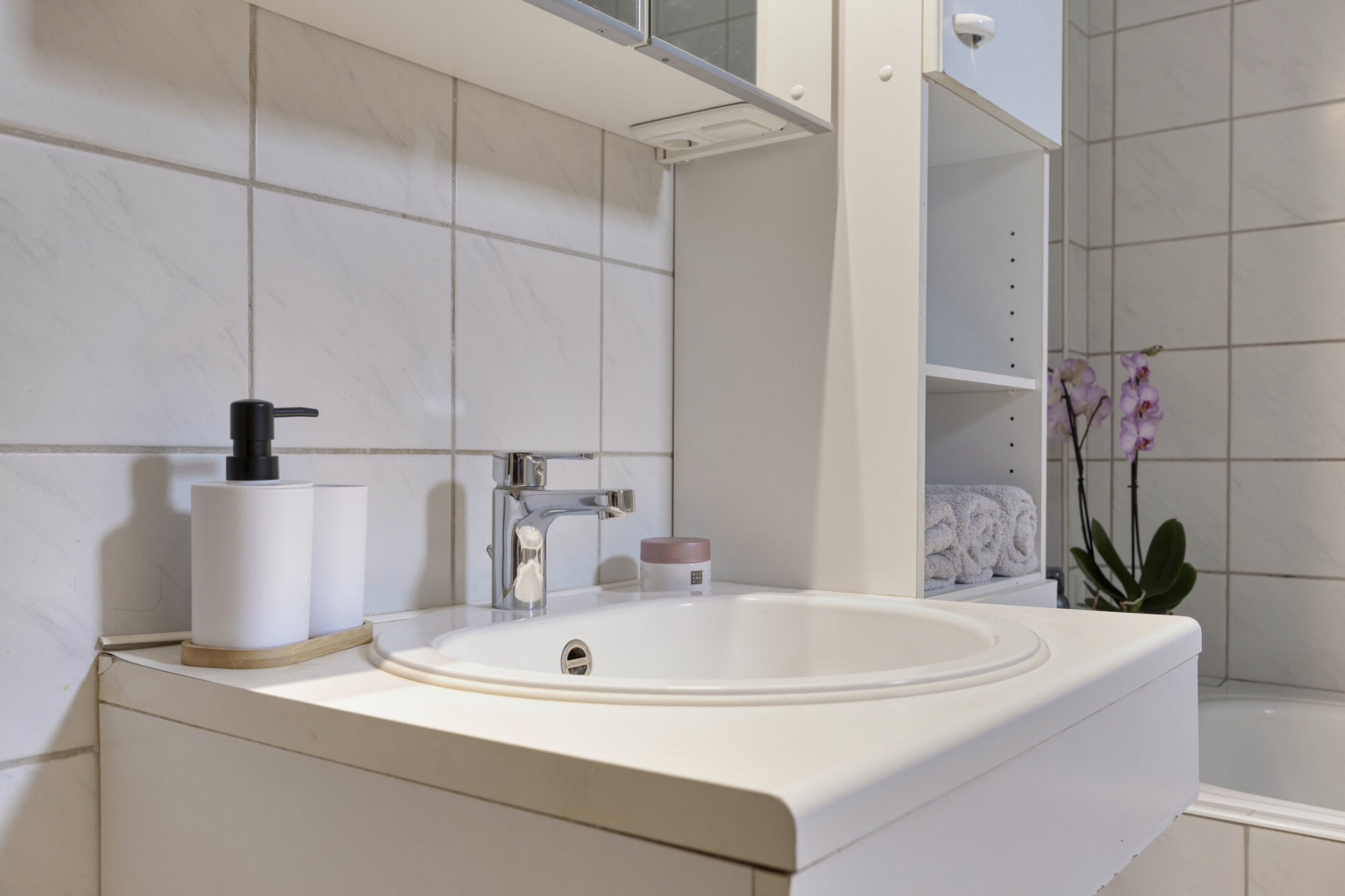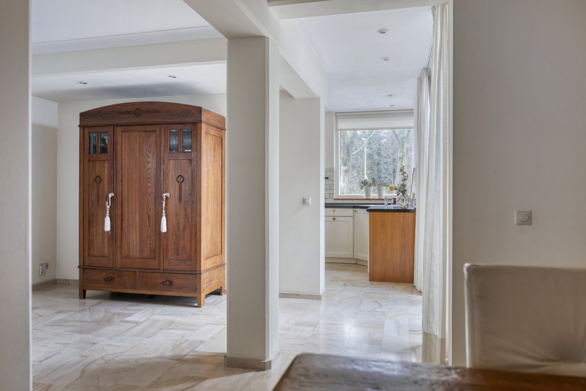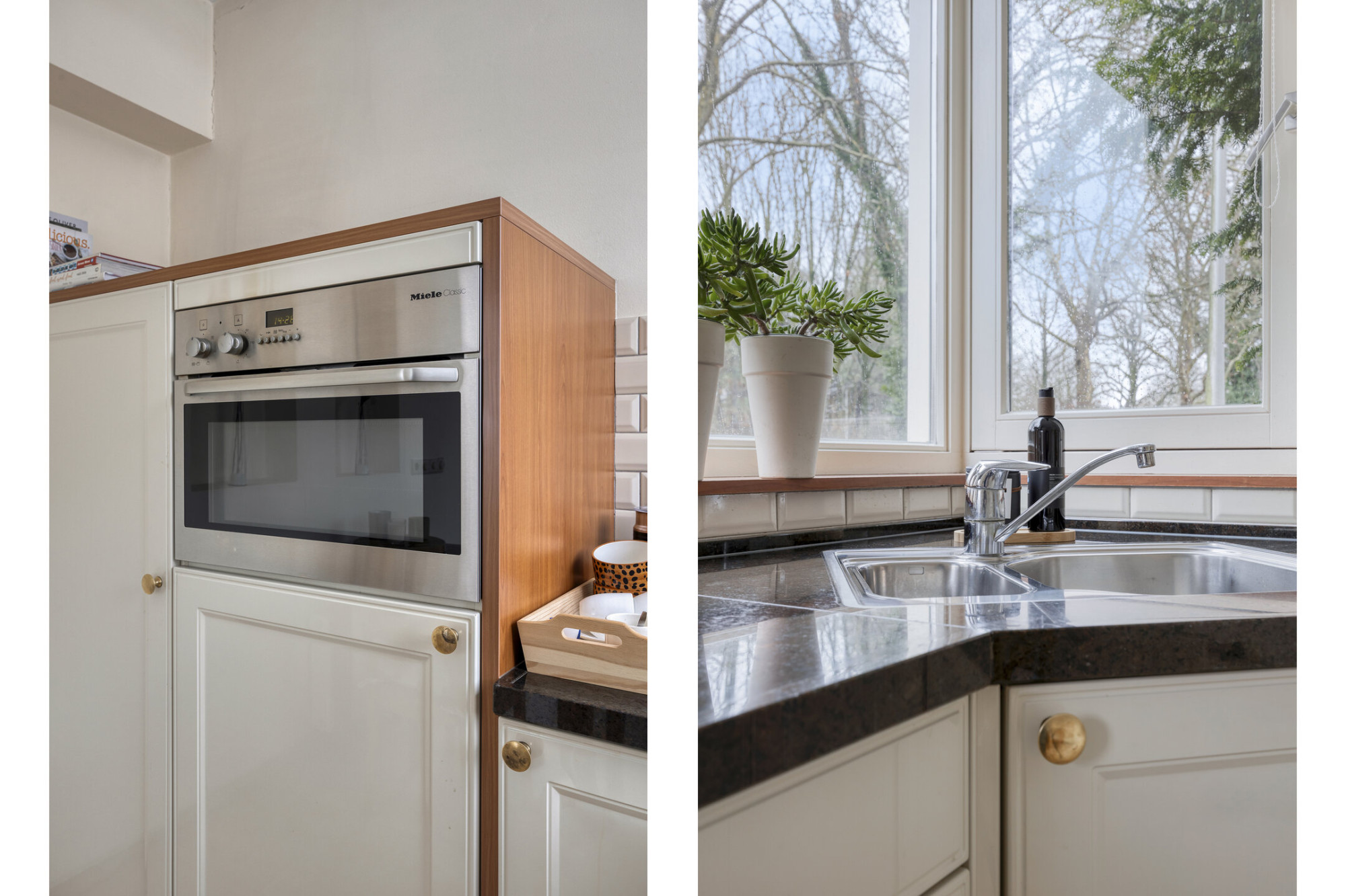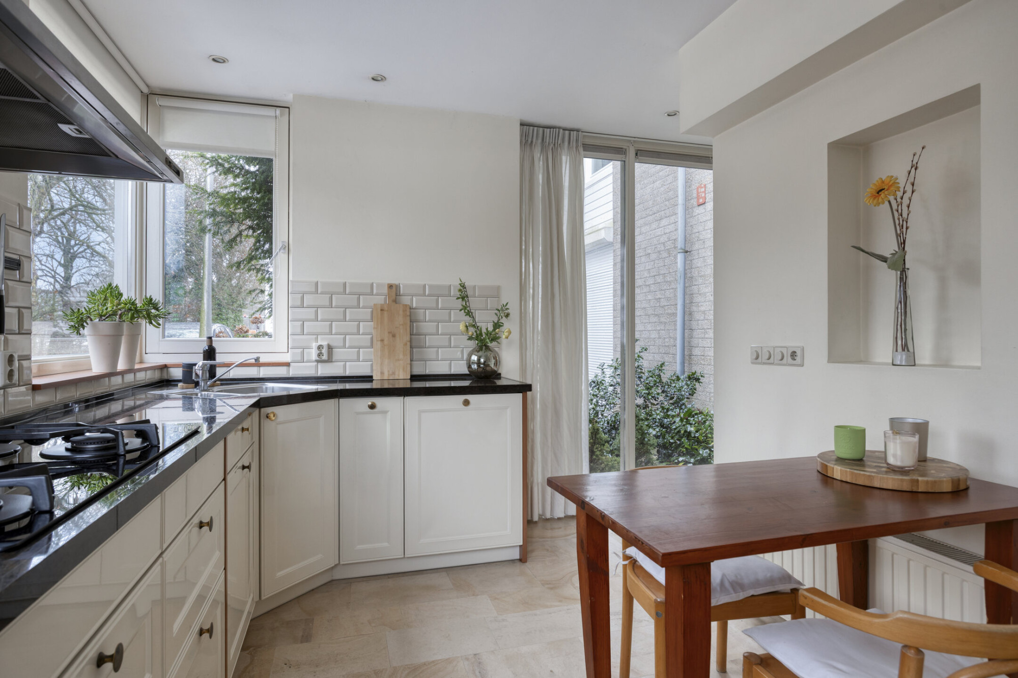 De halfopen keuken vormt samen met de woonkamer een prettige leefruimte waar koken en wonen moeiteloos samengaan. Het granieten aanrechtblad geeft de keuken een verzorgde, tijdloze uitstraling en biedt volop werkruimte. Vanuit de woonkamer is er directe toegang tot de tuin op het zuiden. Dit is een fijne plek om even buiten te zitten en te genieten van de zon.