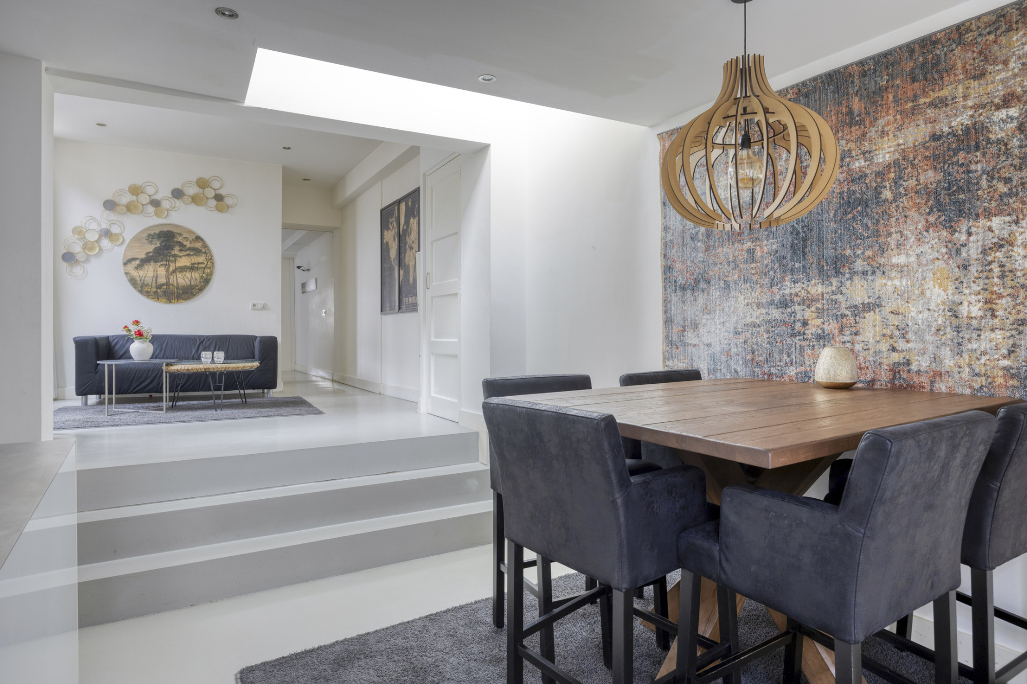 De woonkeuken is het eerste hoogtepunt. Luxe uitgevoerd, voorzien van een kookeiland, moderne apparatuur en volop ruimte voor lange diners of gezellig ontbijtjes. Vanuit de keuken stap je via een paar treden omhoog naar de opkamer, die op zijn beurt weer doorloopt naar een woonkamer die letterlijk en figuurlijk groots voelt.