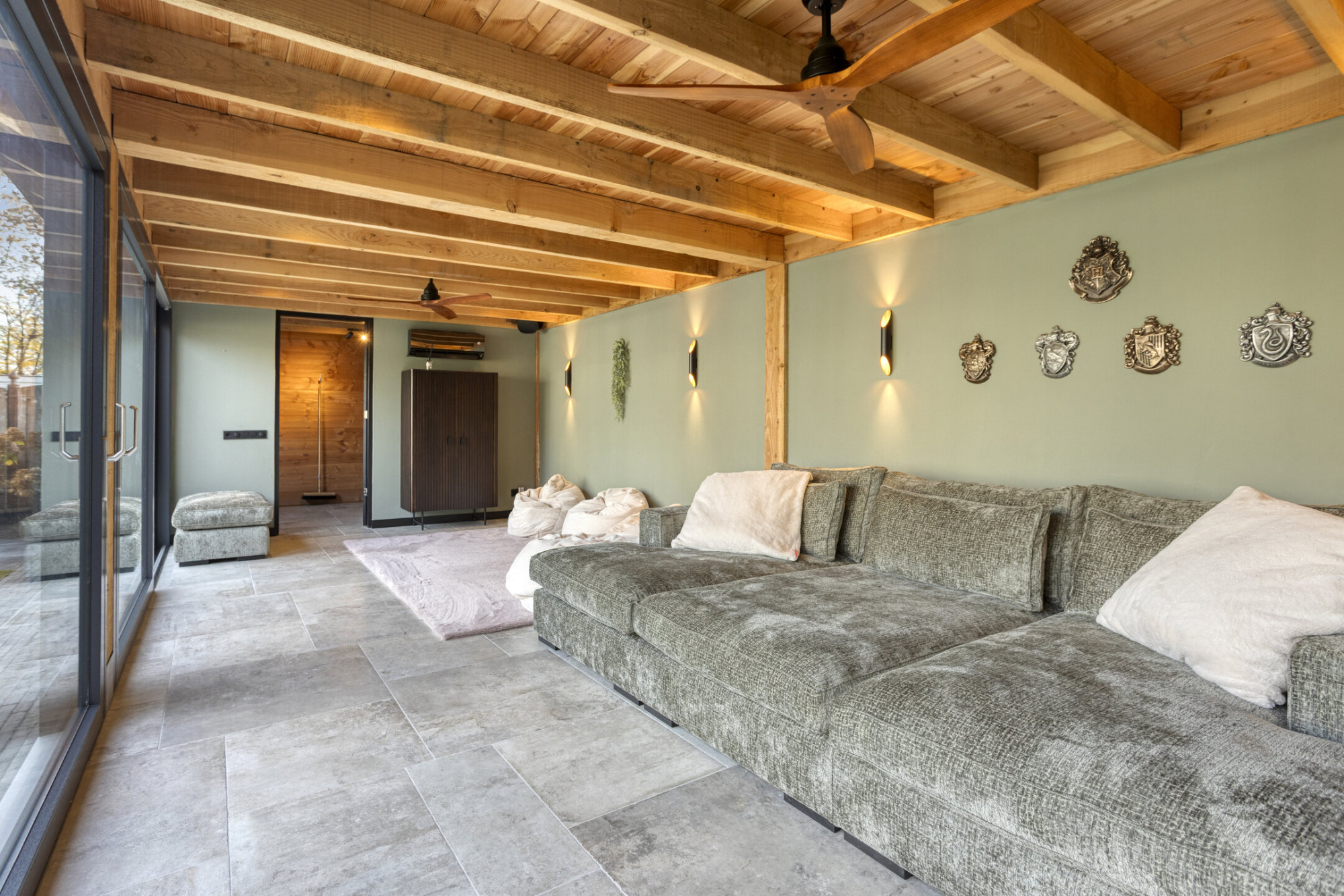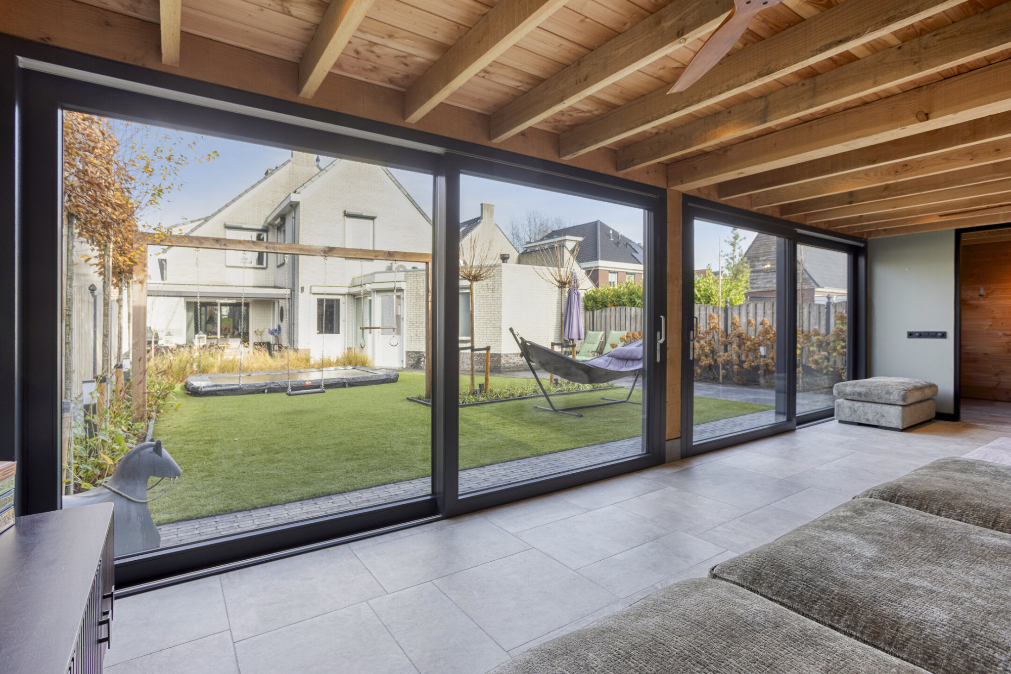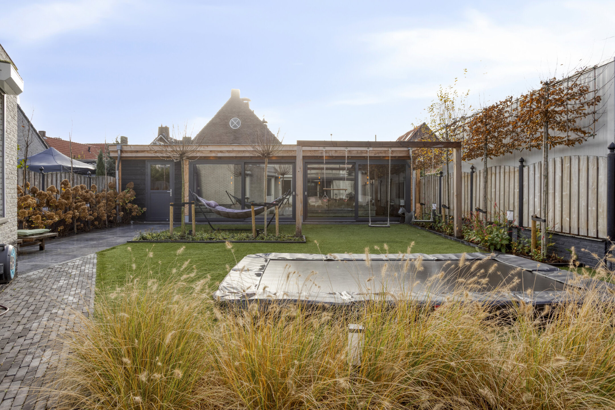 - Zonnige tuin op het zuiden met overkapping, luxe tuinhuis en achterom;