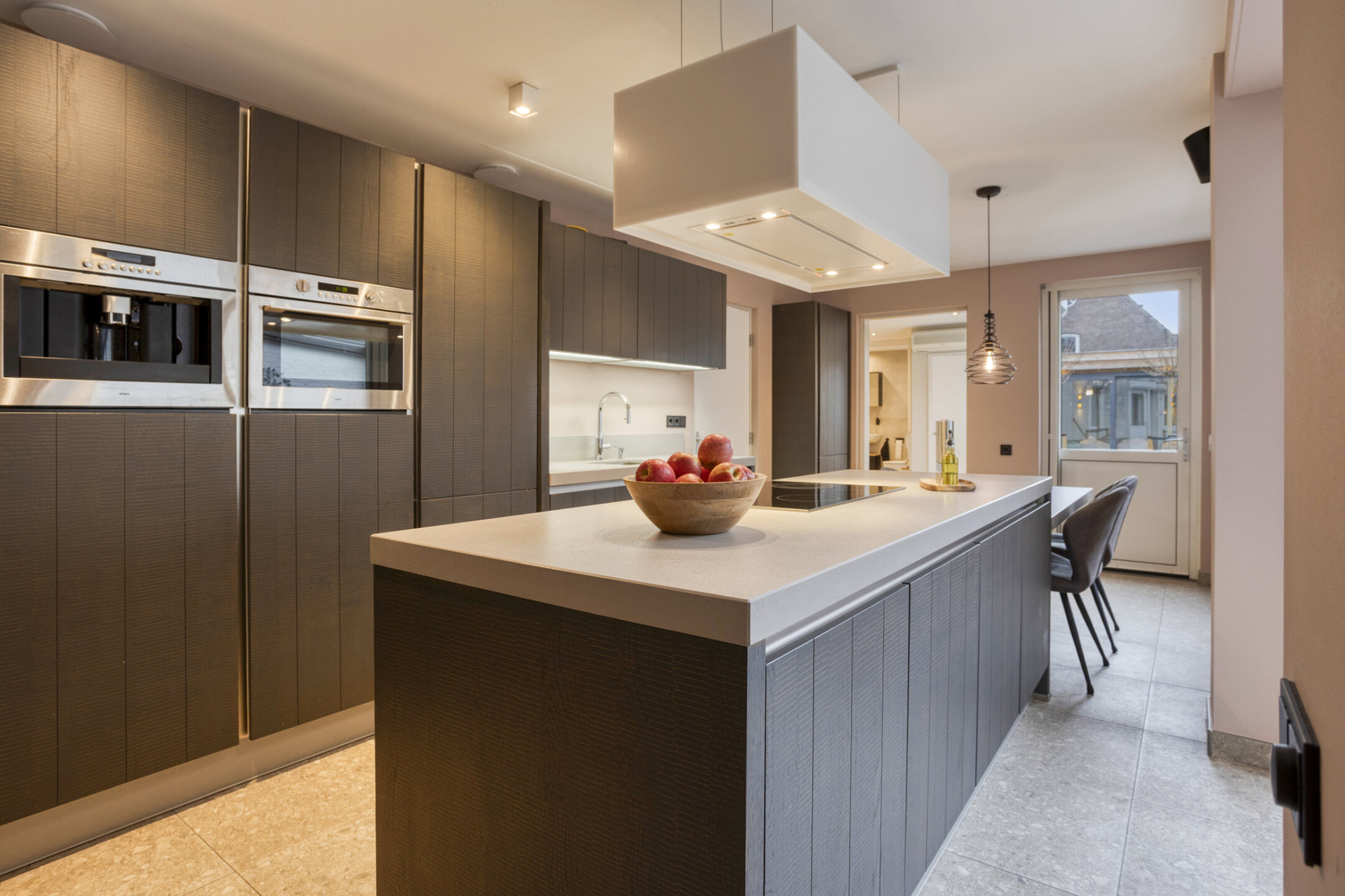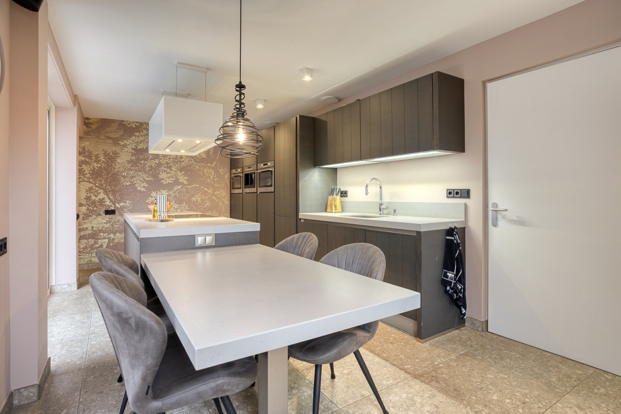 - Luxe woonkeuken met kookeiland, composiet blad en complete inbouwapparatuur;