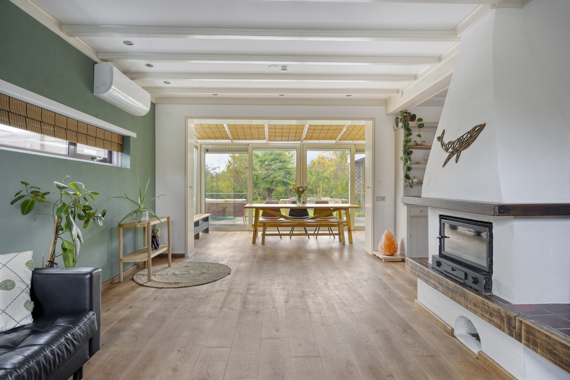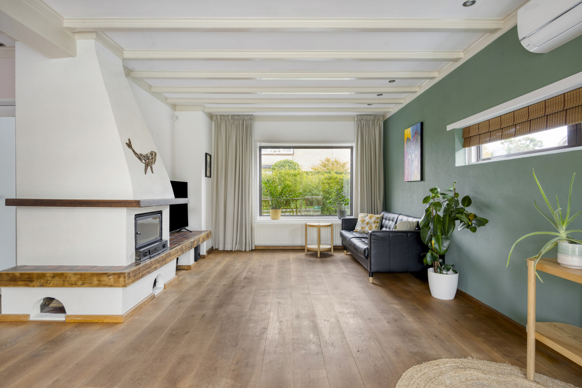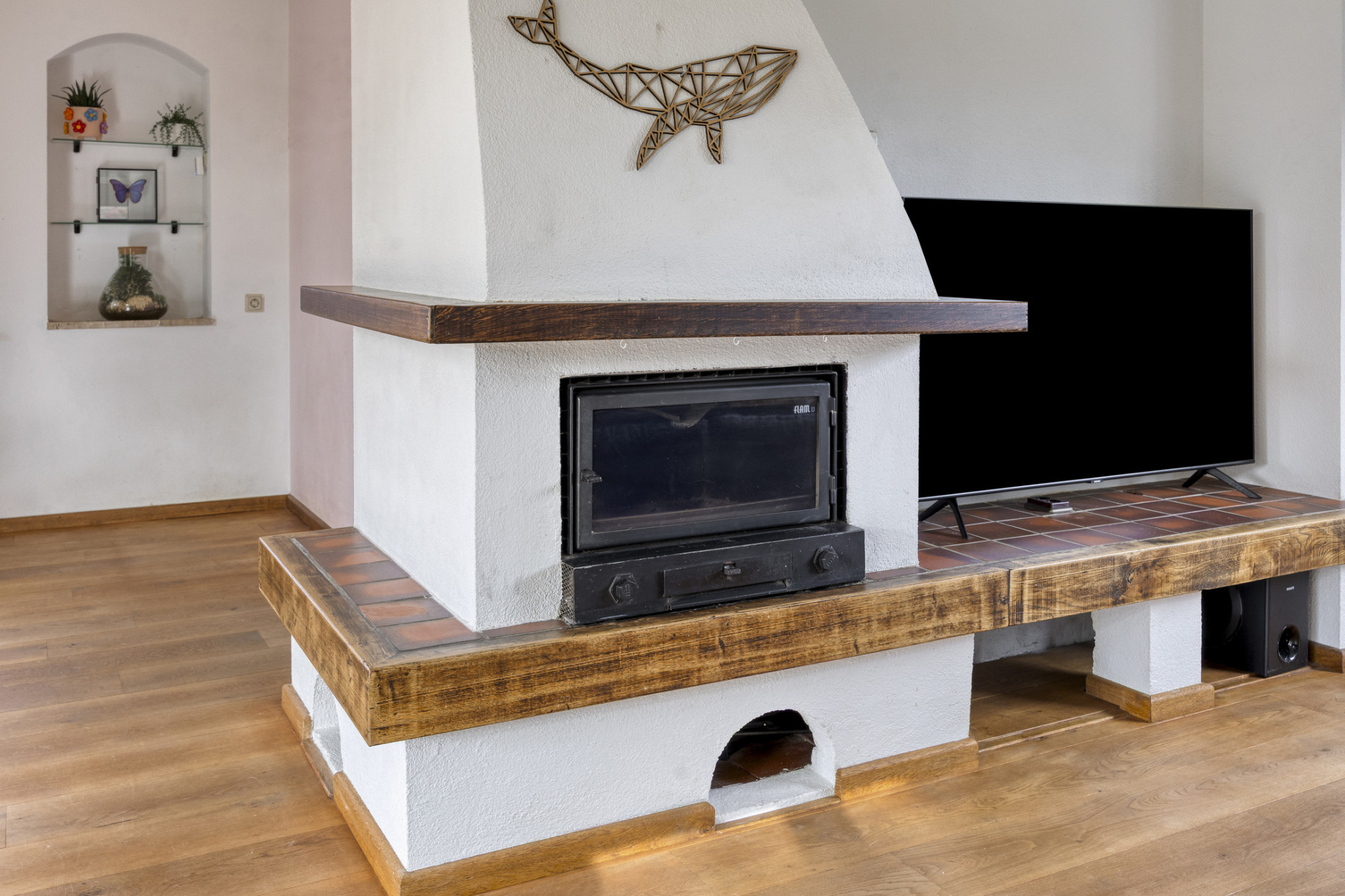 - Sfeervolle woonkamer met haard en authentieke elementen;
