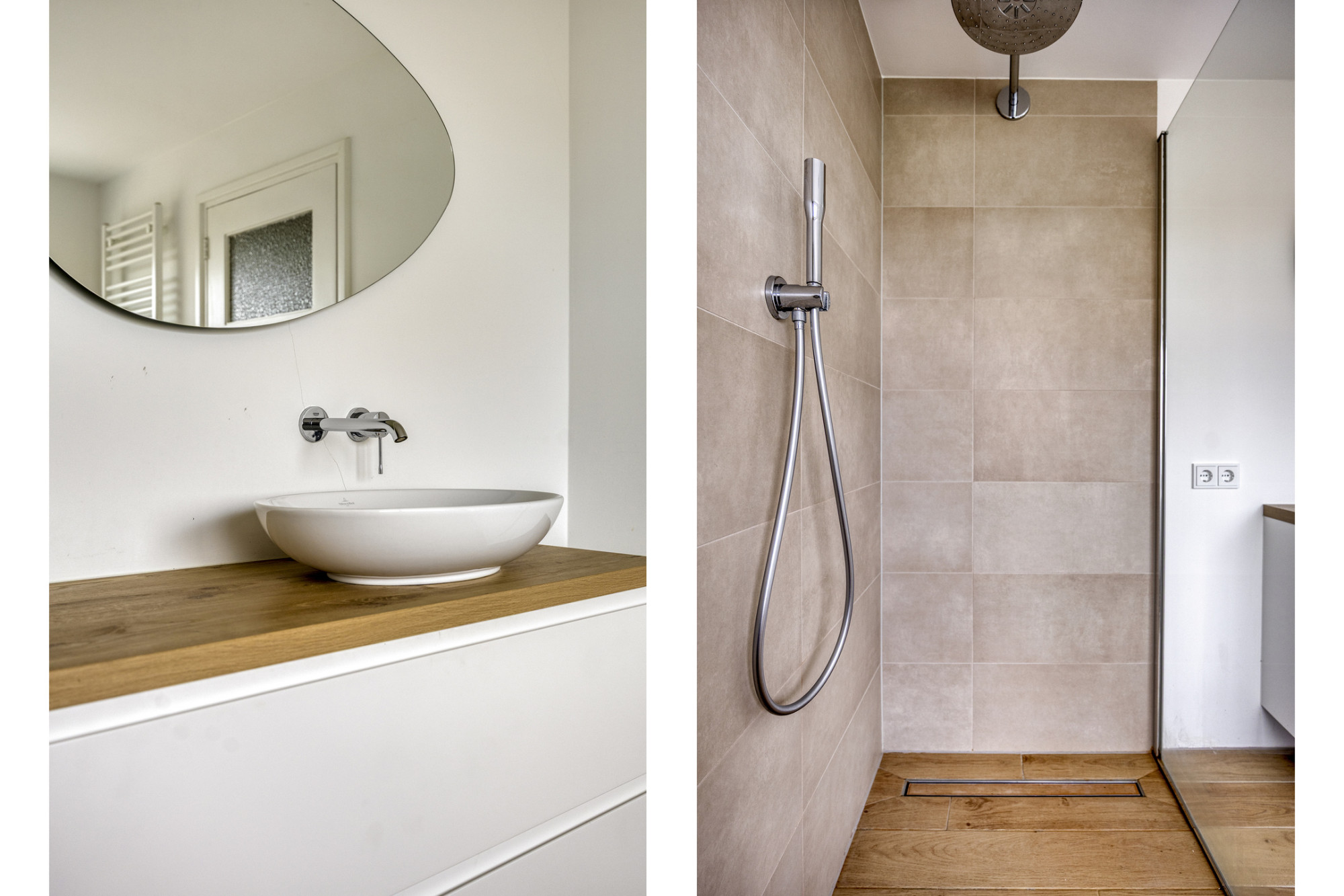- Luxe en strak afgewerkte badkamer met ligbad en inloopdouche;