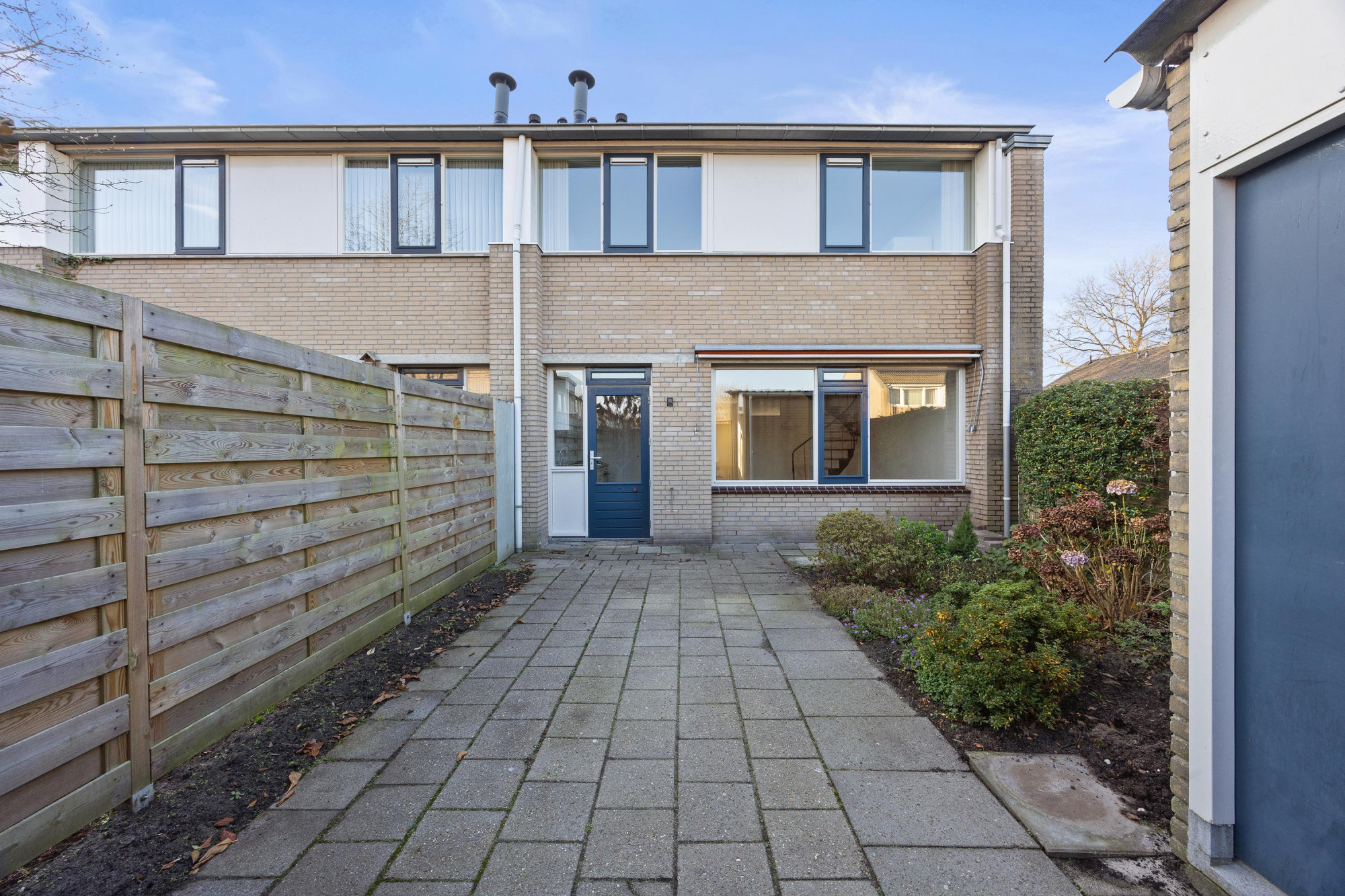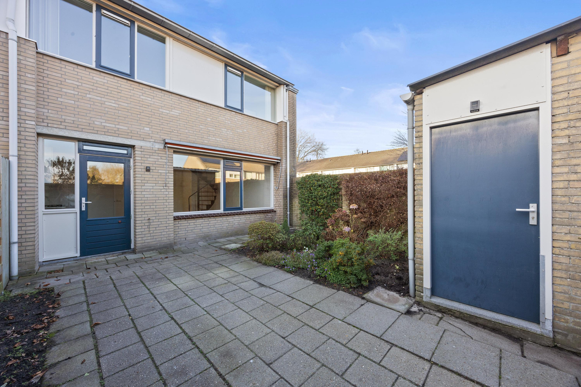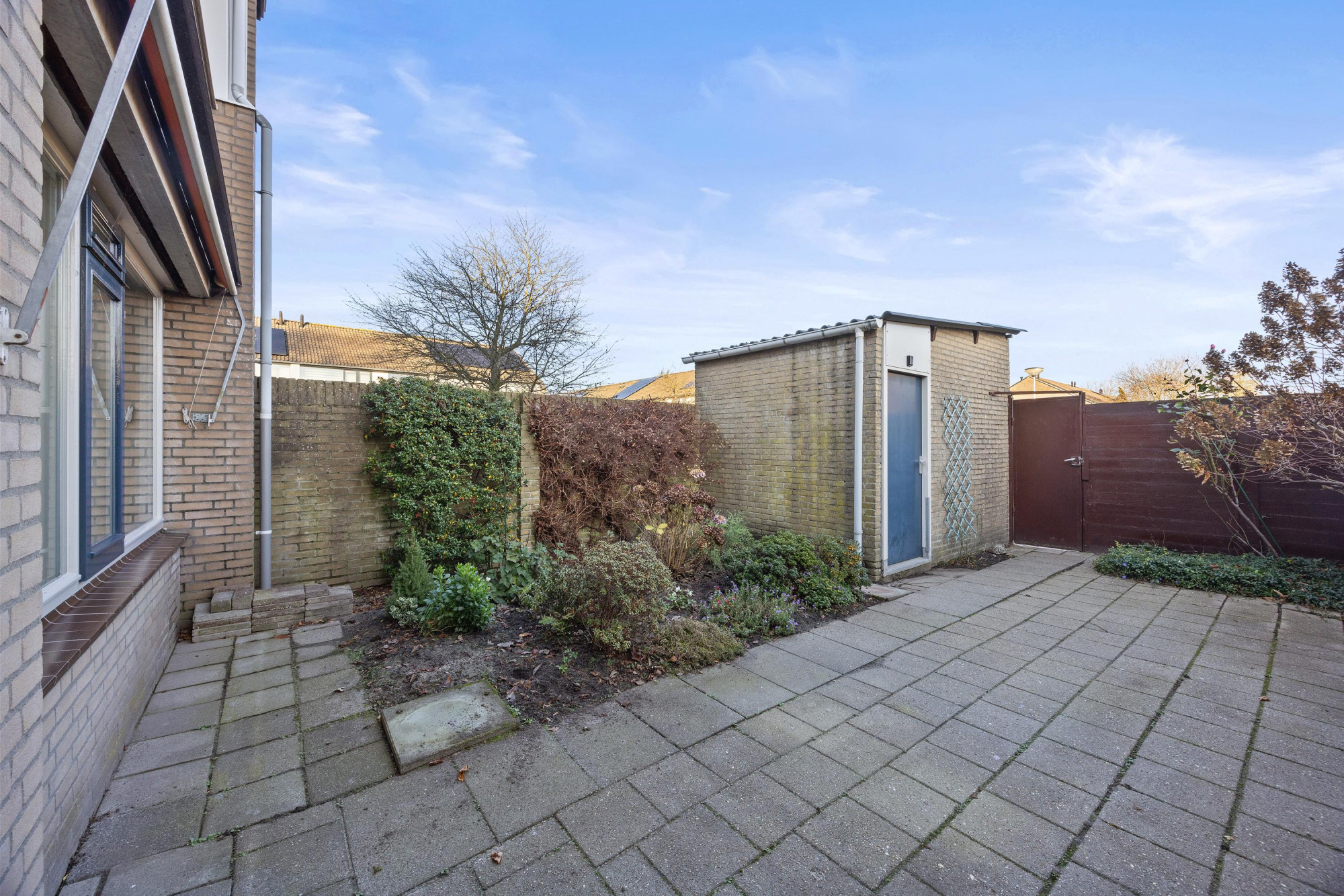 De achtertuin is gelegen op het oosten en biedt een fijne plek om buiten te zitten. Dankzij de ligging geniet je hier vooral in de ochtend en vroege middag van de zon. Daarnaast is er een praktische berging aanwezig voor fietsen en tuingereedschap.
