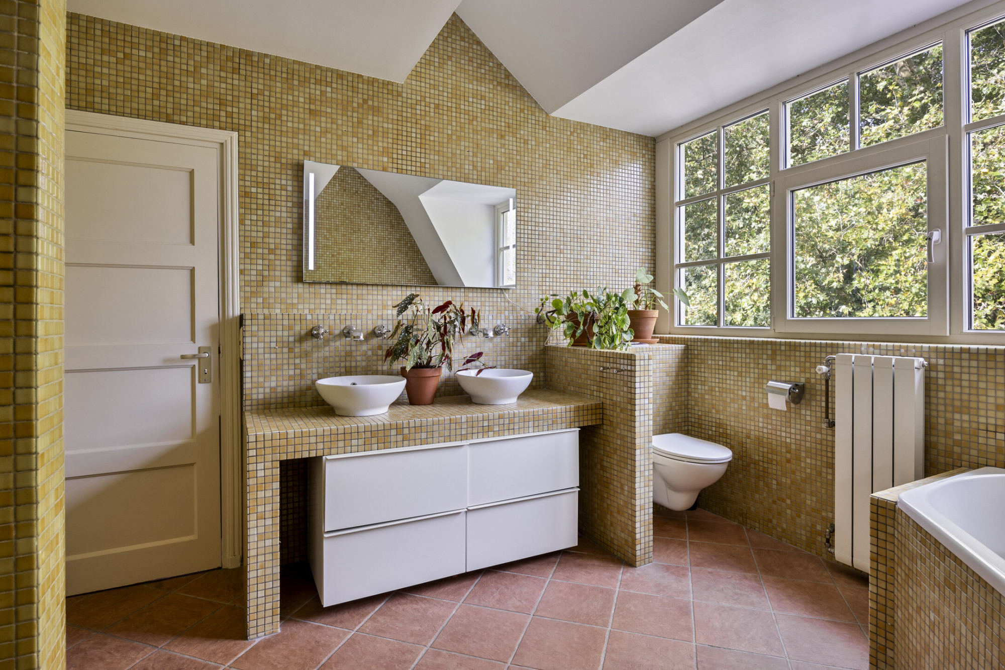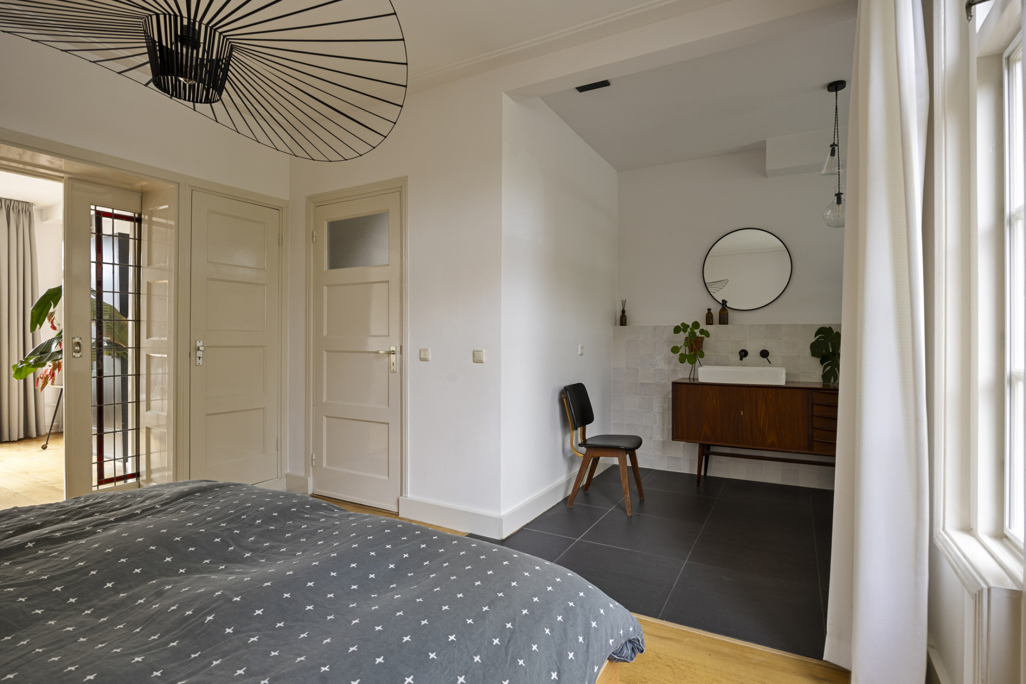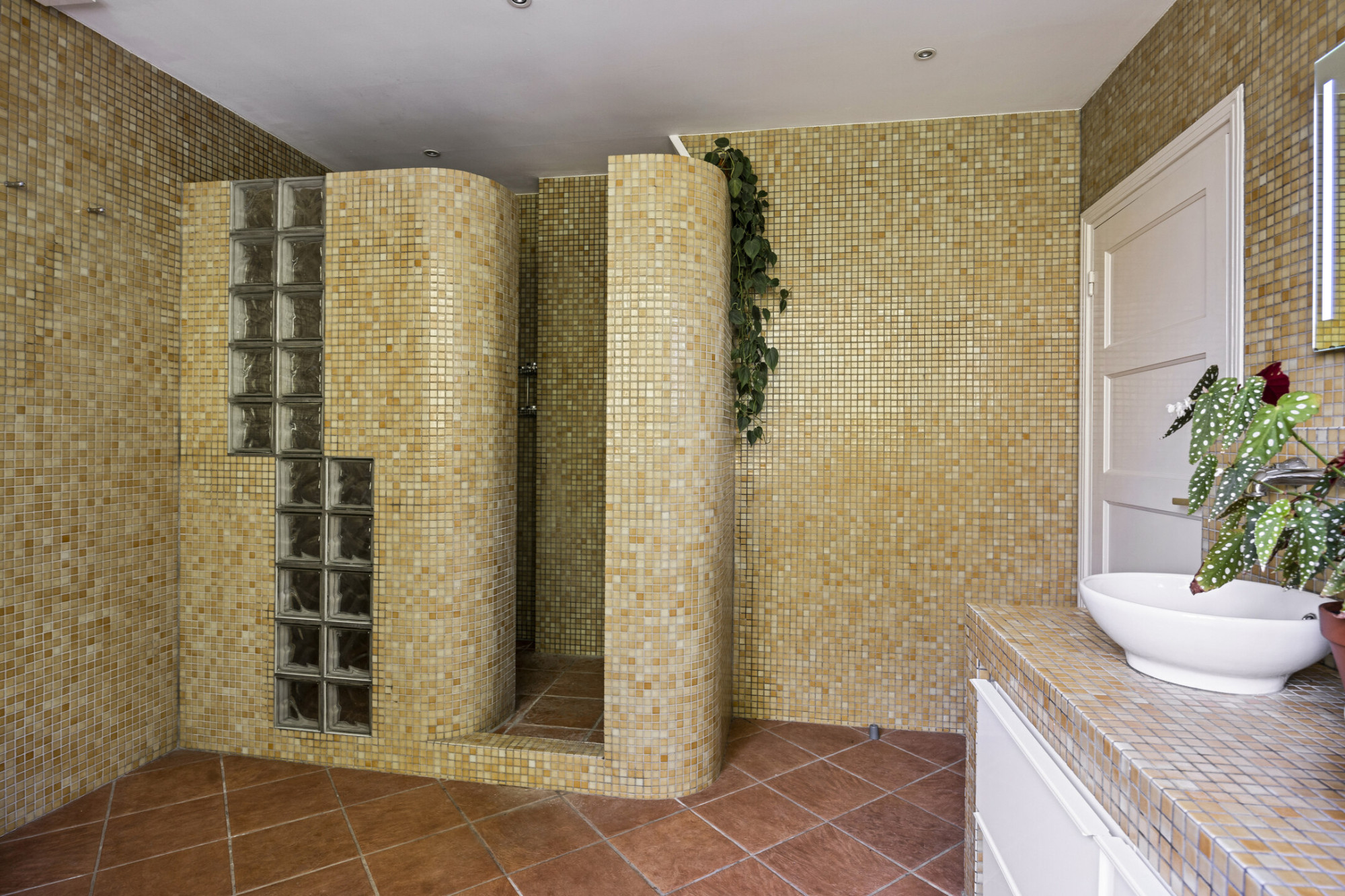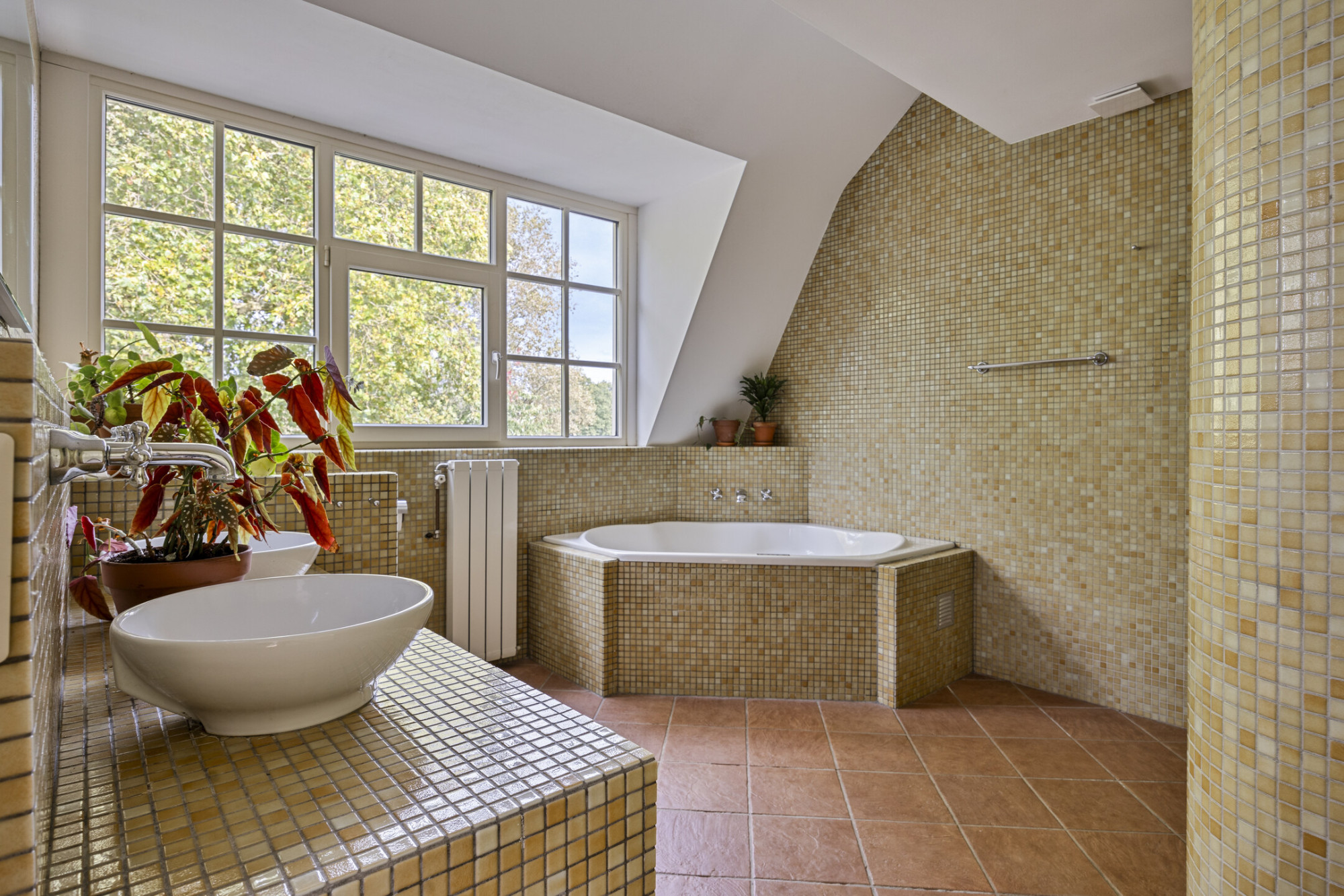 - Badkamer met inloopdouche, toilet, dubbele wastafel en ligbad;