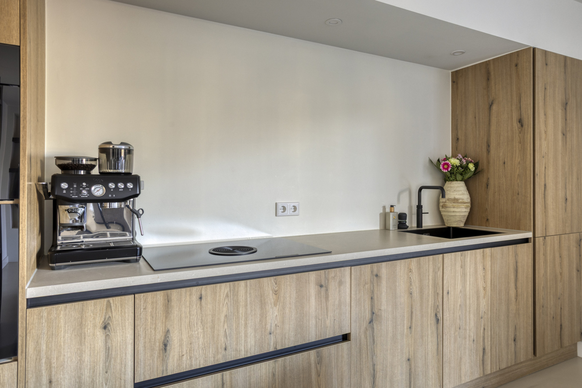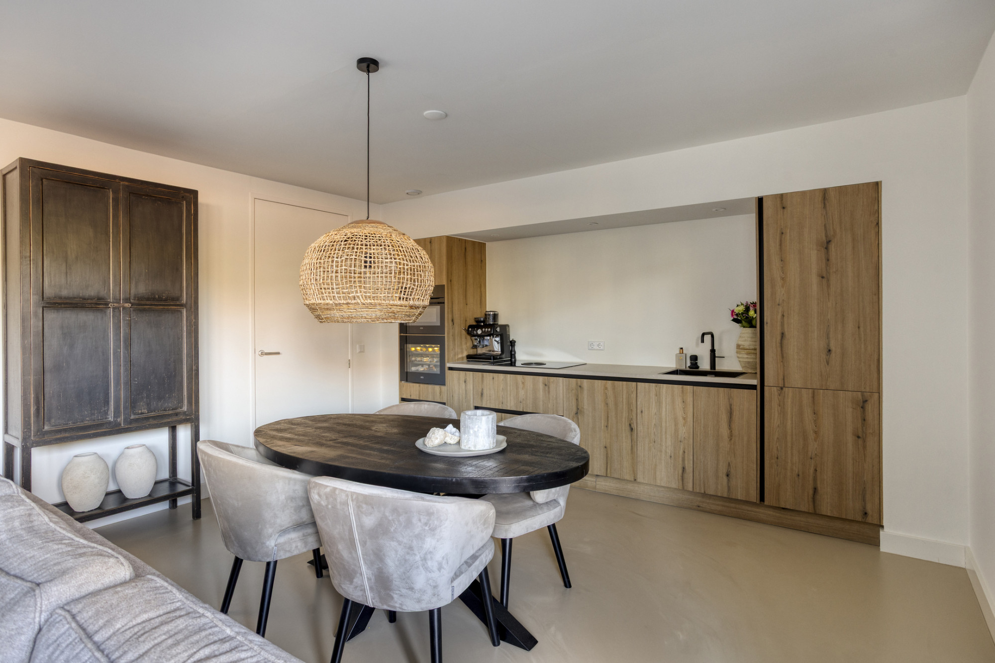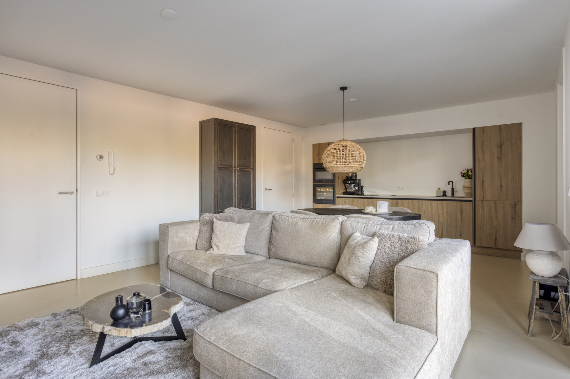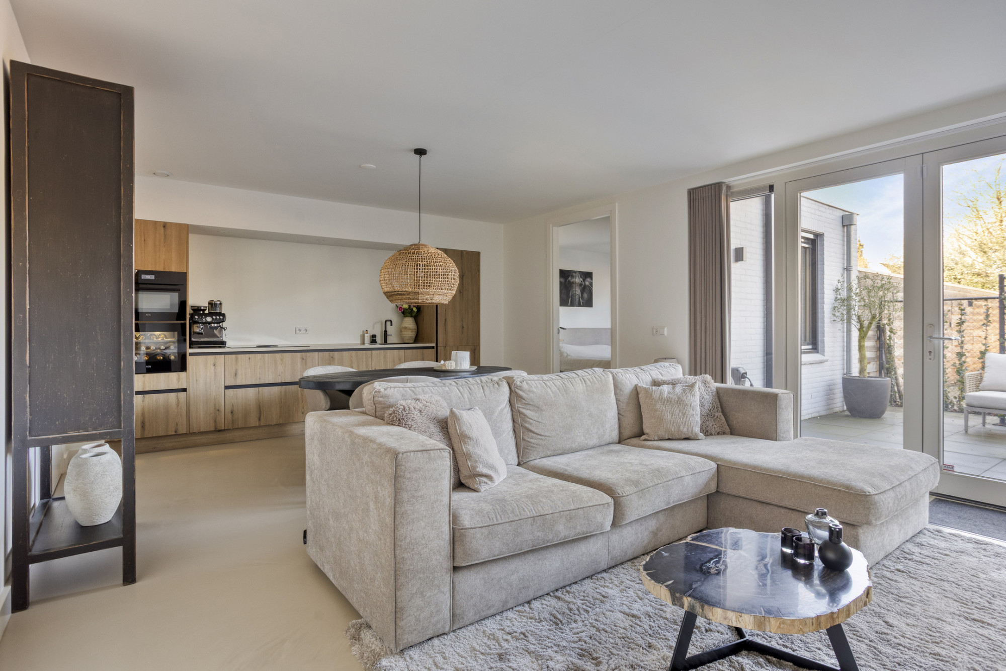 Binnen ervaar je meteen de luxe afwerking, met onder andere een strakke gietvloer, automatische gordijnen en een gezellige leefruimte. De open keuken is van alle gemakken voorzien en beschikt over een wijnklimaatkast, perfect voor de wijnliefhebber. In je eigen tuintje, bereikbaar via de dubbele tuindeuren, kun je perfect van de buitenlucht genieten.
