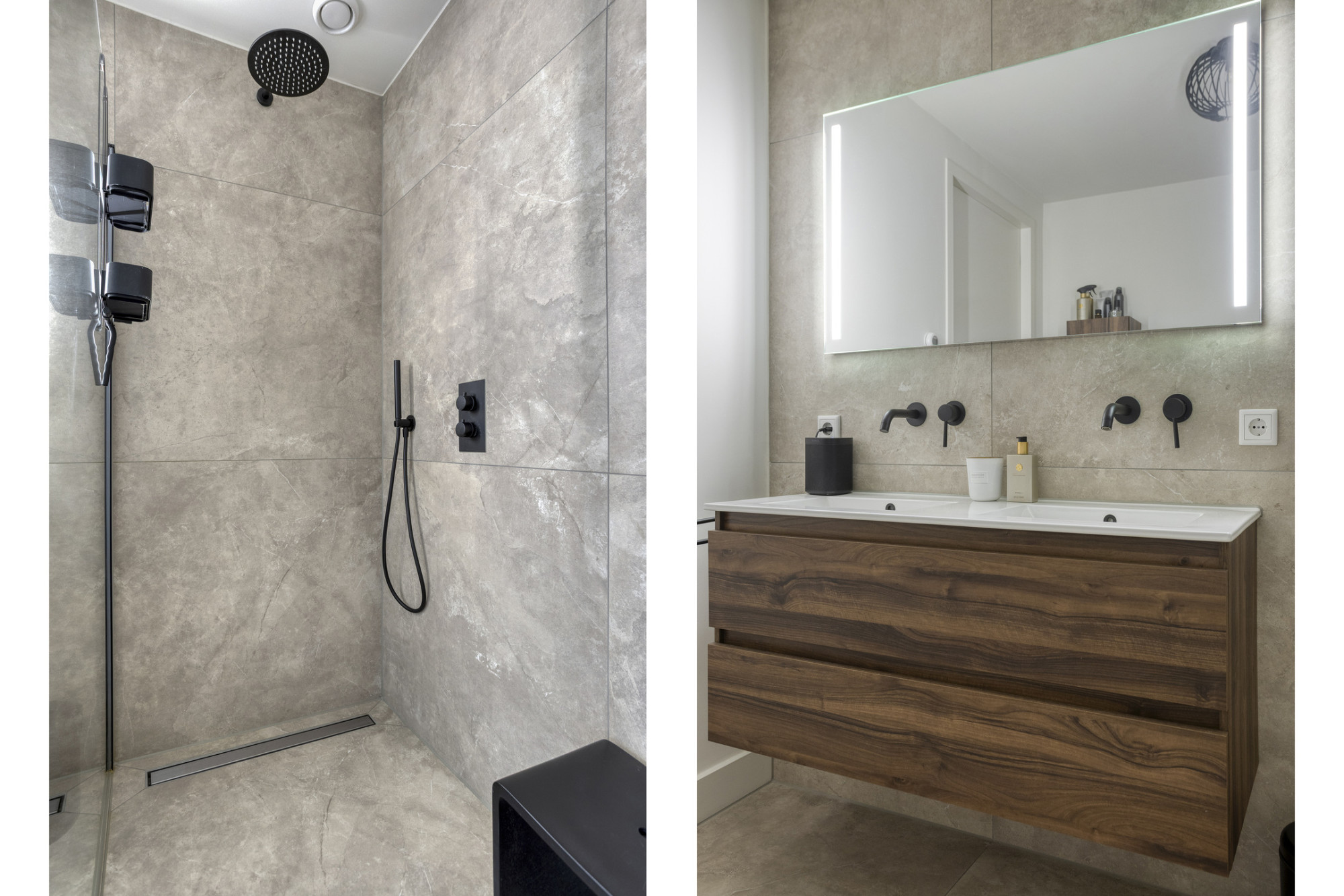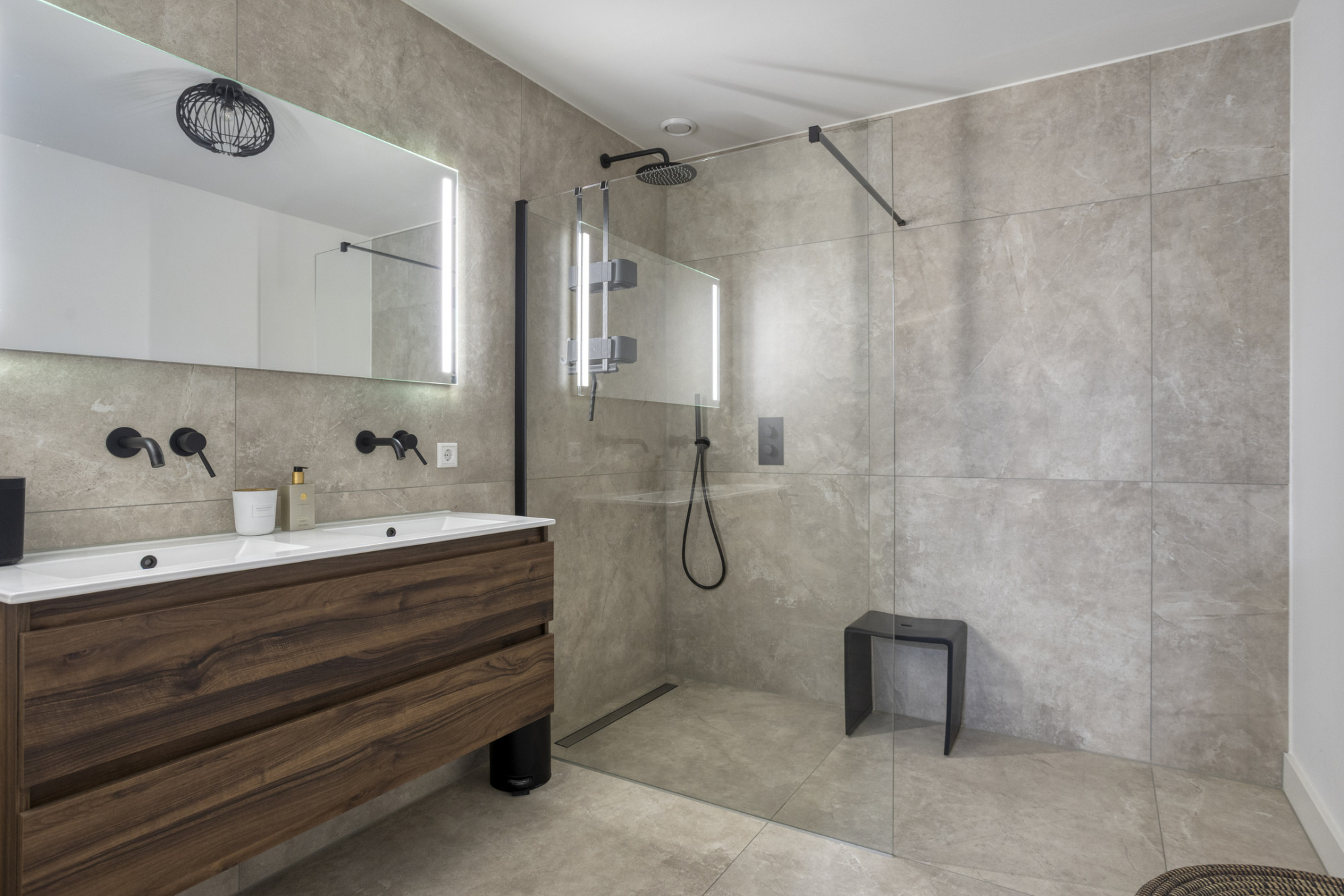 - Fraaie badkamer met dubbele wastafel en inloopdouche;
