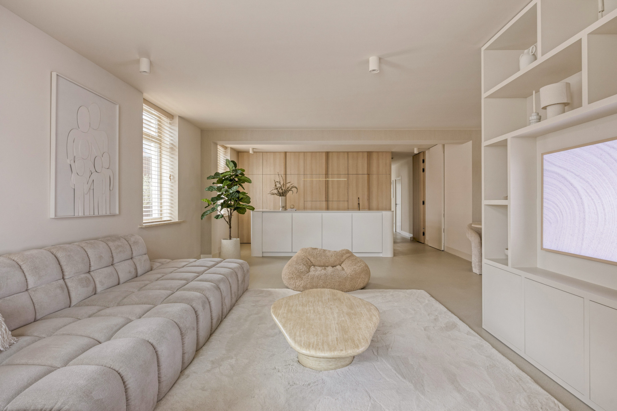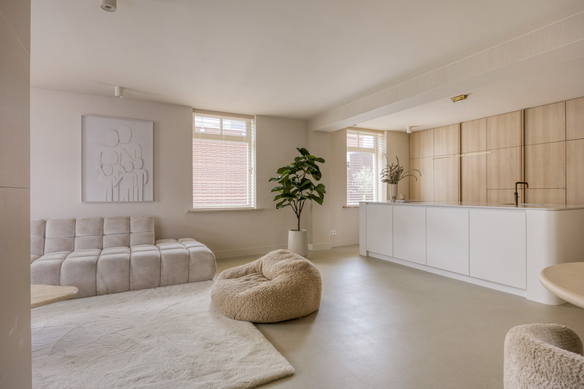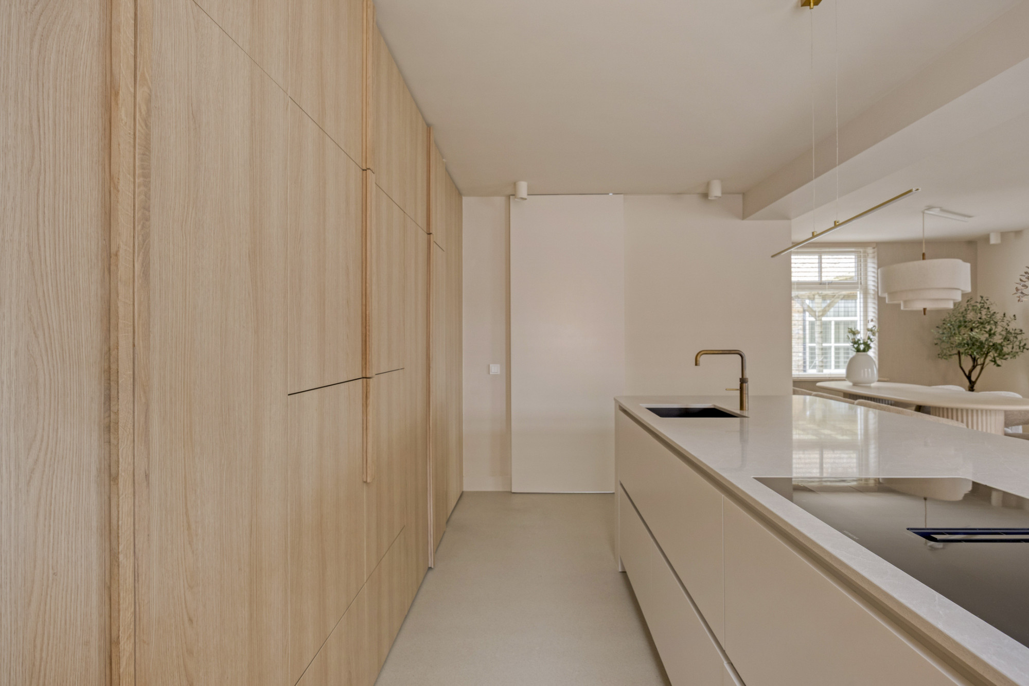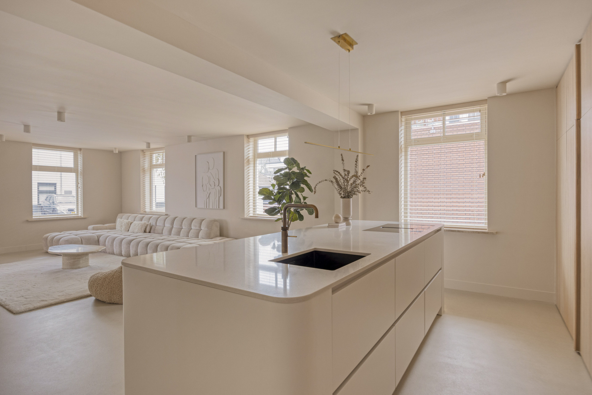 Bij binnenkomst ervaar je meteen de luxe uitstraling: een prachtige troffelvloer en fraaie details zetten de toon. De royale woonkamer is heerlijk licht dankzij de vele ramen en staat in verbinding met de open keuken. Deze keuken beschikt over moderne apparatuur, veel werk- en kastruimte en is een fijne plek voor een snelle maaltijd of uitgebreide diners. Alles is met oog voor detail afgewerkt en dat zie je ook terug in deze fantastische keuken.