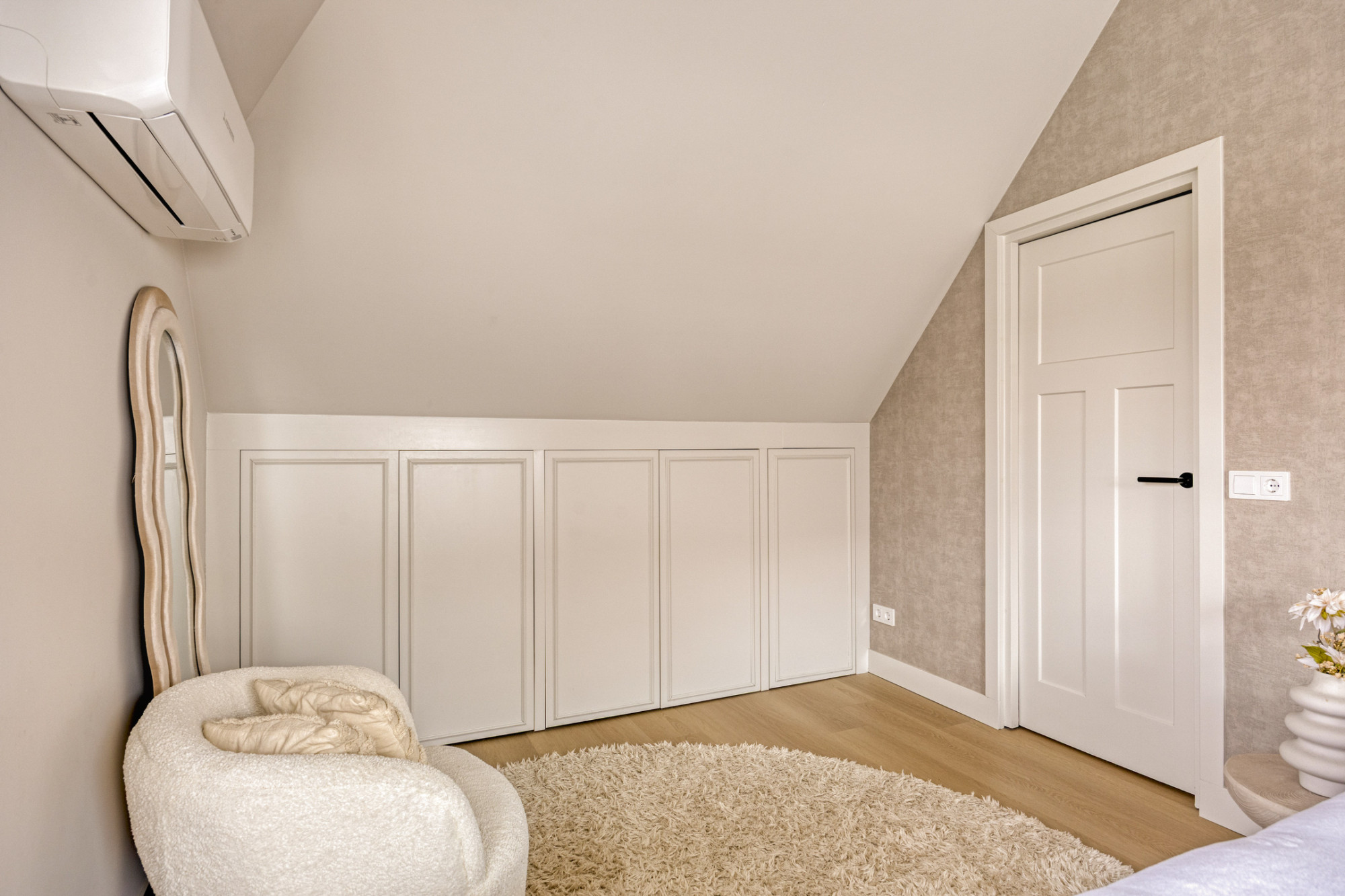 Het huis telt maar liefst zes slaapkamers, verdeeld over twee woonlagen. Op de begane grond bevinden zich twee slaapkamers én een moderne badkamer, volledig uitgerust met een ligbad, wastafel, toilet en inloopdouche, waardoor levensloopbestendig wonen mogelijk is. Daarnaast is er een aparte wasruimte en zijn er door het hele huis veel inbouwkasten, waardoor opbergruimte nooit een probleem is.