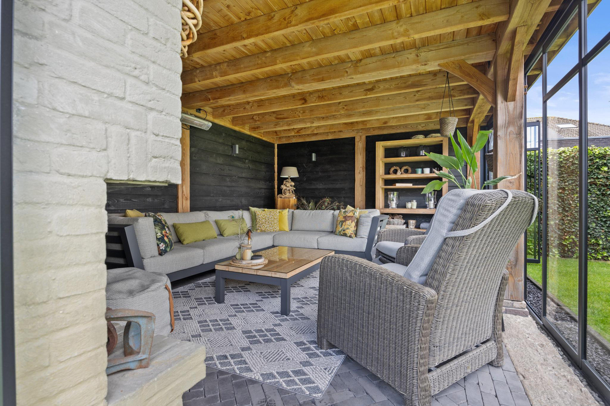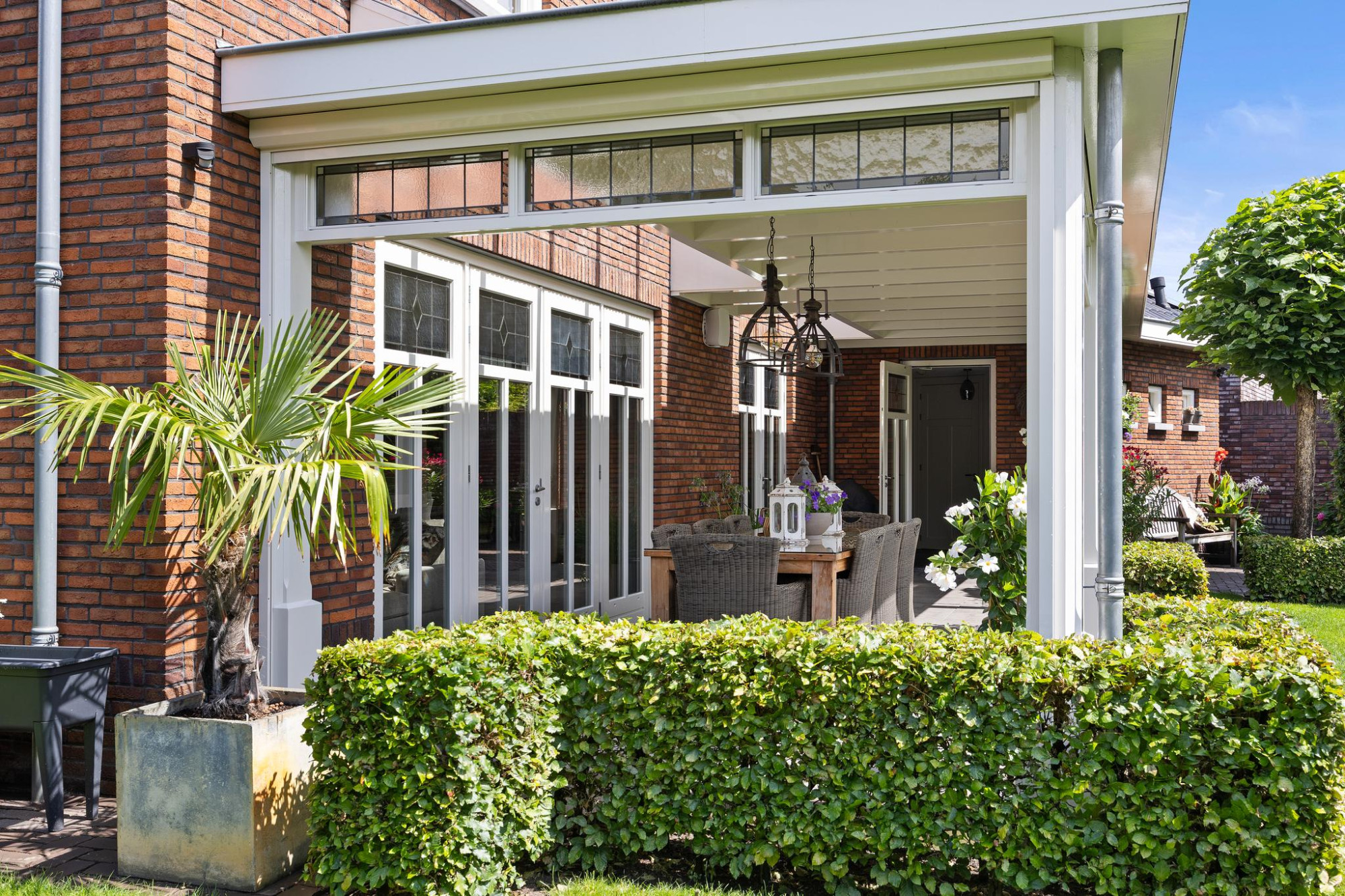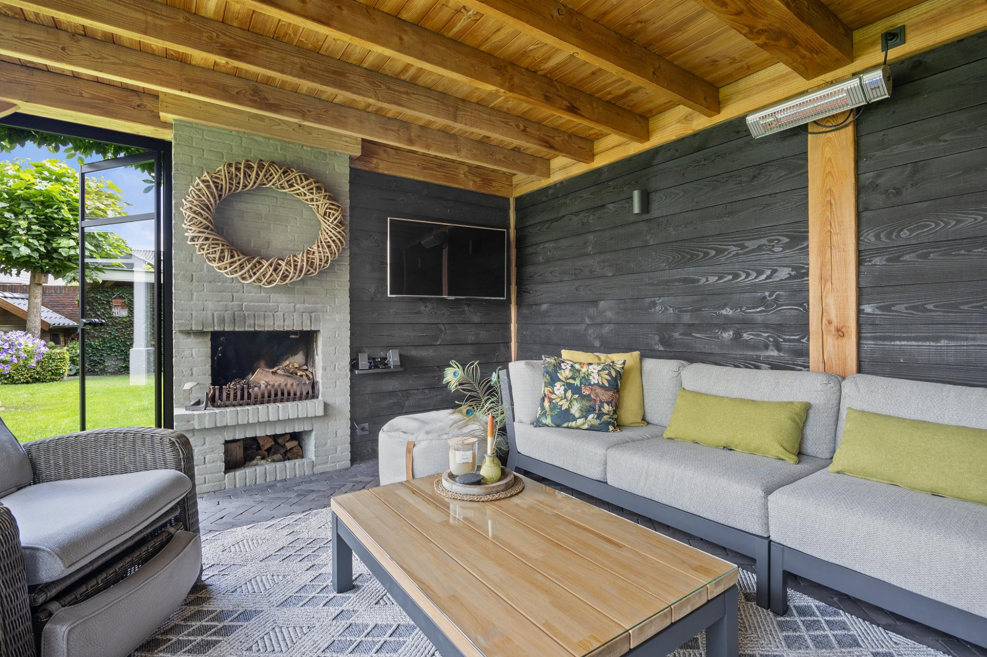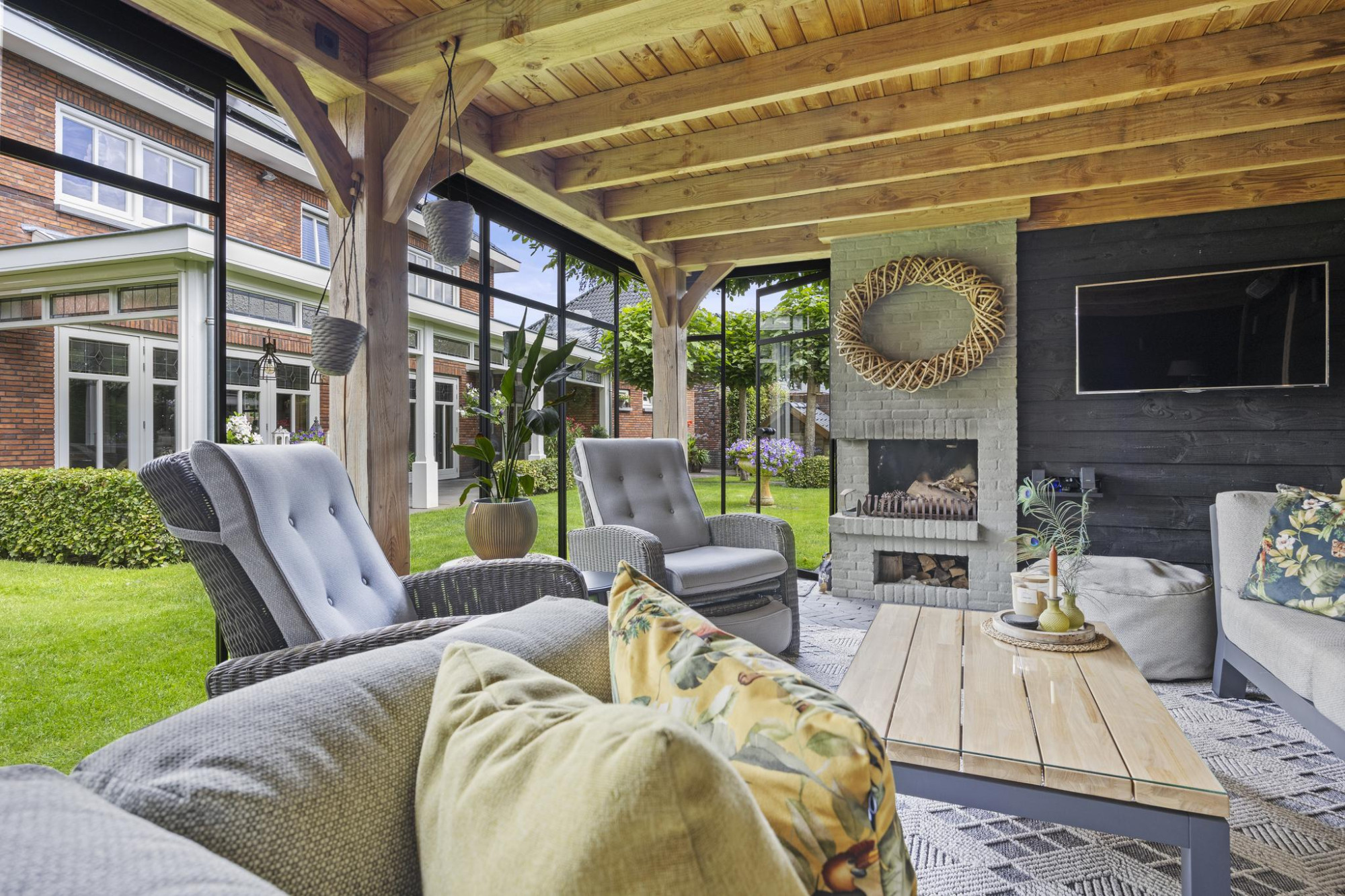 Buiten is minstens zo indrukwekkend als binnen. De tuin op het zuiden is royaal, groen en perfect gepositioneerd voor zonaanbidders. Onder de stijlvolle overkapping of in de volledig afsluitbare tuinkamer met open haard zit je altijd goed. Of het nu zomer is of herfst, hier geniet je elk seizoen van het buitenleven.