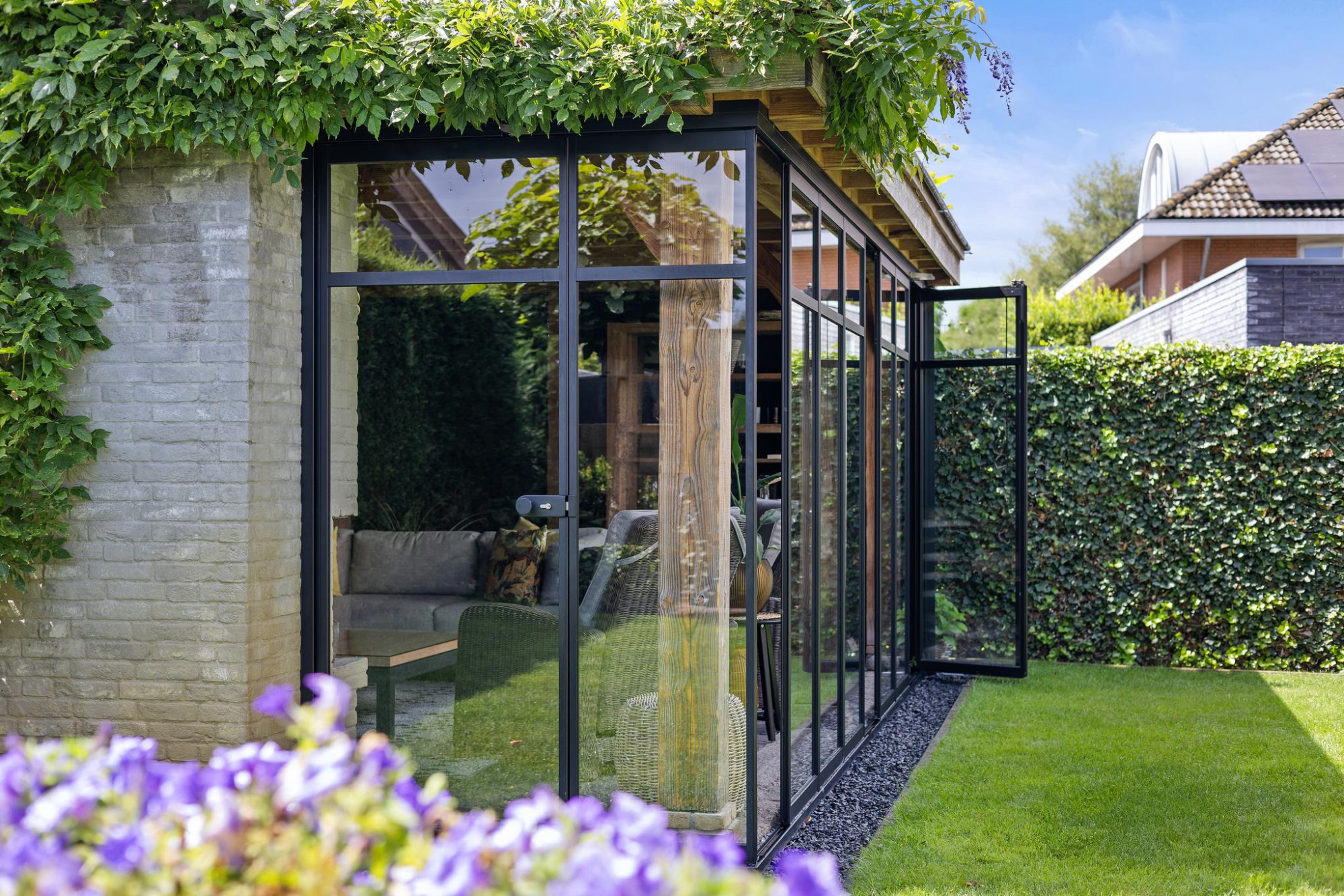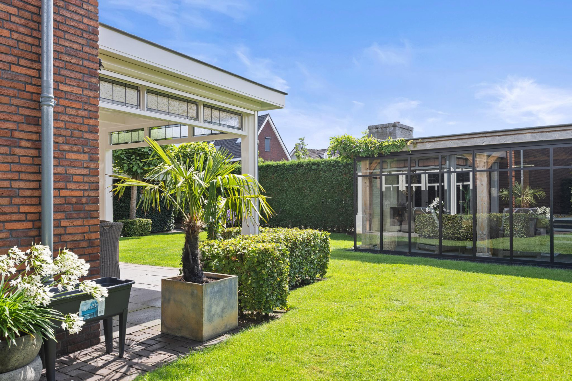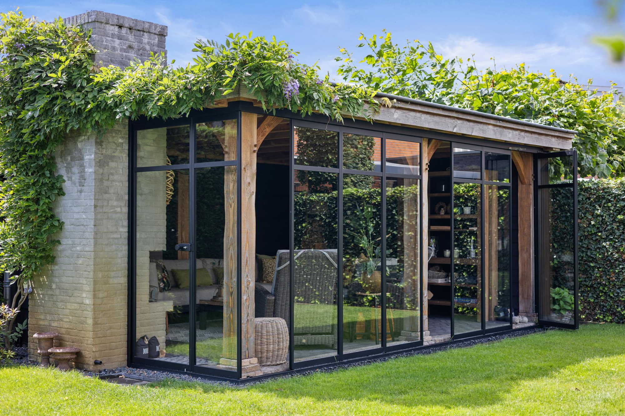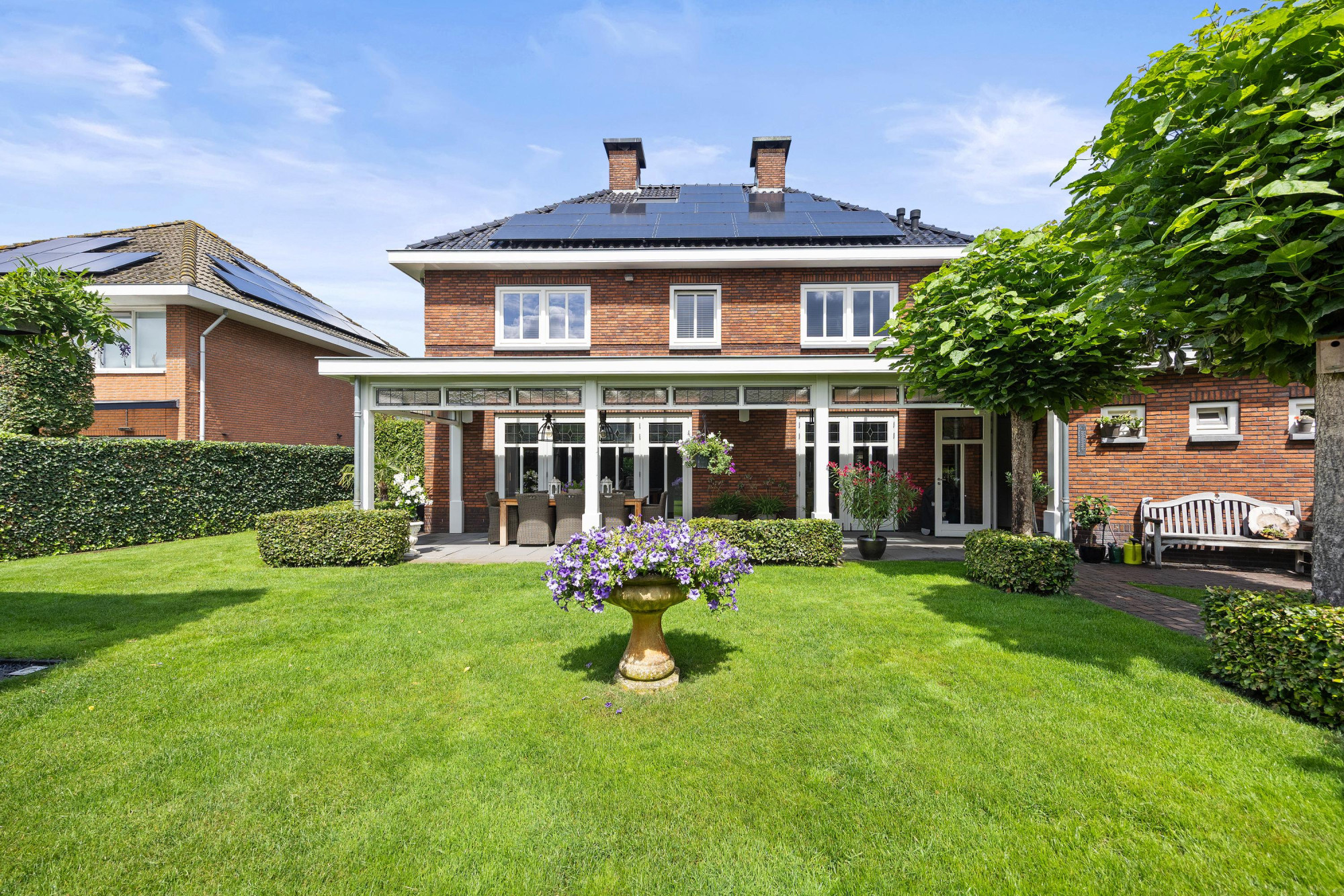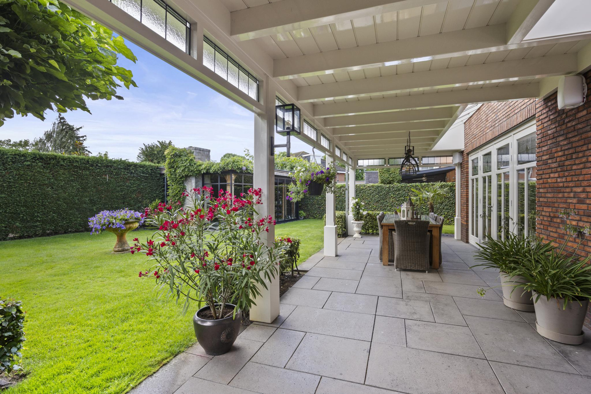 Buiten is minstens zo indrukwekkend als binnen. De tuin op het zuiden is royaal, groen en perfect gepositioneerd voor zonaanbidders. Onder de stijlvolle overkapping of in de volledig afsluitbare tuinkamer met open haard zit je altijd goed. Of het nu zomer is of herfst, hier geniet je elk seizoen van het buitenleven.
