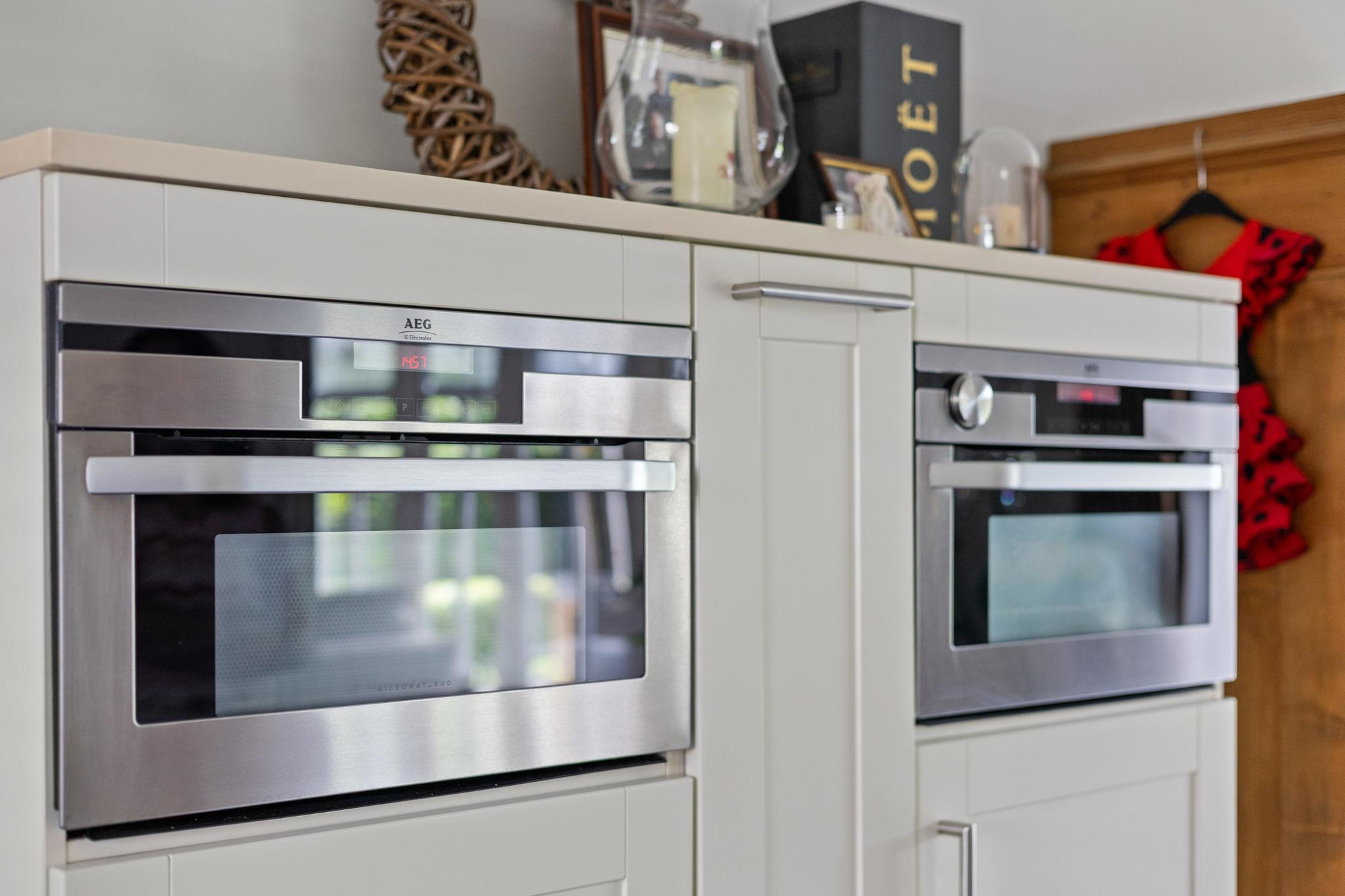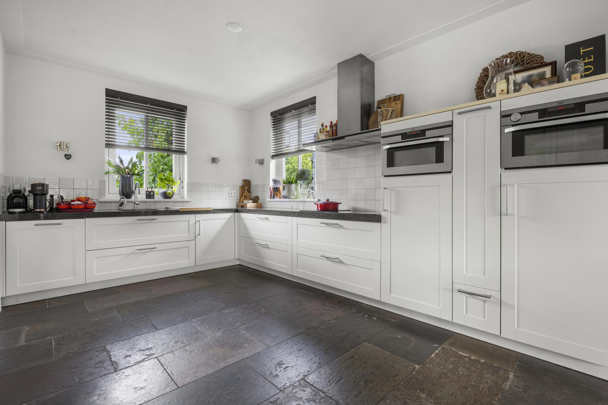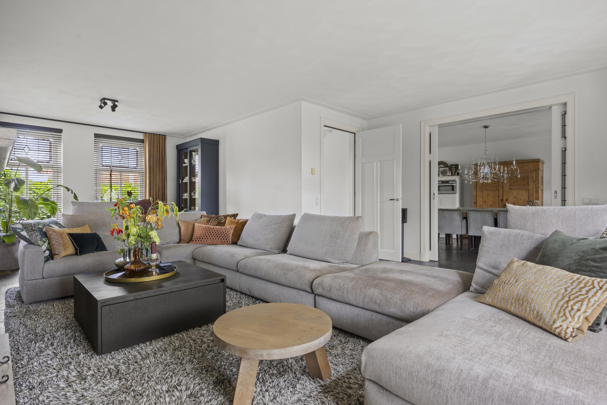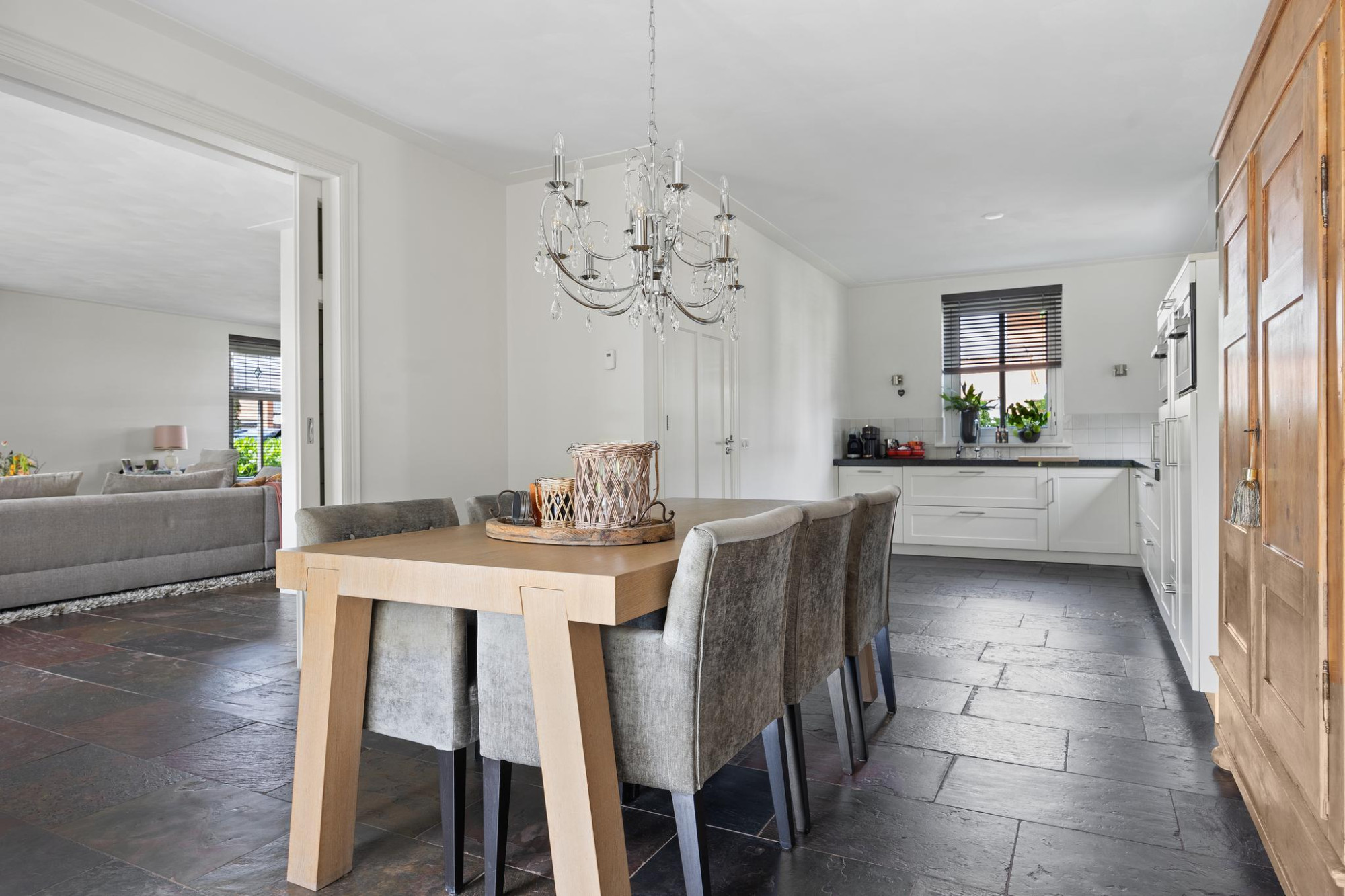 De royale, lichte woonkamer verwelkomt je met een warme open haard en dubbele deuren naar de tuin. En suite deuren verbinden deze fijne ruimte met de luxe leefkeuken, een ware droom voor kookliefhebbers en iedereen die houdt van gezellig tafelen met vrienden en familie. In de keuken vind je een inductiekookplaat met ingebouwde wok, een kokend waterkraan en natuurlijk meer dan genoeg werk- en opbergruimte. De dubbele deuren openen naar het terras onder de overkapping, waar je op warme dagen het binnenleven moeiteloos naar buiten verplaatst.