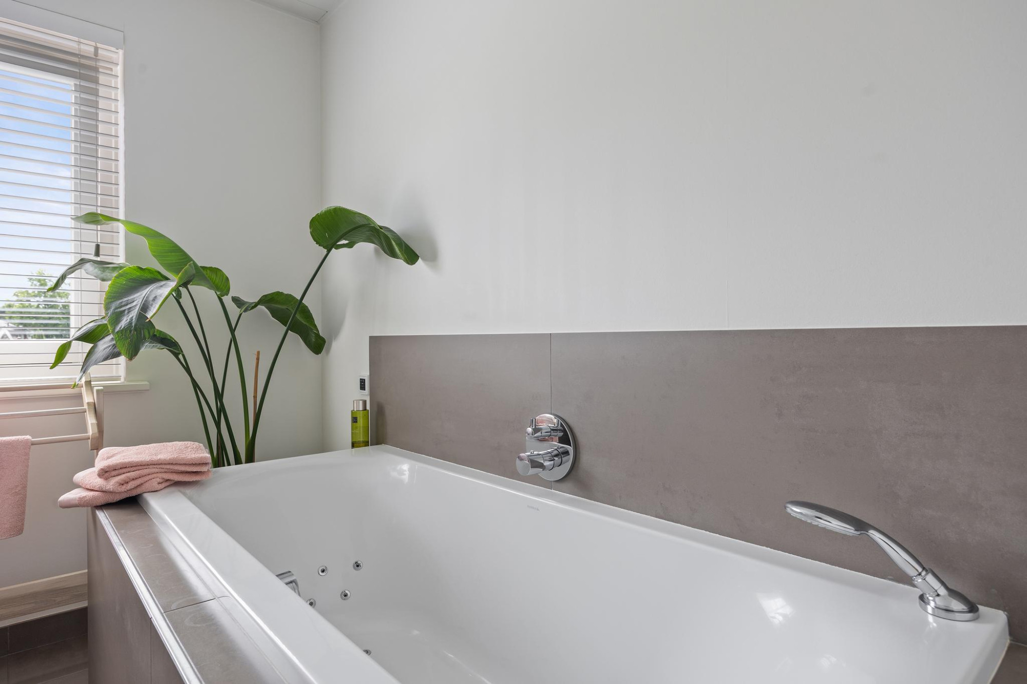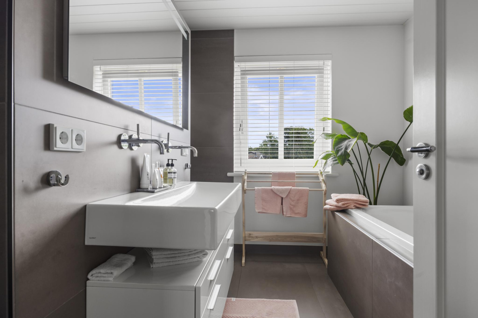 - Badkamer met ligbad, dubbele wastafel en inloopdouche met sunshower;
