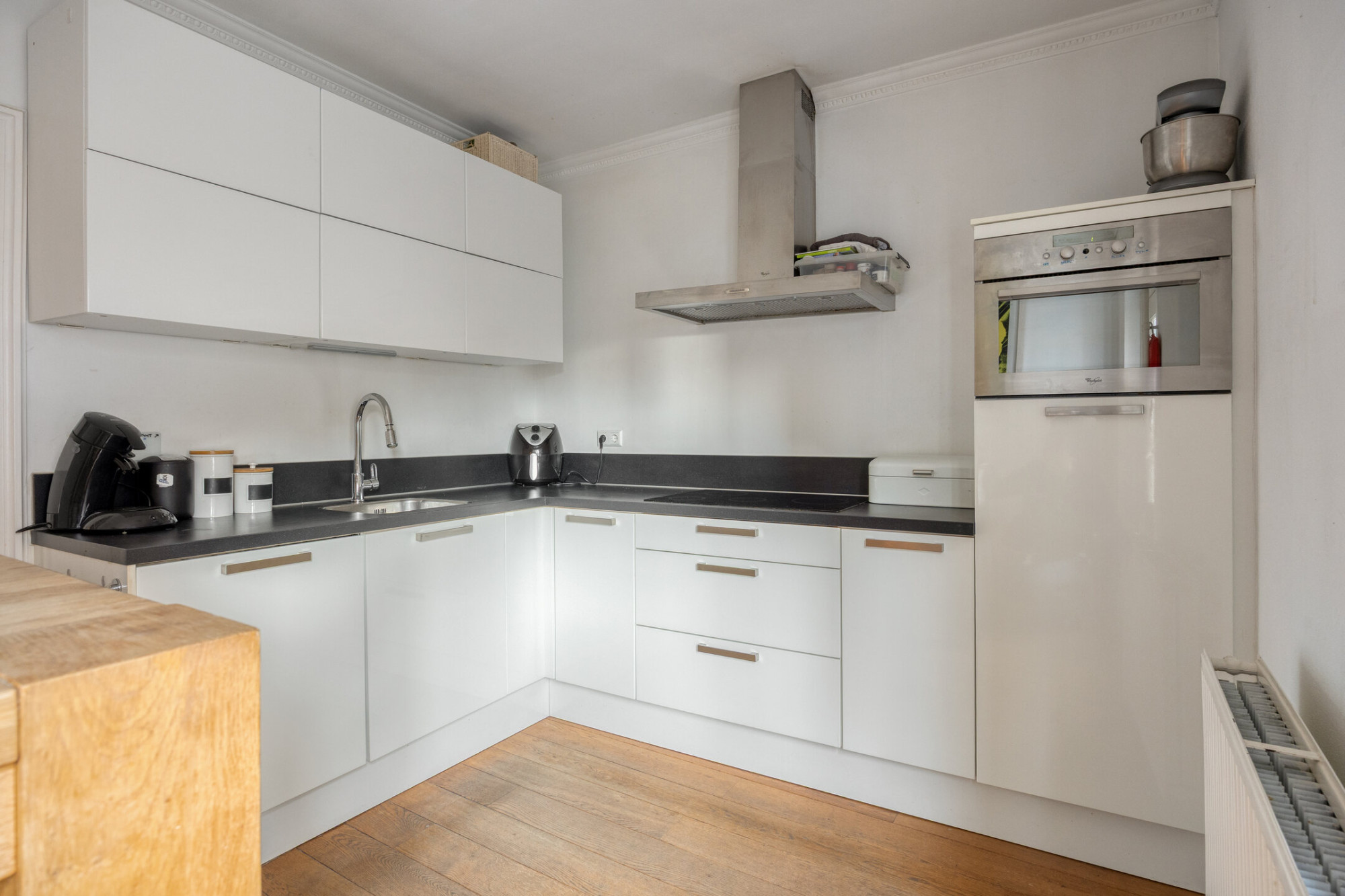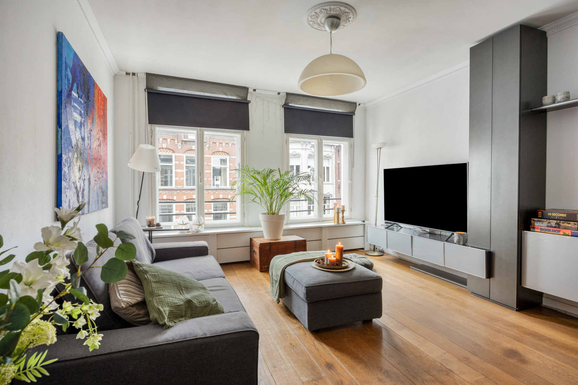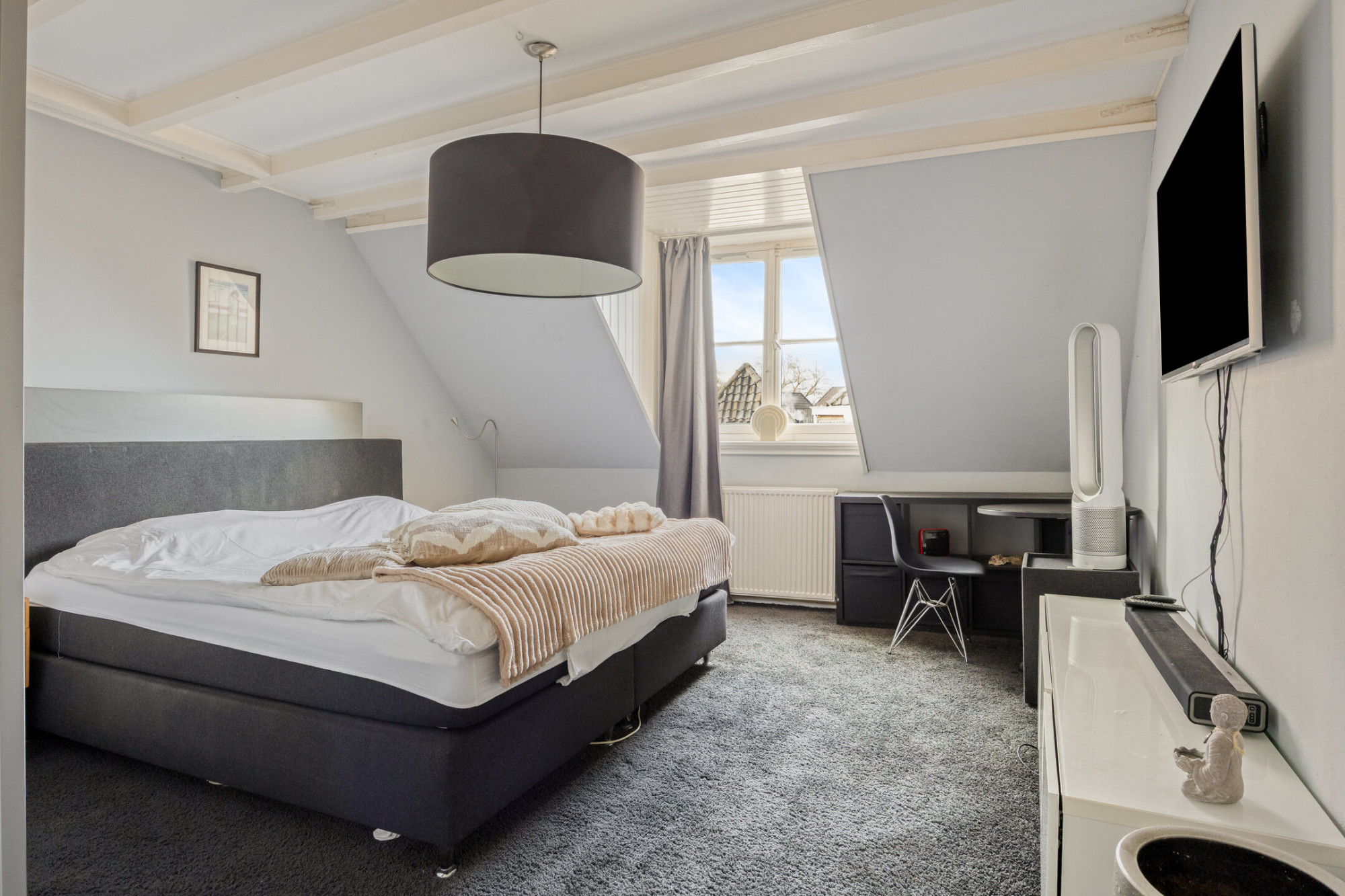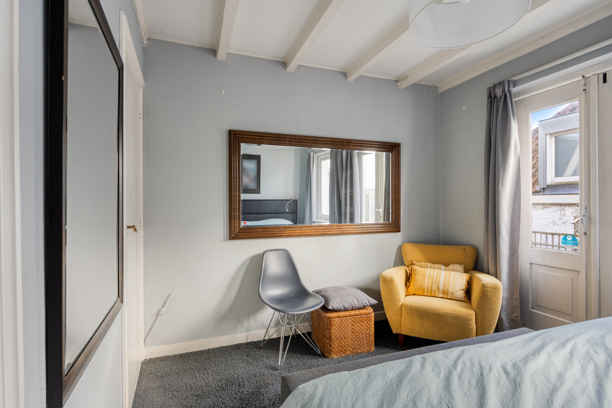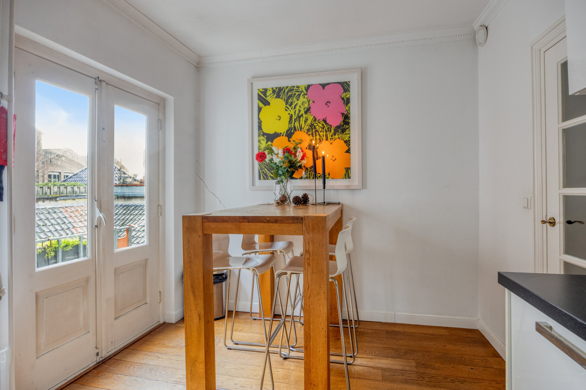 De maisonnette is verdeeld over twee woonlagen en biedt een sfeervolle woonkamer met fraai uitzicht en massief eiken vloer. De moderne keuken aan de achterzijde is compleet uitgerust en via openslaande deuren bereik je een Frans balkon voor extra licht en lucht. Op de verdieping bevinden zich twee slaapkamers, waaronder een royale kamer met walk-in-closet en een tweede slaapkamer met directe toegang tot het dakterras, evenals een complete badkamer.