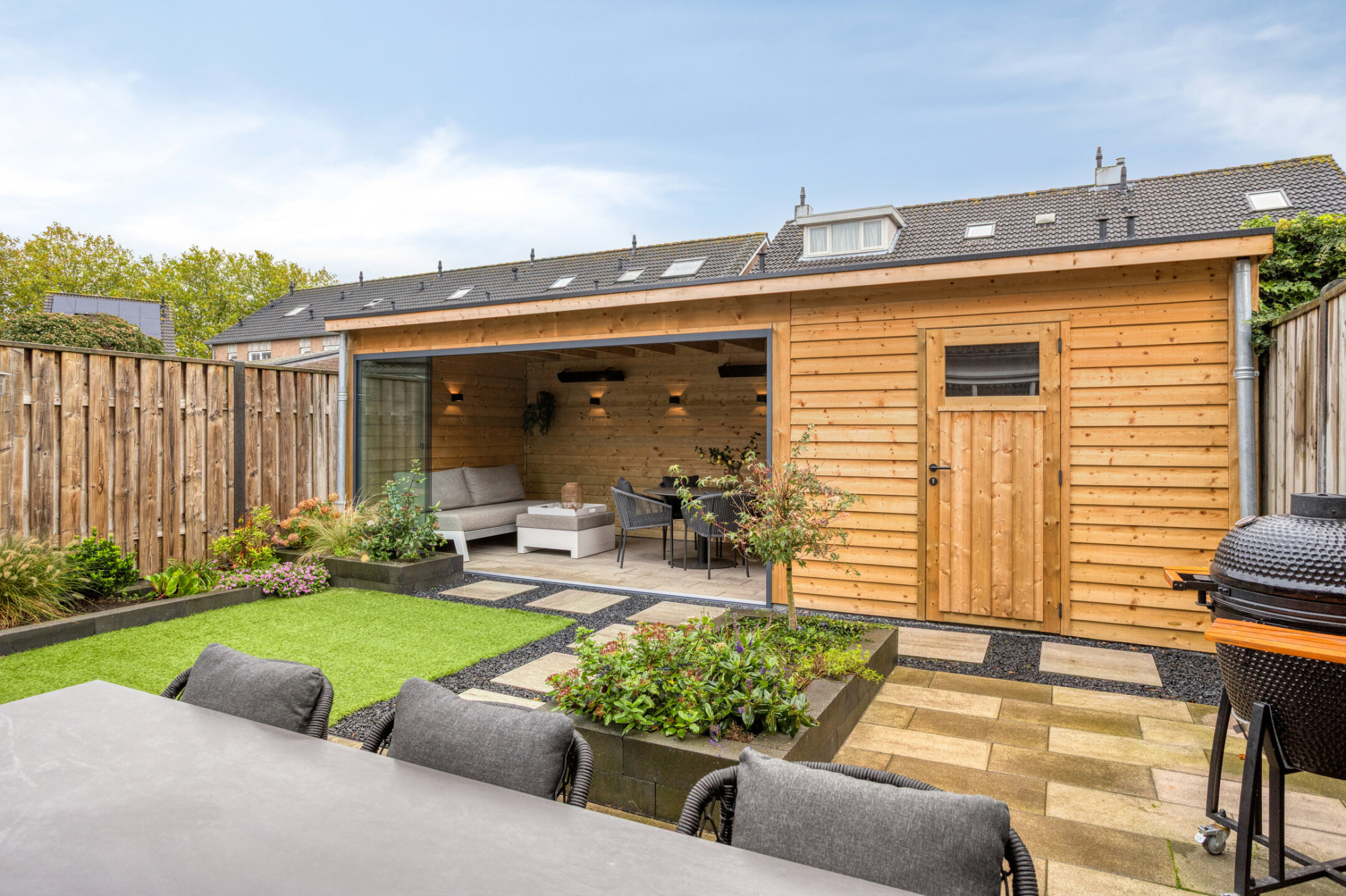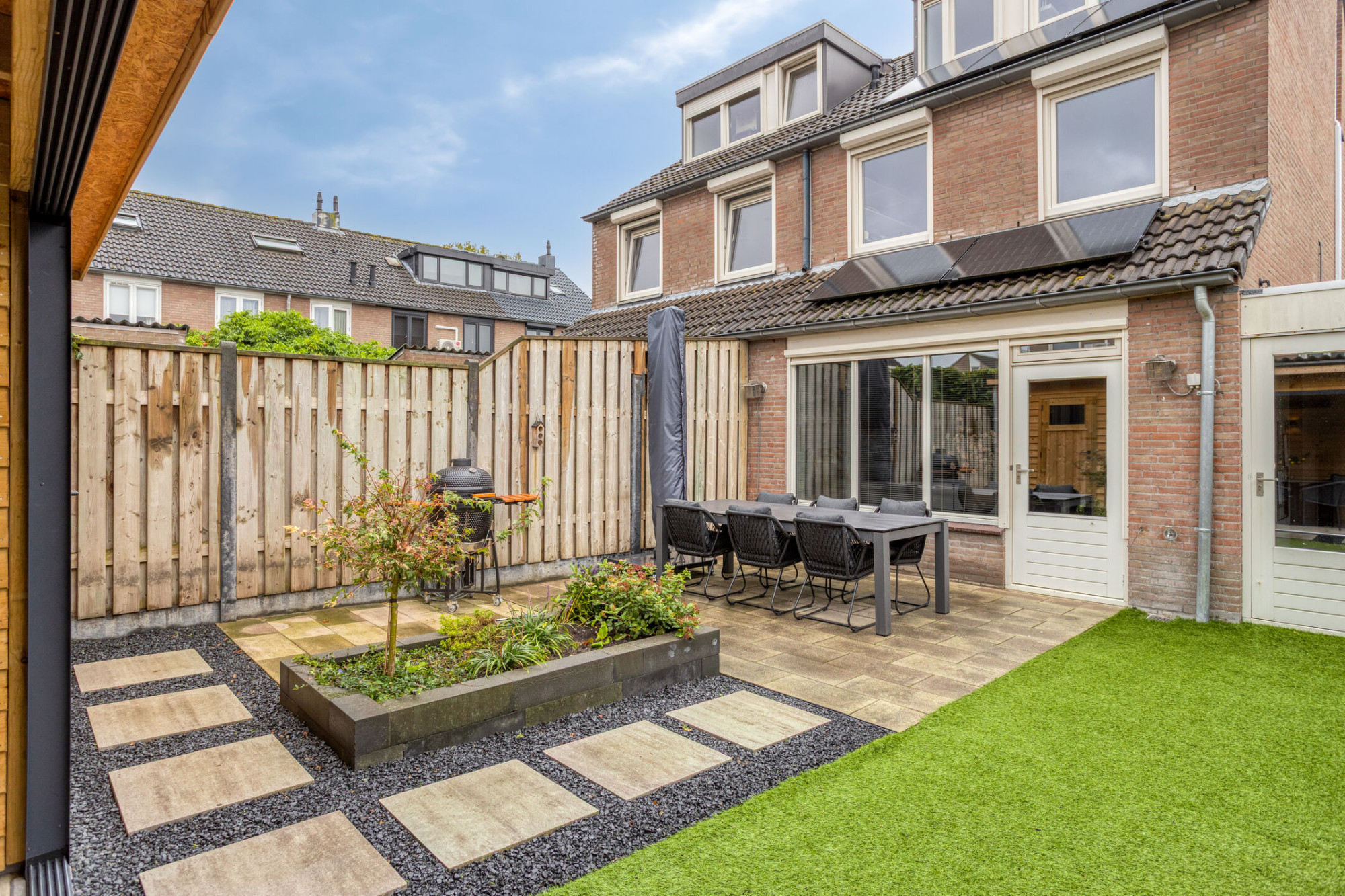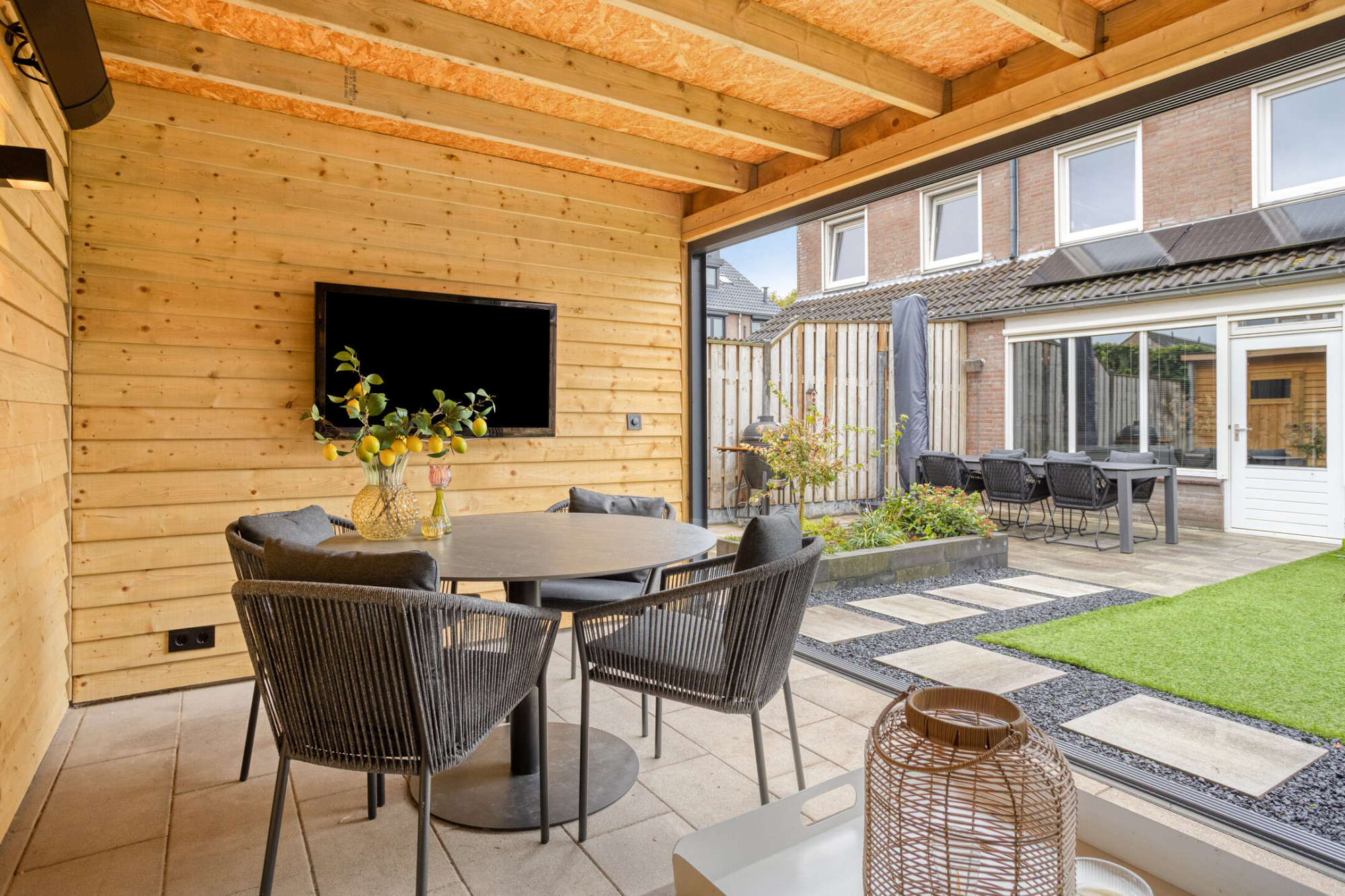 - Fantastische tuin met overkapping die af te sluiten is door middel van een schuifwand;