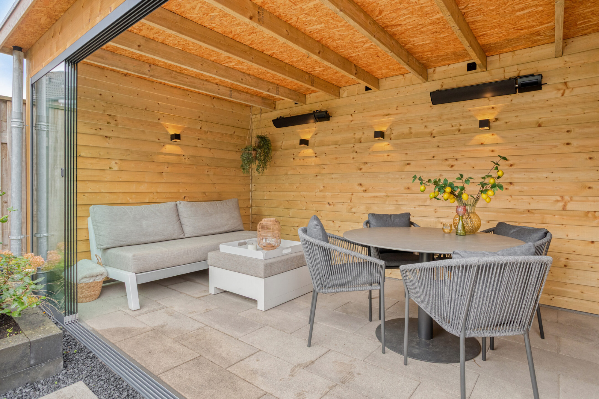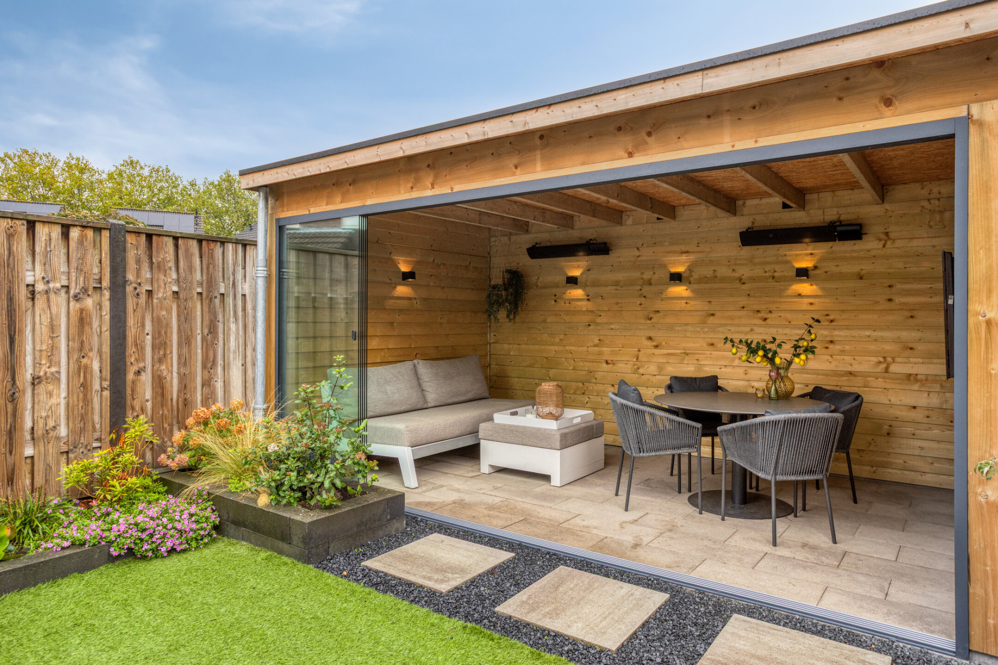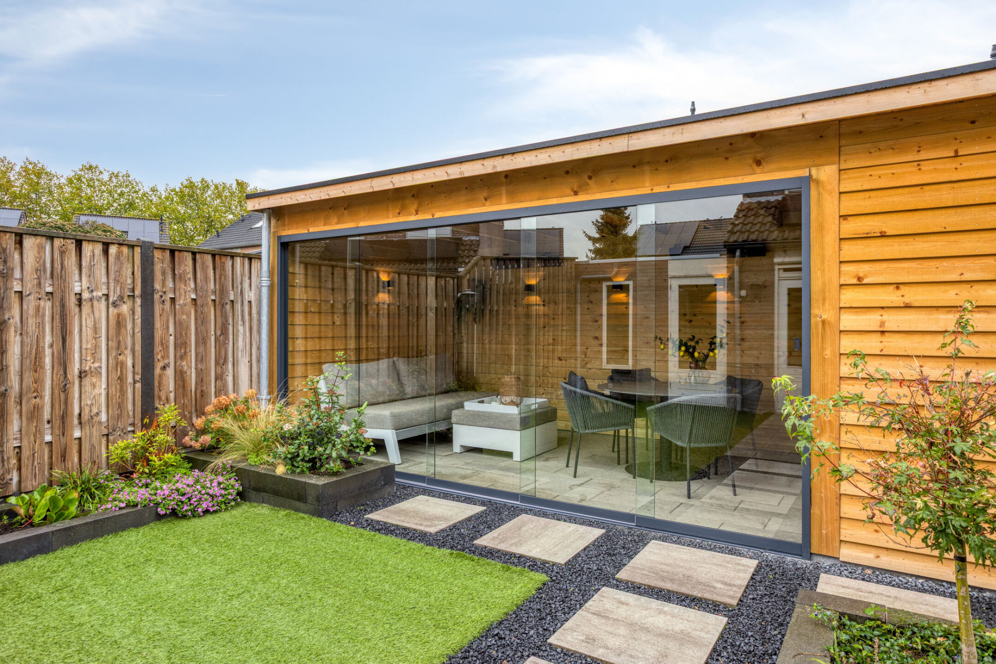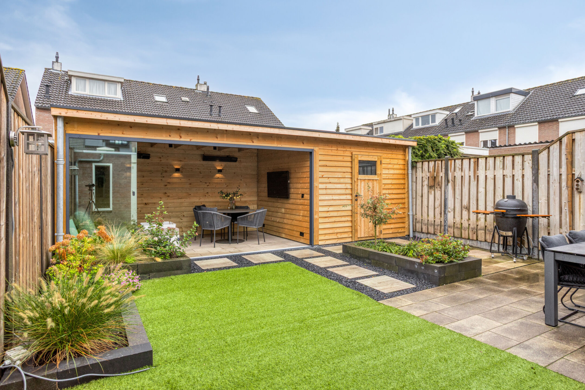 - Fantastische tuin met overkapping die af te sluiten is door middel van een schuifwand;