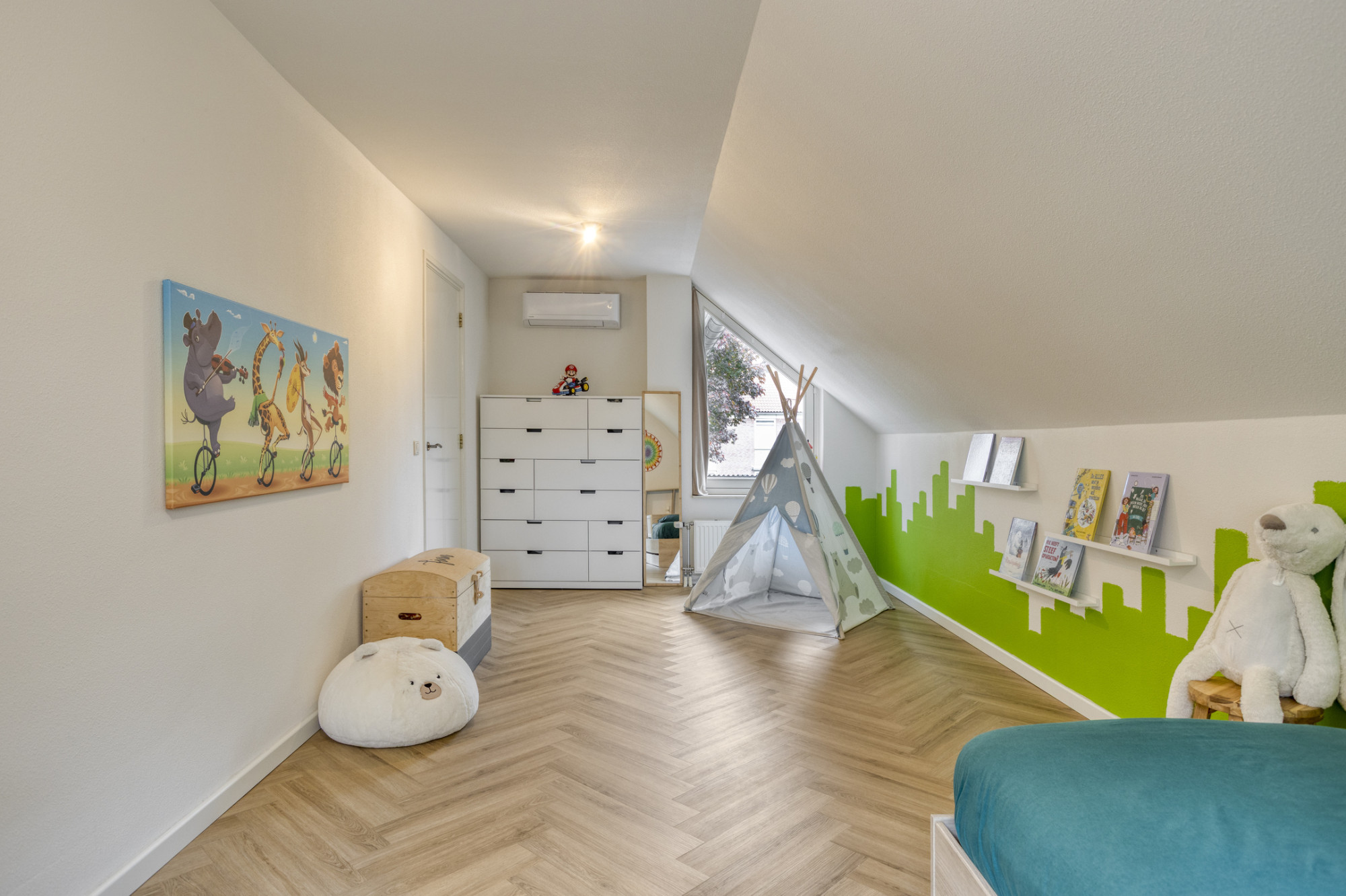 Boven vind je vier ruime slaapkamers, waaronder een master bedroom met walk-in closet. De badkamer, eveneens vernieuwd in 2022, is een oase van rust met een heerlijk ligbad, ruime inloopdouche en modern wastafelmeubel. De zolder biedt volop bergruimte of ruimte voor toekomstige plannen.
