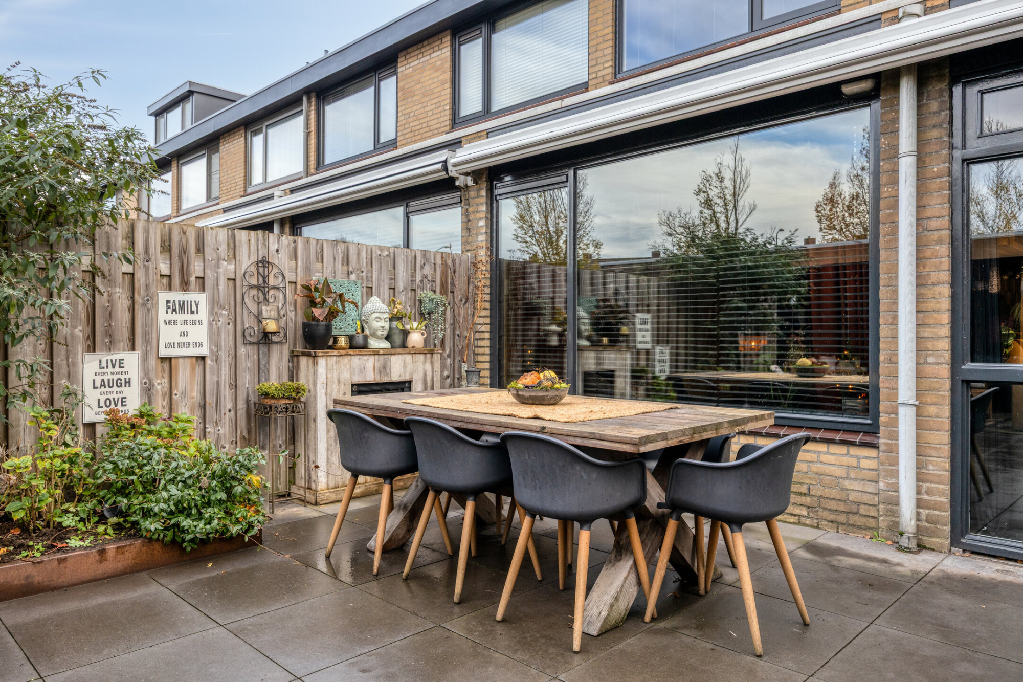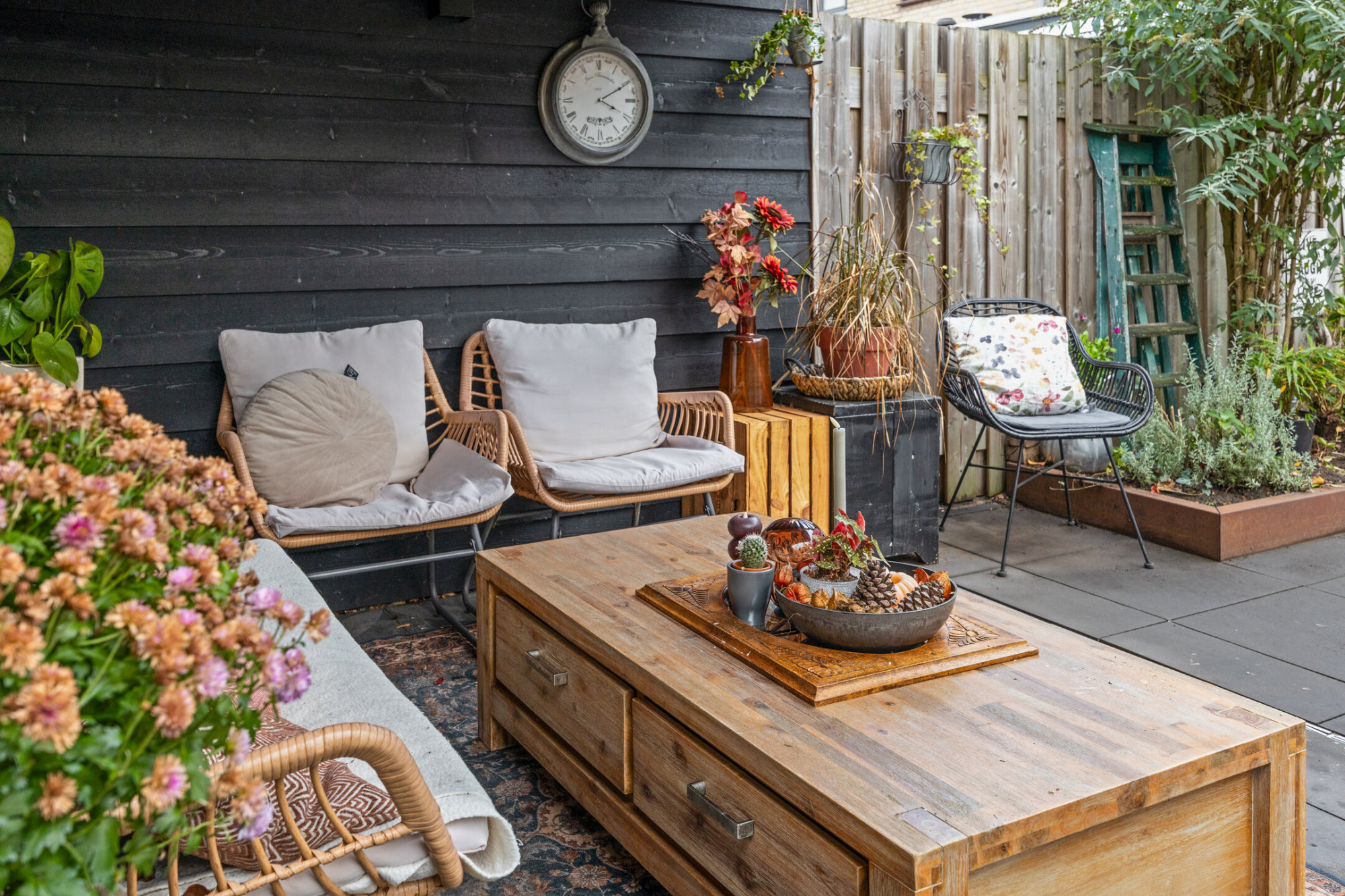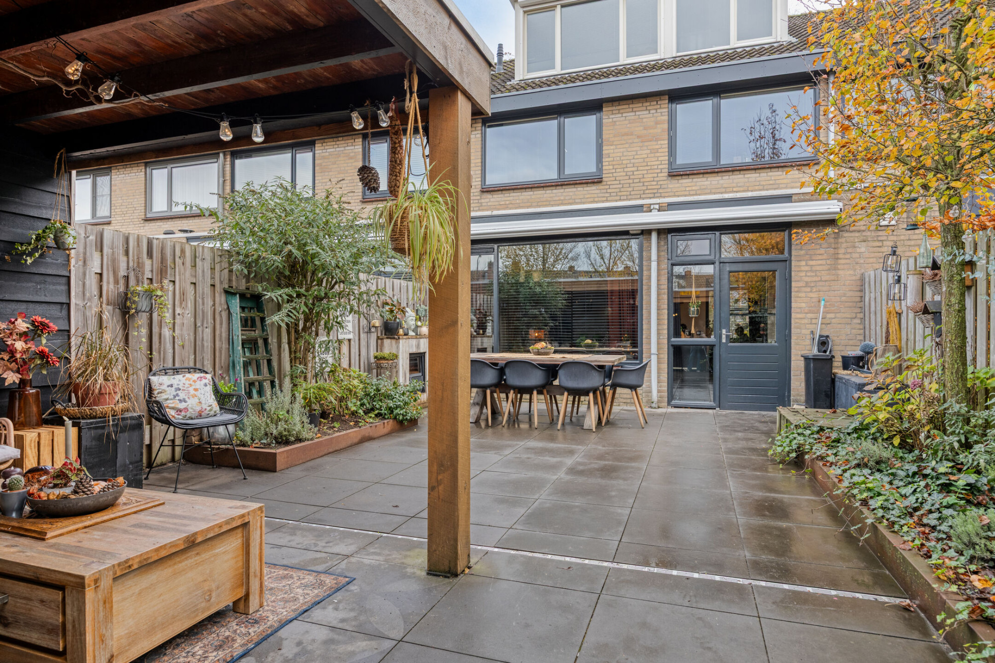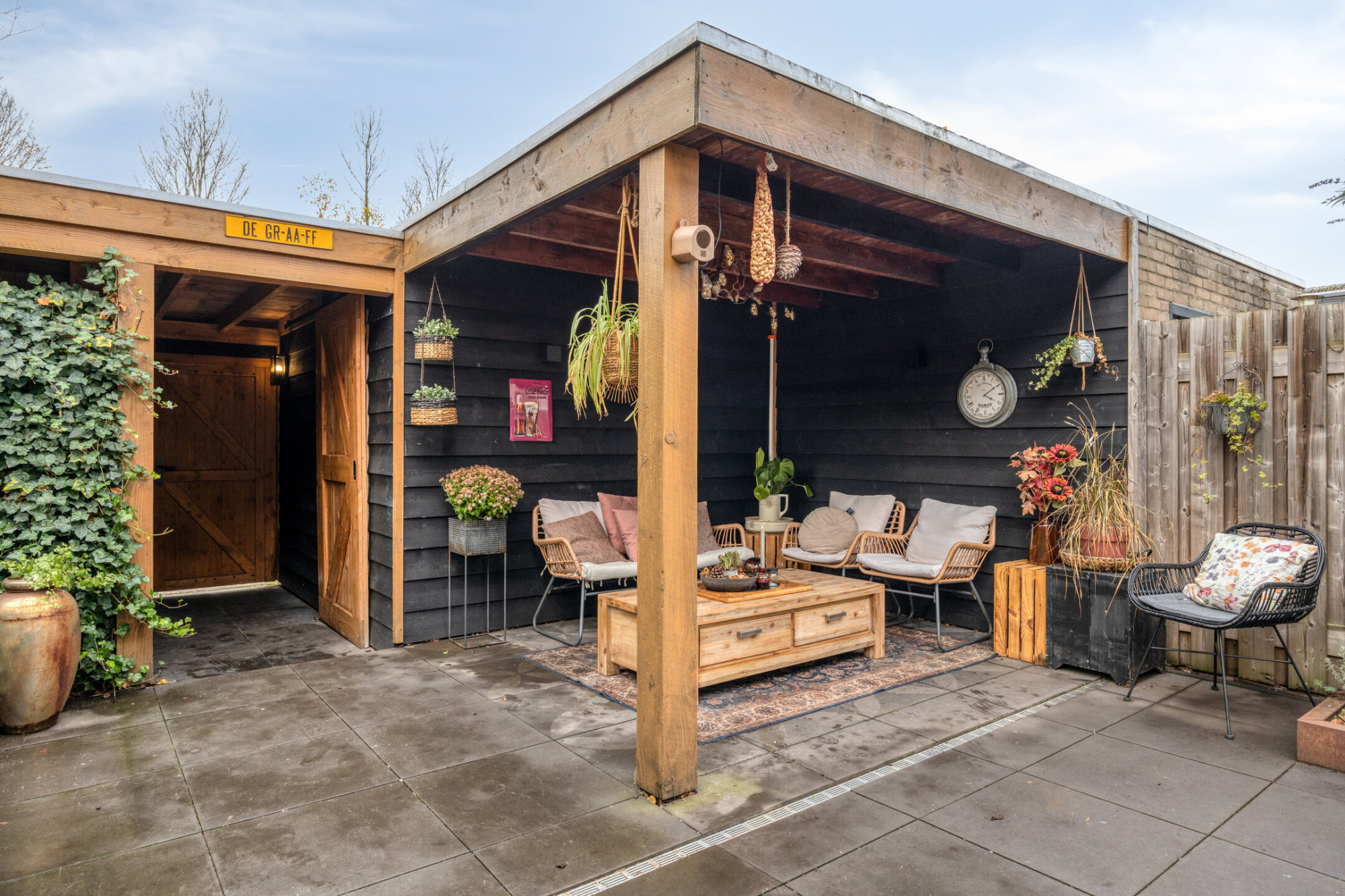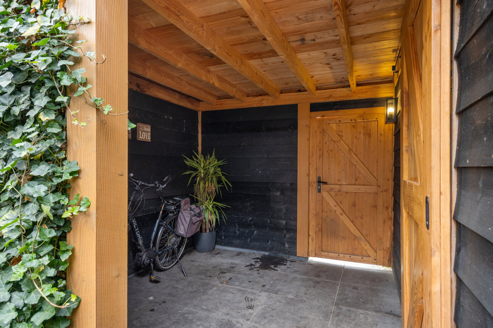De achtertuin, gelegen op het noordwesten, is een heerlijke plek om na een drukke dag tot rust te komen. Dankzij de royale overkapping geniet je hier bijna het hele jaar door van het buitenleven. Verder vind je in de tuin een praktische berging, ideaal voor het opbergen van fietsen, tuingereedschap of andere spullen die je graag uit het zicht houdt