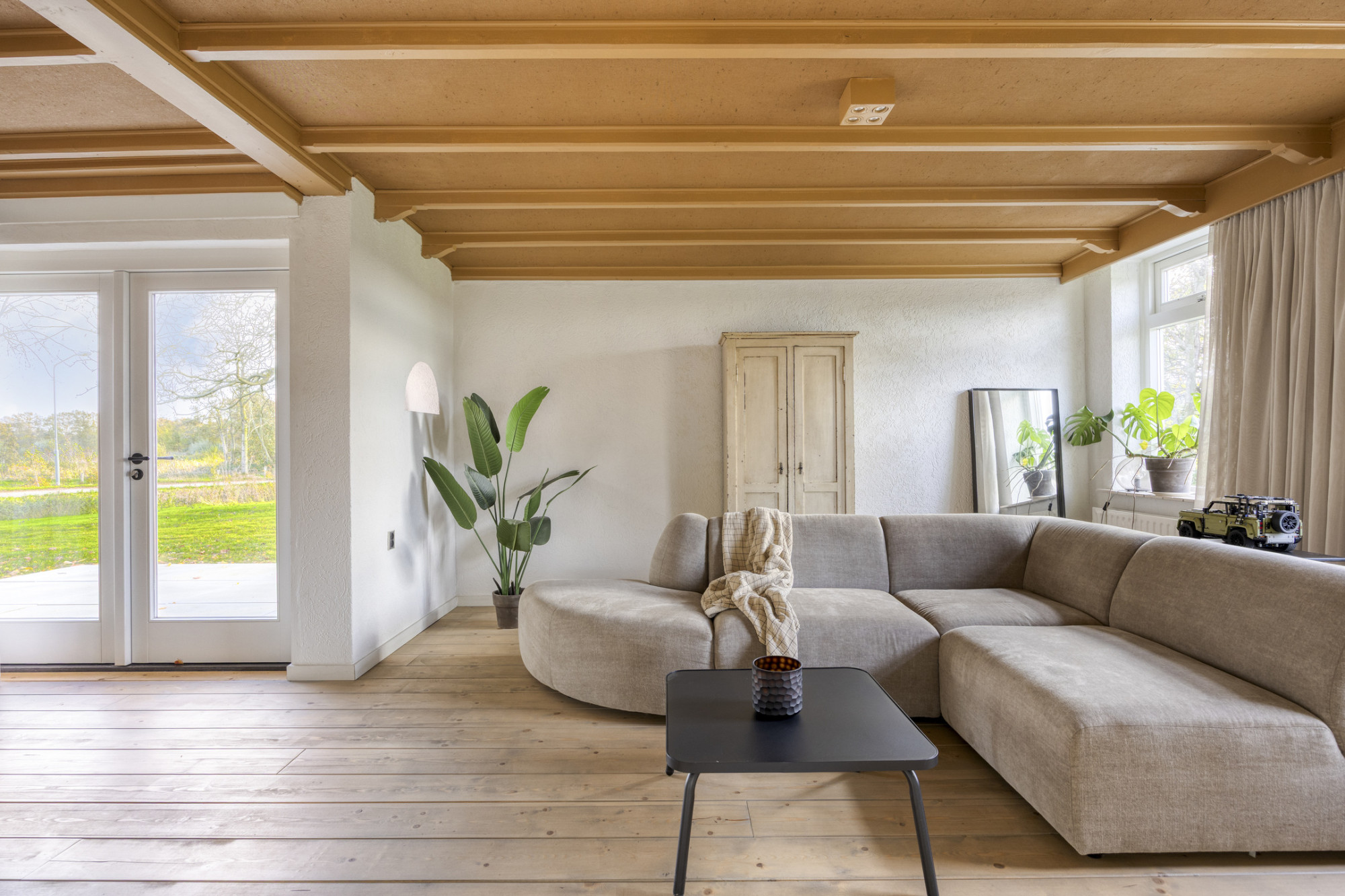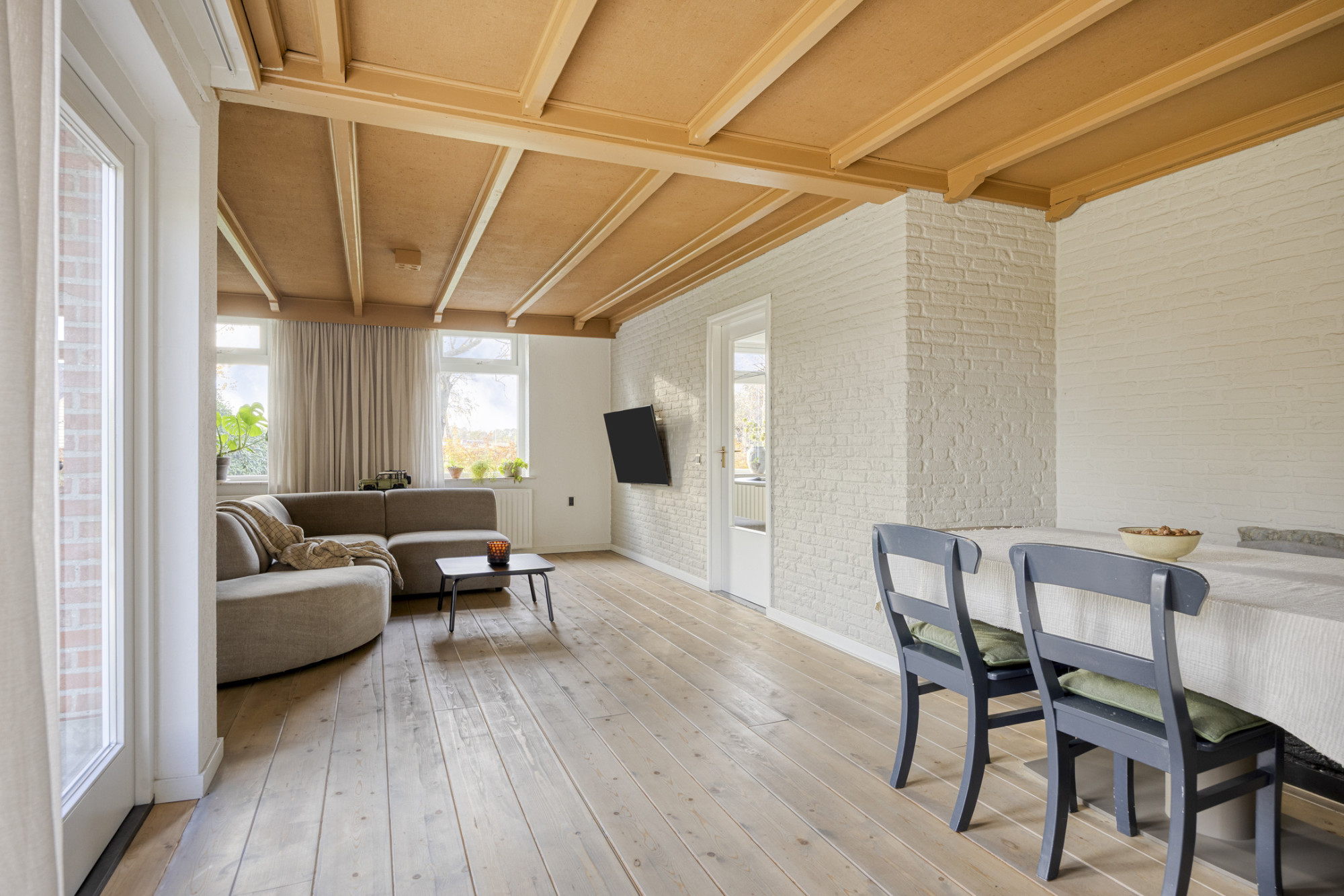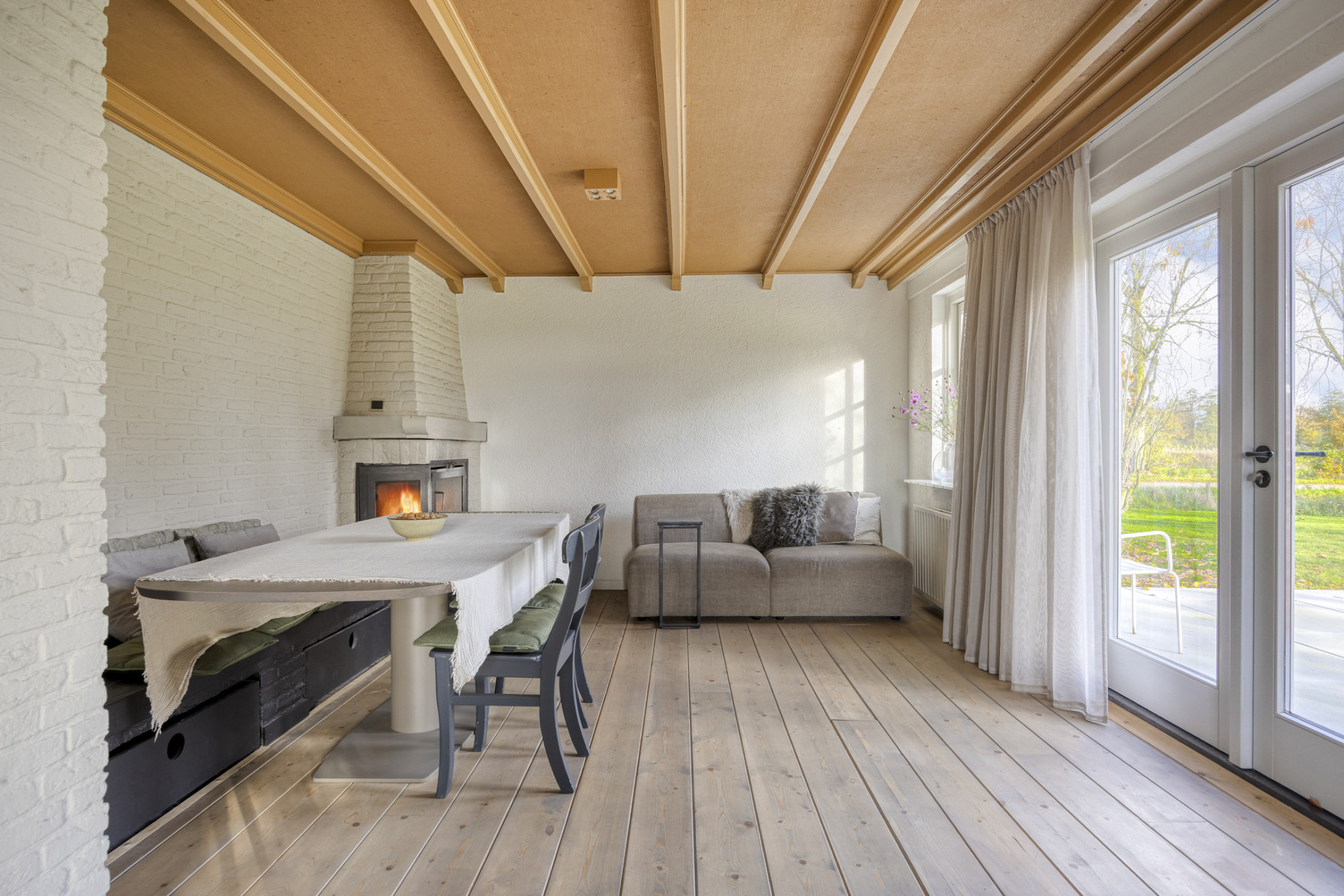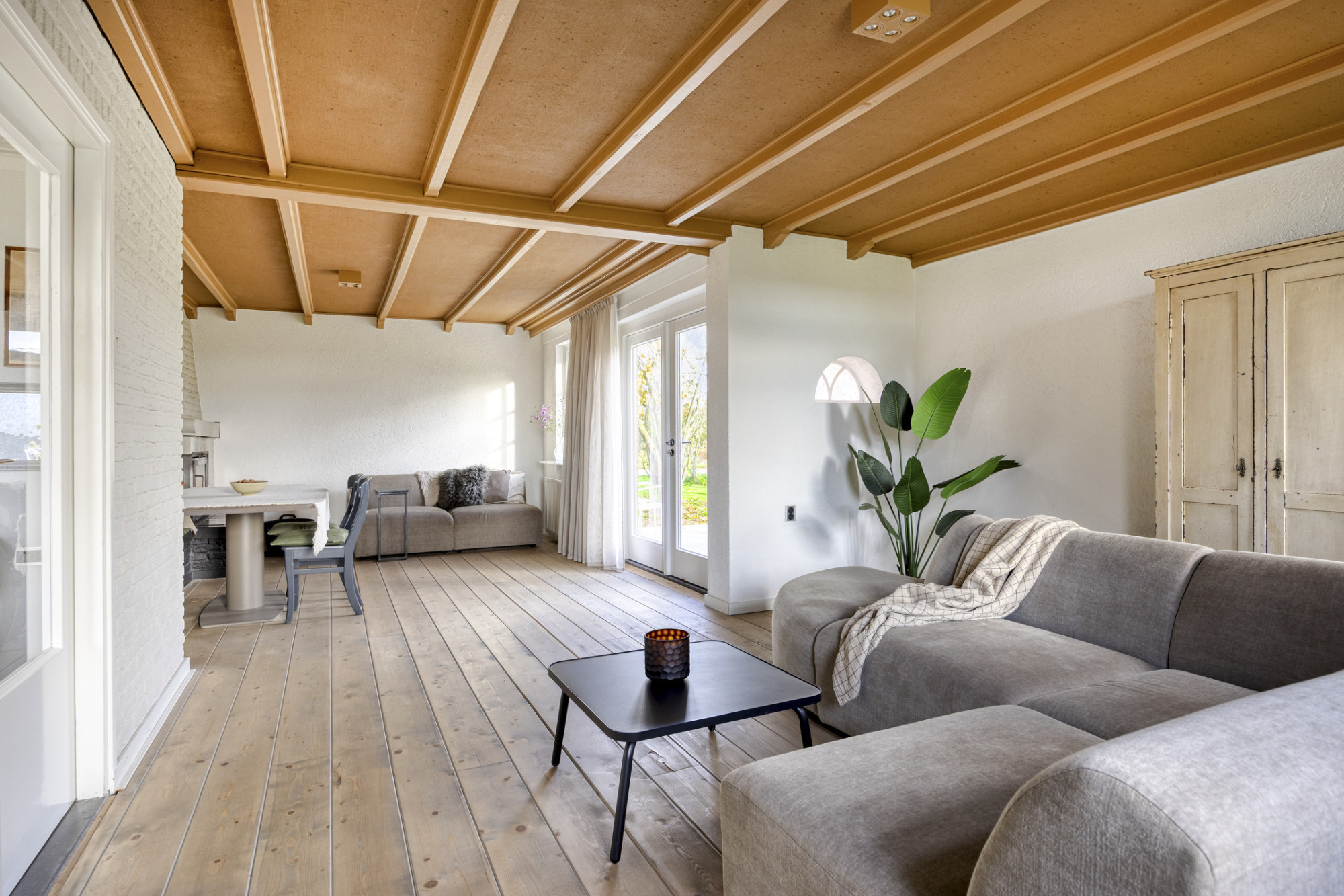 De boerderij vormt een solide en praktische basis voor wie graag verder wil moderniseren of eigen woonwensen wil realiseren. De begane grond heeft een fijne indeling met een ruime woonkamer die dankzij de grote ramen prettig daglicht binnenlaat en prachtig uitzicht over de tuin biedt. De aangrenzende keuken is eenvoudig ingericht en functioneel in gebruik, met genoeg ruimte om deze geheel naar eigen smaak te vernieuwen.