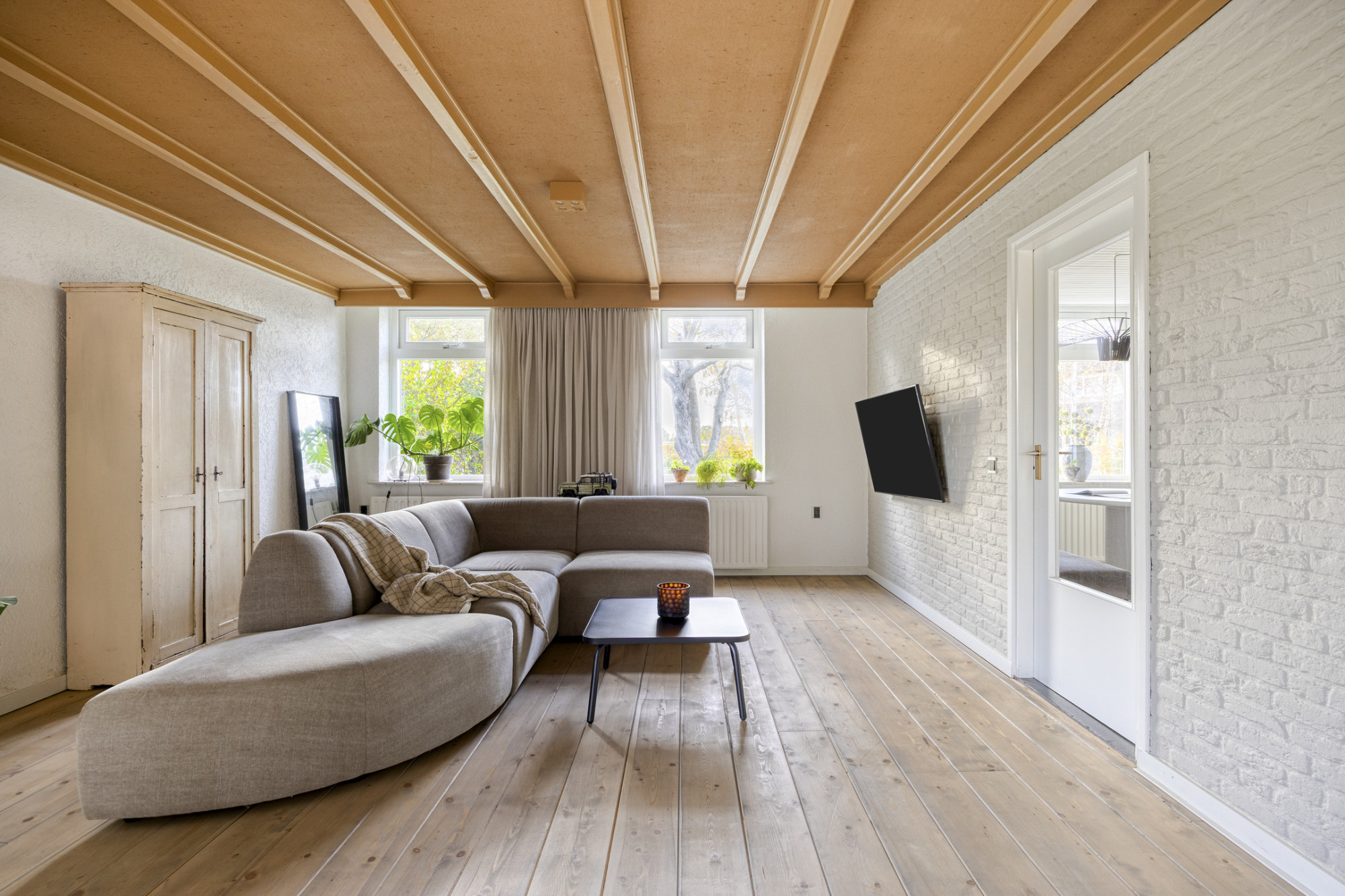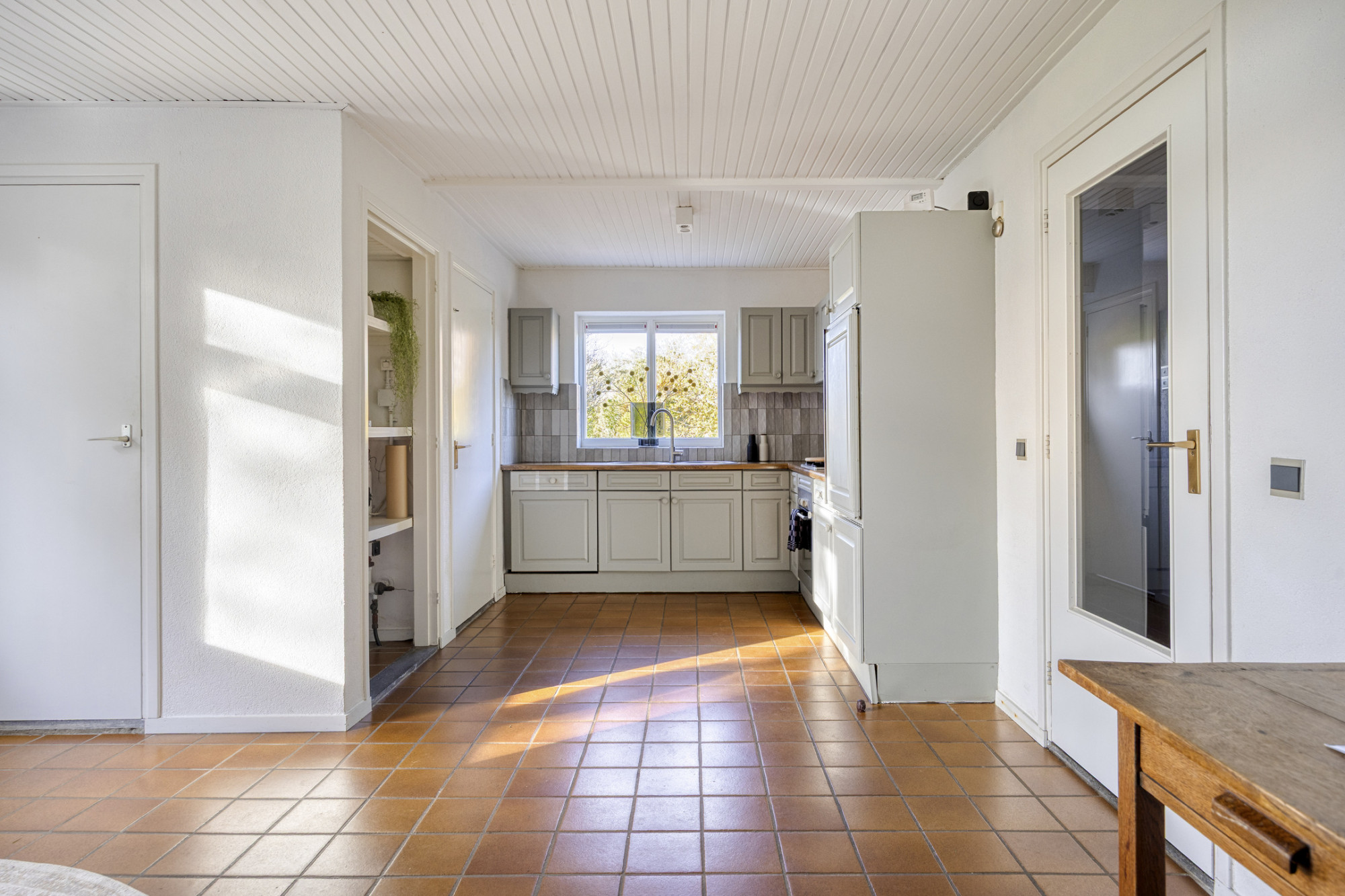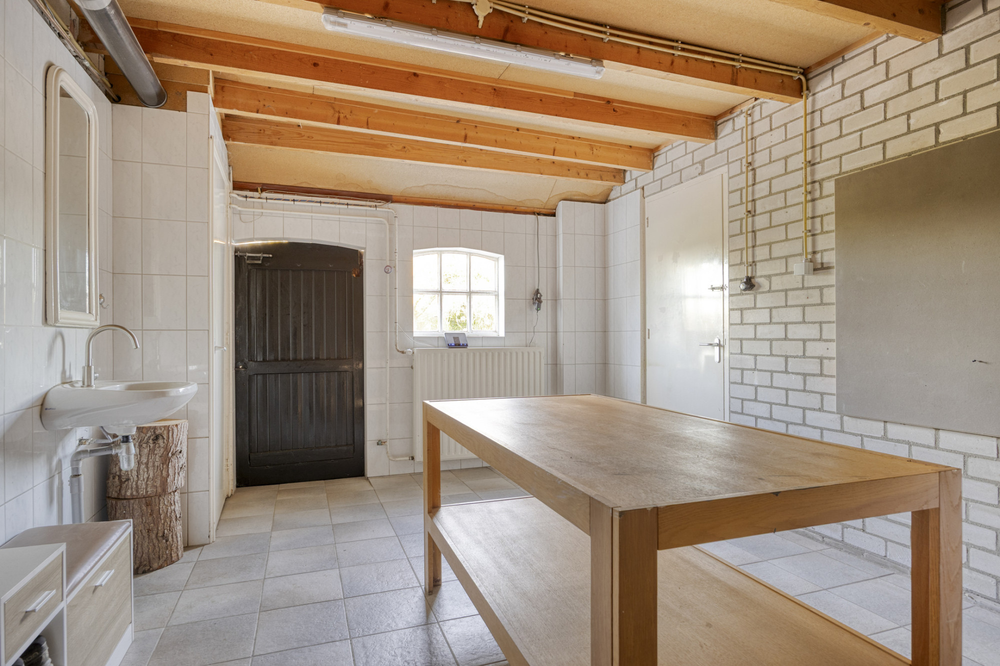 De boerderij vormt een solide en praktische basis voor wie graag verder wil moderniseren of eigen woonwensen wil realiseren. De begane grond heeft een fijne indeling met een ruime woonkamer die dankzij de grote ramen prettig daglicht binnenlaat en prachtig uitzicht over de tuin biedt. De aangrenzende keuken is eenvoudig ingericht en functioneel in gebruik, met genoeg ruimte om deze geheel naar eigen smaak te vernieuwen.