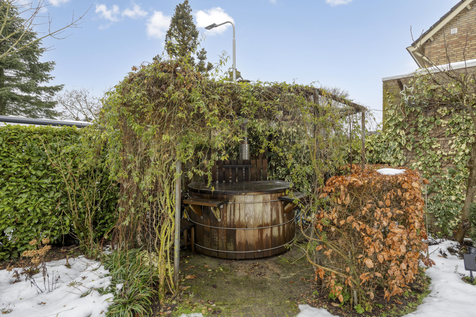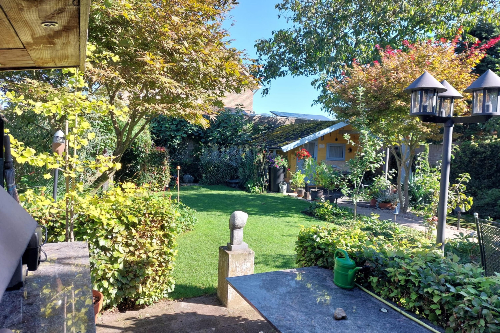De tuin is prachtig aangelegd en een heerlijke plek om buiten te zijn. Of je nu in alle rust een boek leest met zicht op de vijver of een gezellige middag organiseert met vrienden en familie, hier geniet je van het buitenleven. Het terras bij het tuinhuis ligt op het zuiden, waardoor je hier de hele dag geniet van de zon. Liever een plekje in de schaduw? Die zijn er natuurlijk ook genoeg! Daarnaast is er een praktische berging aanwezig, ideaal voor fietsen, tuingereedschap en extra opslag.