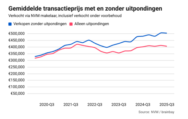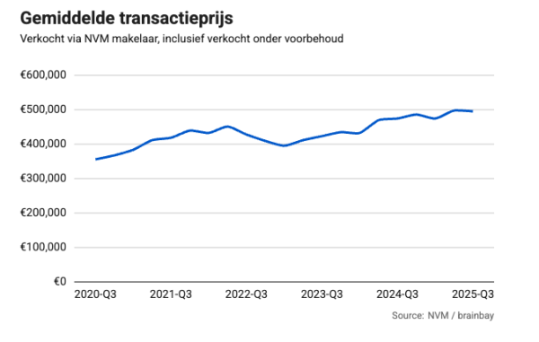 Door NVM-makelaars werden in het 3e kwartaal 2025 41.800 bestaande woningen verkocht, ruim 19% meer dan dezelfde periode vorig jaar. De zomermaanden zijn dus een goede verkoopperiode geweest. Vergeleken met een jaar eerder zijn er 25% meer appartementen verkocht. De transacties van appartementen liggen al langer hoog, mede door de verkoop van voormalige huurwoningen (uitponden). Vijf jaar geleden was 1 op de 4 verkochte woningen een appartement. Dat is nu gestegen naar 1 op de 3. Deze hogere verkoopaantallen komen niet alleen door uitpondwoningen. De prijsstijging van door NVM-makelaars verkochte woningen in het 3e kwartaal 2025 bedraagt 4,8% ten opzichte van dezelfde periode vorig jaar. De gemiddelde transactieprijs komt op 496.000 euro, vlak onder een half miljoen. Op kwartaalbasis gaat het om een kleine prijsdaling van -0,9%.