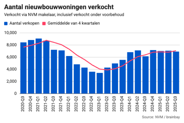 De nieuwbouwmarkt in het 3e kwartaal 2025 is stabiel. Het aantal verkochte woningen is vergelijkbaar met eerdere kwartalen. De vraag is onverminderd groot. Wel verandert de samenstelling van het aanbod: meer appartementen en minder grondgebonden woningen. In het 3e kwartaal 2025 zijn 6.950 nieuwbouwwoningen verkocht via NVM-makelaars, vergelijkbaar met eerdere kwartalen. Makelaars beoordelen de verkoopbaarheid van grondgebonden woningen met een 8,4 en van appartementen met een 7,8. Deze blijven constant hoog. Ondanks dit positieve sentiment groeien de nieuwbouwverkoopcijfers niet door het beperkte en deels niet bij de vraag van consumenten aansluitende aanbod.